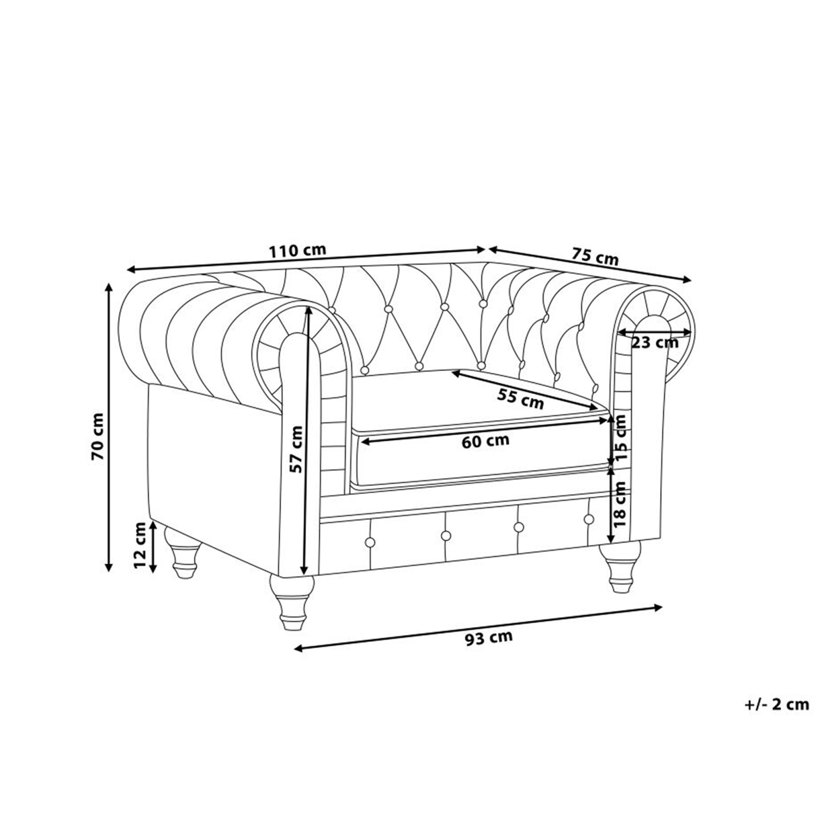 Fotoliu tapițat roz. Caracterizat de o siluetă elegantă cu brațe largi și rotunjite, acest fotoliu prezintă stilul iconic Chesterfield, potrivit pentru orice interior modern sau tradițional. Spătarul jos, împreună cu pernele de șezut groase și moi, oferă un confort excelent. Tapițat într-un material de catifea superb, de culoare roz, șezutul are un model clasic de capitonare cu nasturi în stil diamant. Această piesă clasică englezească este ușor de întreținut și se integrează perfect în orice decor. Detalii: Tip de Produs: Fotoliu. Stil: Glamour. Culoare: Roz. Nuanță: Roz piersică. Material: Țesătură. Material primar: Catifea. Material secundar: Lemn de eucalipt. Căptușeală: Spumă. Detalii material picioare: Lemn. Material scaun: Țesătură. Compoziția materialului: 100% Poliester. Stilul cotierei: Rotunjit. Cotiere: Da. Protecții pentru picioare incluse: Da. Model: Culoare solidă. Reclinabil: Nu. Structura scaunului: Arcuri ondulate. Densitatea pernei scaunului: 24 kg/m3. Dimensiuni: Înălțimea cotierei: 70 cm. Adâncime: 75 cm. Grosimea scaunului: 15 cm. Înălțimea scaunului: 45 cm. Lățime: 110 cm. Înălțime: 70 cm. Suprafața de ședere: 60x55 cm. Greutate: 29 kg. Capacitatea de greutate: 120 kg. Oferta incude: 1 x Fotoliu. Caracteristici cheie: Scaun gros pentru confort maxim, O completare excelentă pentru orice interior de casă, Decorată cu un tuft cu buton, Materiale de cea mai bună calitate, Execuție robustă, Tapițată complet. Asamblare: Picioare neasamblate.5-15 min. Informații suplimentare: Pentru o stabilitate și siguranță maximă în utilizare, se recomandă să verificați la aproximativ 2 săptămâni după instalare dacă produsul a fost asamblat corect. De asemenea, se recomandă să verificați dacă șuruburile sunt strânse corect, o dată la 3 luni. Rețineți că țesătura de catifea poate avea un aspect puțin diferit atunci când este expusă la lumină; tinde să fie mai strălucitoare și mai luminoasă în lumina soarelui, în timp ce în lumină artificială are un ton diferit, mai închis. Datorită tipului de țesătură, tonul catifelei poate varia, de asemenea, atunci când este atinsă din direcții diferite. Pentru a uniformiza culoarea și a scăpa de lovituri și cute, materialul trebuie mângâiat cu palma deschisă într-o singură direcție, frecat cu o cârpă umedă sau călcat cu abur. Sfaturi de întreținere: Catifea: 1.Aspirati folosind un accesoriu potrivit. 2.Vă rugăm să curățați cu un șampon uscat și un burete umed sau cu un detergent ușor. Lemn de eucalipt: 1.Ștergeți imediat după curățare pentru a preveni acumularea apei pe produs. 2.Curățați cu un detergent delicat și o cârpă moale, urmând direcția fibrelor. 3.Pentru a păstra mobila finisată cu ulei în stare bună, este necesar să o ungeți cu ulei după un timp.