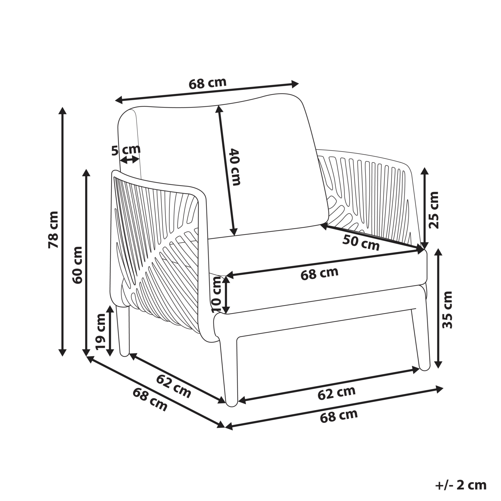 Fotoliu cu cotiere pentru exterior. Bucură-te de momentele tale de relaxare cu acest fotoliu de grădină minimalist, prevăzut cu cotiere practice și perne groase pentru un confort sporit. Deși este conceput pentru exterior, se potrivește perfect și în spațiile interioare, îmbinând stilul cu funcționalitatea. Construcția ușoară permite mutarea cu ușurință, iar husele detașabile ale pernelor asigură o curățare rapidă. Durabil și ușor de întreținut, acesta este alegerea ideală pentru diverse tipuri de amenajări. Detalii: Tip de Produs: Fotoliu. Stil: Minimalist. Culoare: Bej. Nuanță: Bej deschis. Material: Material sintetic. Material primar: Polipropilenă. Material secundar: Țesătură. Detalii material picioare: Material sintetic. Compoziția materialului: 100% Poliester. Cotiere: Da. Pliabil: Nu. Stivuire: Nu. Dimensiuni: Înălțimea cotierei: 60 cm. Adâncime: 68 cm. Grosimea scaunului: 10 cm. Înălțimea scaunului: 35 cm. Lățime: 68 cm. Înălțime: 78 cm. Suprafața de ședere: 68x50 cm. Greutate: 8 kg. Capacitatea de greutate: 120 kg. Oferta incude: 1 x Fotoliu. Caracteristici cheie: Scaun jos și adânc, Ideal pentru grădini sau spații exterioare cu un aer modern, Rezistență UV, Huse detașabile, Capace pentru picioare pentru protecția suprafeței, Ușor de mutat. Asamblare: Necesită asamblare parțială.5-15 min. Descriere: Rezistența ușoară la apă permite utilizarea produsului în exterior și lăsarea acestuia în condiții de ploaie ușoare sau umezeală. În orice caz, produsul trebuie depozitat în interior atunci când nu este utilizat, fiind recomandată o husă. Expunerea produsului la umezeală prelungită poate provoca deteriorări. Rezistență: Umezeală ușoară. Sfaturi de întreținere: Polipropilenă: 1.Curățați cu o soluție de curățare pe bază de săpun și o cârpă moale. 2.Păstrați departe de surse de căldură, cum ar fi zonele de grătar sau foc de tabără, deoarece scânteile pot provoca daune majore. Nu așezați ustensile fierbinți direct pe suprafață. 3.Materialul rezistă la expunerea moderată la condițiile meteo. În extra-sezon, folosiți o husă de protecție sau depozitați mobilierul în interior. Țesătură: 1.Spălați manual sau selectați programul de spălare pentru lână (30 °C), cu excepția cazului în care producătorul recomandă altfel. Spălați pe fața materialului, cu fermoarul închis. 2.Nu se usucă la mașina de uscat și nu se calcă. 3.Când nu este utilizat, depozitați-l într-un loc curat și uscat pentru a-l proteja de condițiile atmosferice.
