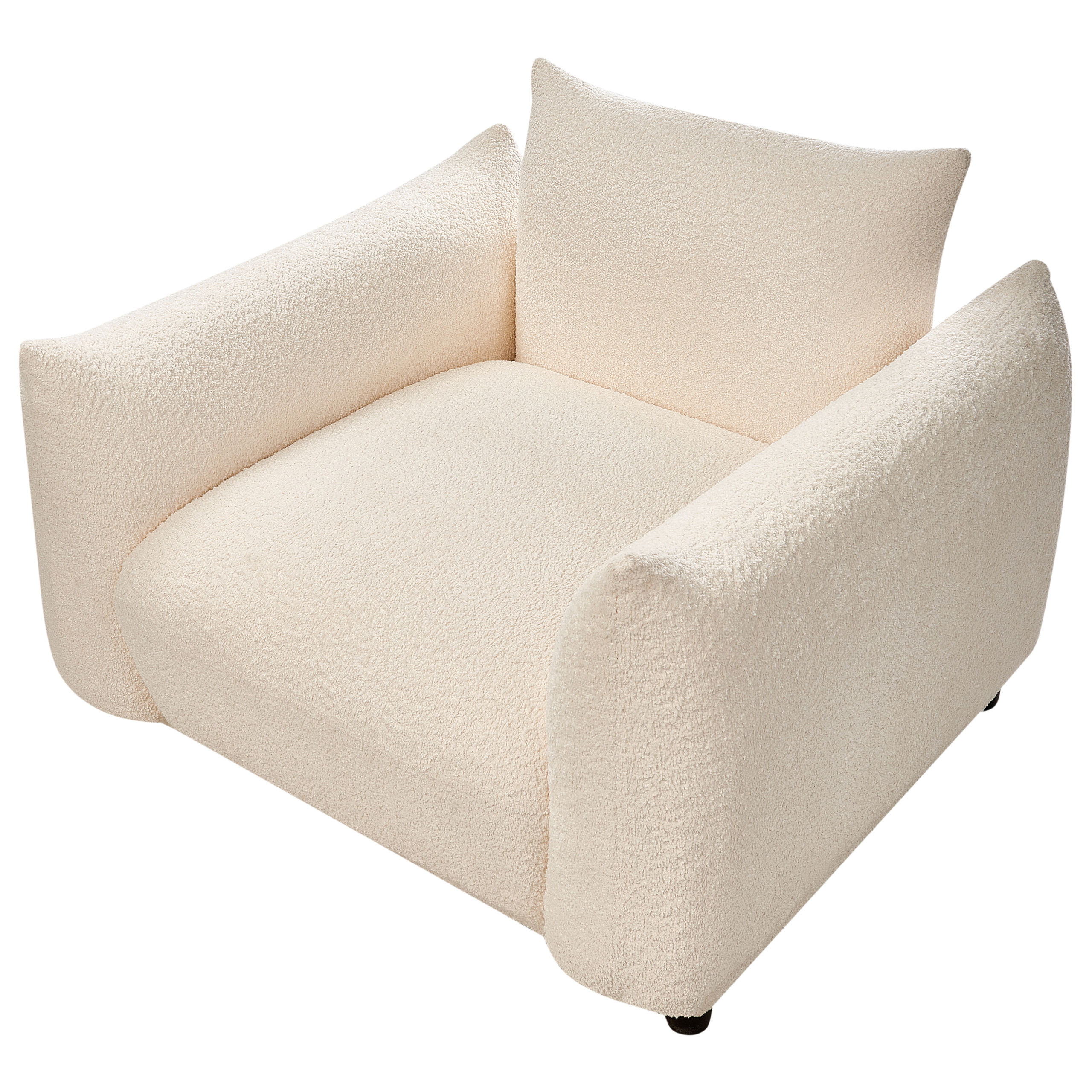 Fotoliu confortabil. Adaugă confort și eleganță în casa ta cu acest fotoliu tapițat cu material boucle. Designul său modern, cu șezutul jos și picioare scurte, se potrivește perfect în interioarele de inspirație clasică sau Japandi. Tapițeria moale, cu textura buclată, acoperă întreaga suprafață, iar brațele delicat umplute oferă un confort excelent. Ideal pentru a crea un colț de relaxare în living sau un loc primitor în dormitor, acest fotoliu adaugă o notă de rafinament oricărui spațiu. Detalii: Tip de Produs: Fotoliu. Stil: Retro. Culoare: Alb. Nuanță: Alb-murdar. Material: Țesătură. Material primar: Boucle. Material secundar: Material sintetic. Căptușeală: Spumă. Detalii material picioare: Material sintetic. Material scaun: Țesătură. Compoziția materialului: 100% Poliester. Stilul cotierei: Căptușit. Cotiere: Da. Protecții pentru picioare incluse: Nu. Model: Culoare solidă. Reclinabil: Nu. Structura scaunului: Lemn. Densitatea pernei scaunului: 28 kg/m3. Dimensiuni: Înălțimea cotierei: 56 cm. Adâncime: 86 cm. Înălțimea scaunului: 40 cm. Lățime: 96 cm. Înălțime: 72 cm. Suprafața de ședere: 56x62 cm. Greutate: 27 kg. Capacitatea de greutate: 180 kg. Oferta incude: 1 x Fotoliu, 1 x Pernă decorativă. Caracteristici cheie: Un loc excelent pentru relaxare, Adaugă o notă de eleganță oricărui interior, Adaugă o notă de stil în orice cameră, Ideal atât pentru dormitor, cât și pentru camera de zi, Construcție robustă. Asamblare: Necesită asamblare parțială.5-15 min. Informații suplimentare: Pentru o stabilitate și siguranță maximă în utilizare, se recomandă să verificați la aproximativ 2 săptămâni după instalare dacă produsul a fost asamblat corect. De asemenea, se recomandă să verificați dacă șuruburile sunt strânse corect, o dată la 3 luni. Sfaturi de întreținere: Boucle: 1.Aspirati folosind un accesoriu potrivit. 2.Vă rugăm să curățați cu un șampon uscat și un burete umed sau cu un detergent ușor. Material sintetic: 1.Curățați cu un detergent delicat și o cârpă moale, apoi ștergeți bine.