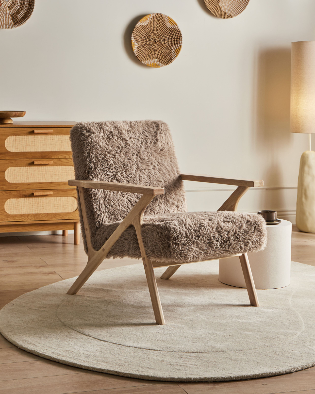 Fotoliu tapițat retro. Acest fotoliu retro combină confortul cu stilul, aducând căldură și personalitate casei tale. Cadrul din lemn natural și șezutul tapițat oferă un farmec rustic și relaxare completă, transformând orice spațiu într-un colț de poveste. Ideal pentru momente de răsfăț sau pentru a impresiona oaspeții. Detalii: Tip de Produs: Fotoliu. Stil: Retro. Culoare: Bej. Nuanță: Taupe. Material: Țesătură. Material primar: Blană ecologică. Material secundar: Placaj. Căptușeală: Spumă. Detalii material picioare: Lemn. Material scaun: Blană ecologică. Compoziția materialului: 100% Poliester. Stilul cotierei: Liniar. Cotiere: Da. Protecții pentru picioare incluse: Da. Model: Culoare solidă. Reclinabil: Nu. Structura scaunului: Arcuri ondulate. Densitatea pernei scaunului: 24 kg/m3. Dimensiuni: Înălțimea cotierei: 60 cm. Adâncime: 80 cm. Grosimea scaunului: 15 cm. Înălțimea scaunului: 47 cm. Lățime: 74 cm. Înălțime: 84 cm. Suprafața de ședere: 58X56 cm. Greutate: 13 kg. Capacitatea de greutate: 150 kg. Oferta incude: 1 x Fotoliu. Caracteristici cheie: Scaun gros pentru confort maxim, Stil retro, Materiale de cea mai bună calitate, Construcție robustă, Capace pentru picioare pentru protecția suprafeței. Asamblare: Necesită asamblare completă.5-15 min. Informații suplimentare: Pentru o stabilitate și siguranță maximă în utilizare, se recomandă să verificați la aproximativ 2 săptămâni după instalare dacă produsul a fost asamblat corect. De asemenea, se recomandă să verificați dacă șuruburile sunt strânse corect, o dată la 3 luni. Sfaturi de întreținere: Blană ecologică: 1.Vă rugăm să curățați cu un șampon uscat și un burete umed sau cu un detergent ușor. 2.Aspirati folosind un accesoriu potrivit. Lemn de cauciuc: 1.Curățați cu un detergent delicat și o cârpă moale, urmând direcția fibrelor. 2.Pentru a păstra mobila finisată cu ulei în stare bună, este necesar să o ungeți cu ulei după un timp. 3.Ștergeți imediat după curățare pentru a preveni acumularea apei pe produs.