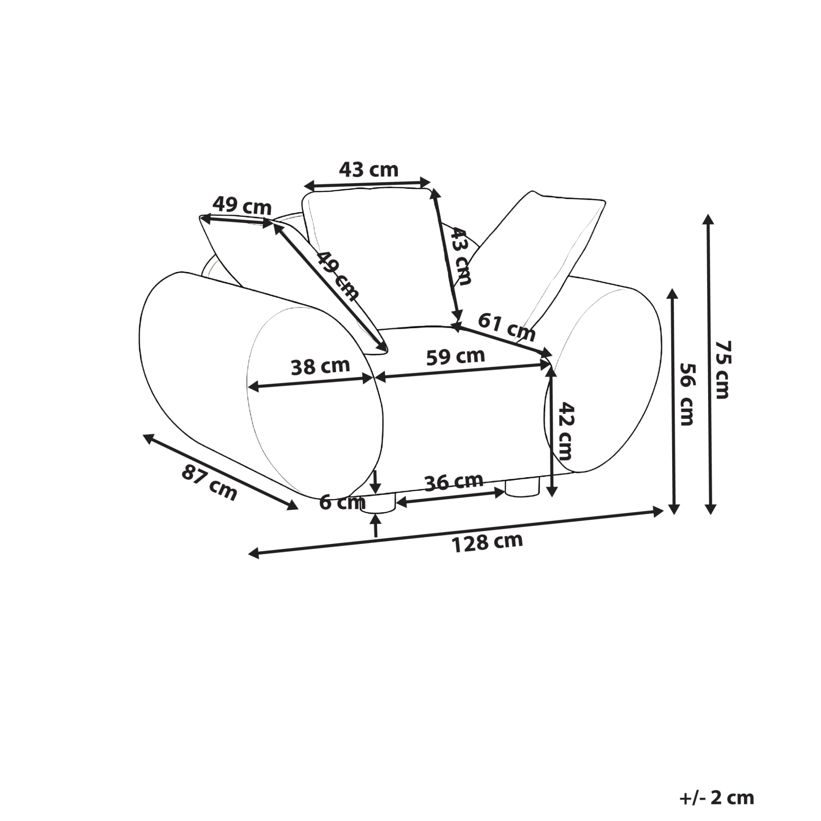 Fotoliu tapițat cu perne incluse. Acest fotoliu elegant combină perfect confortul și stilul, fiind ideal pentru spațiile moderne de locuit. Tapițat cu material moale și echipat cu perne pufoase, oferă o experiență de relaxare plăcută. Pernele suplimentare au huse detașabile, astfel încât să poți reîmprospăta aspectul ori de câte ori dorești. Detalii: Tip de Produs: Fotoliu. Stil: Modern. Culoare: Bej. Nuanță: Bej deschis. Material: Țesătură. Material primar: Țesătură. Material secundar: Lemn de eucalipt. Căptușeală: Spumă. Material scaun: Țesătură. Compoziția materialului: 100% Poliester. Stilul cotierei: Curbat. Cotiere: Da. Protecții pentru picioare incluse: Nu. Model: Culoare solidă. Reclinabil: Nu. Structura scaunului: Arcuri ondulate. Densitatea pernei scaunului: 28 kg/m3. Dimensiuni: Înălțimea cotierei: 56 cm. Adâncime: 87 cm. Grosimea scaunului: 36 cm. Înălțimea scaunului: 42 cm. Lățime: 128 cm. Înălțime: 75 cm. Suprafața de ședere: 59x61 cm. Greutate: 36 kg. Capacitatea de greutate: 150 kg. Oferta incude: 1 x Fotoliu, Perne incluse. Caracteristici cheie: Scaun gros pentru confort maxim, Design mereu actualizat, Potrivit pentru orice stil de decor interior, Materiale de cea mai bună calitate, Materiale ușor de întreținut și durabile. Asamblare: Necesită asamblare parțială.5-15 min. Sfaturi de întreținere: Țesătură: 1.Aspirati folosind un accesoriu potrivit. 2.Vă rugăm să curățați cu un șampon uscat și un burete umed sau cu un detergent ușor. Lemn de cauciuc: 1.Ștergeți imediat după curățare pentru a preveni acumularea apei pe produs. 2.Curățați cu un detergent delicat și o cârpă moale, urmând direcția fibrelor. 3.Pentru a păstra mobila finisată cu ulei în stare bună, este necesar să o ungeți cu ulei după un timp.