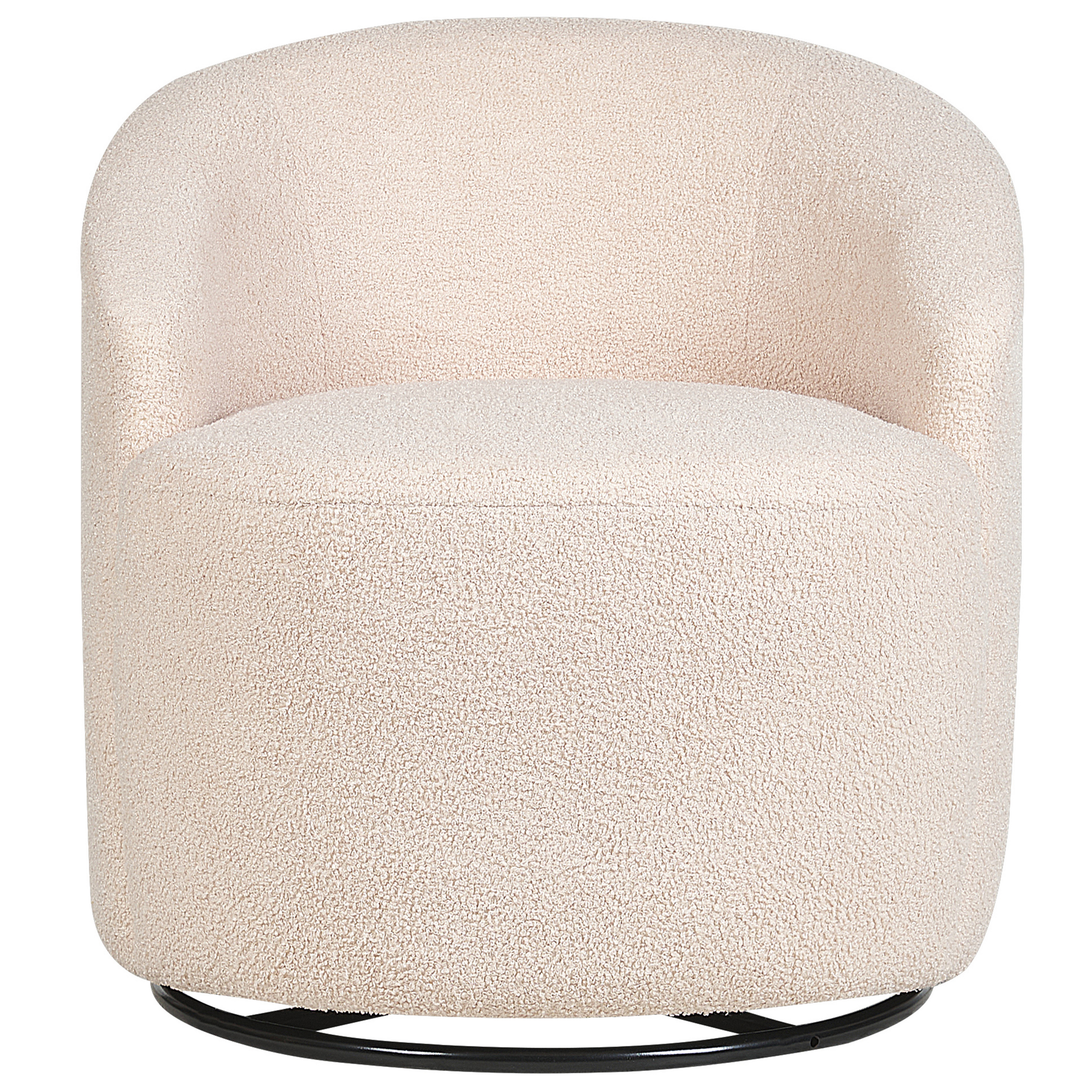 Fotoliu pivotant elegant. Adaugă un plus de eleganță și confort livingului tău cu acest fotoliu deosebit, care va transforma orice colț al casei într-un loc perfect pentru relaxare. Tapițat cu țesătură boucle de calitate superioară, extrem de moale și plăcută la atingere, te va învălui într-o senzație de confort desăvârșit. Datorită bazei pivotante negre, te vei bucura de libertatea de a-l roti cu ușurință, adaptându-l oricărei poziții. Spătarul ușor curbat și cotierele fine completează designul retro, oferindu-i un aspect care atrage privirile. Detalii: Tip de Produs: Fotoliu. Stil: Retro. Culoare: Bej. Material: Țesătură. Material primar: Boucle. Material secundar: Lemn de eucalipt. Căptușeală: Spumă. Detalii material picioare: Lemn. Material scaun: Țesătură. Compoziția materialului: 100% Poliester. Stilul cotierei: Integrat. Cotiere: Da. Protecții pentru picioare incluse: Da. Model: Culoare solidă. Reclinabil: Nu. Structura scaunului: Arcuri ondulate. Densitatea pernei scaunului: 25 kg/m3. Dimensiuni: Înălțimea cotierei: 49 cm. Adâncime: 63 cm. Grosimea scaunului: 42 cm. Înălțimea scaunului: 42 cm. Lățime: 62 cm. Înălțime: 67 cm. Suprafața de ședere: 59x52 cm. Greutate: 13 kg. Capacitatea de greutate: 150 kg. Oferta incude: 1 x Fotoliu. Caracteristici cheie: Rotire de 360°, Incredibil de moale, Un loc excelent pentru relaxare, Stil retro, Materiale de cea mai bună calitate. Asamblare: Nu necesită asamblare. Sfaturi de întreținere: Boucle: 1.Aspirati folosind un accesoriu potrivit. 2.Vă rugăm să curățați cu un șampon uscat și un burete umed sau cu un detergent ușor.