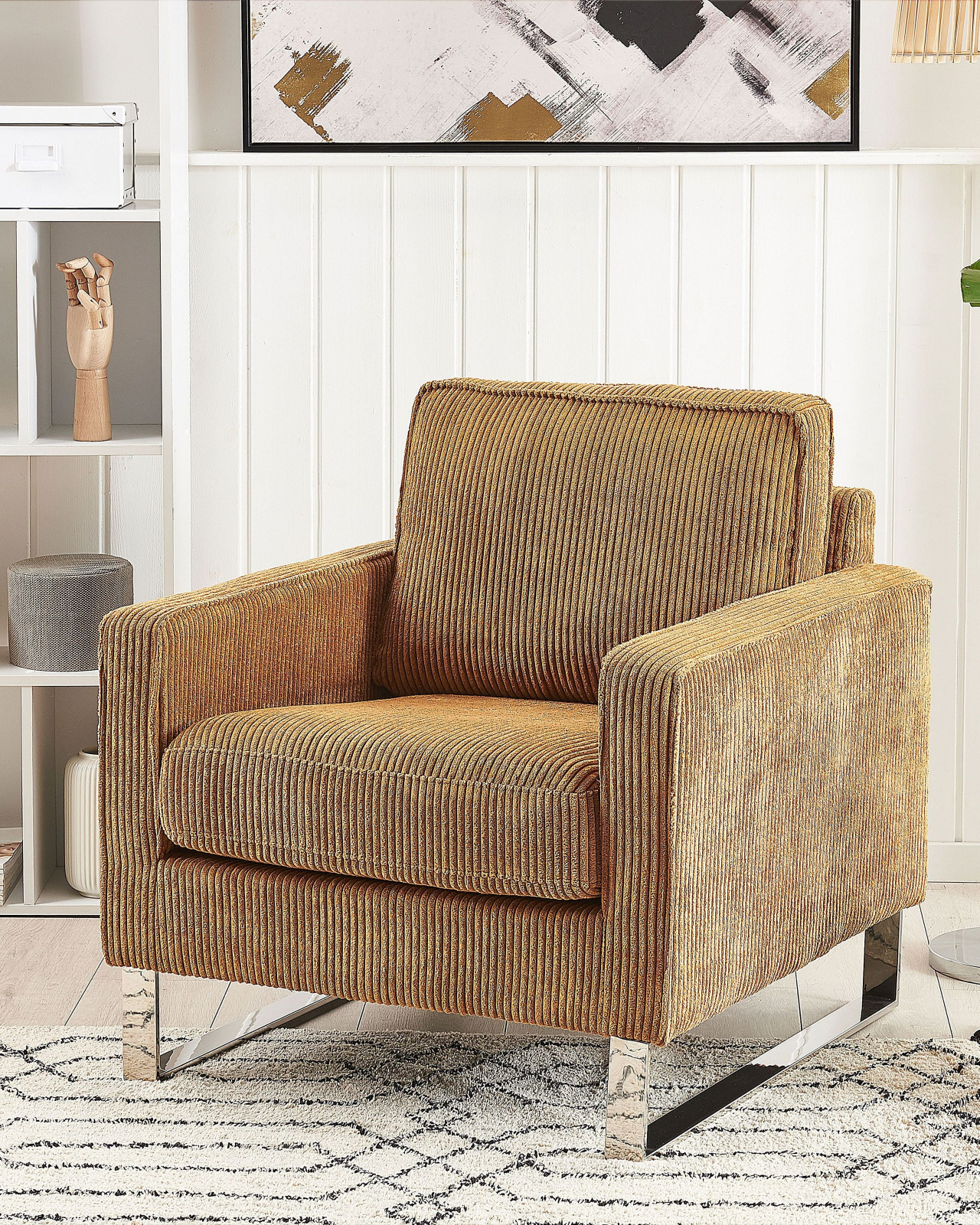 Fotoliu modern din velur cu cotiere. Acest fotoliu cu cotiere impresionează prin cadrul său robust, susținut de picioare din oțel inoxidabil, care garantează stabilitate și rezistență pe termen lung. Tapițat cu velur fin, scaunul adaugă o notă de unicitate și eleganță, fiind o alegere ideală pentru interioarele cu influențe retro. Designul său minimalist și rafinat îl face perfect pentru orice living sau dormitor, oferind un confort exceptional atât pentru momentele tale de relaxare, cât și pentru primirea oaspeților. Detalii: Tip de Produs: Fotoliu. Stil: Retro. Culoare: Maro. Nuanță: Maro deschis. Material: Țesătură. Material primar: Velur. Material secundar: Oțel inoxidabil. Căptușeală: Spumă. Detalii material picioare: Metal. Material scaun: Țesătură. Compoziția materialului: 75% Poliester. Stilul cotierei: Liniar. Cotiere: Da. Protecții pentru picioare incluse: Nu. Model: Culoare solidă. Reclinabil: Nu. Structura scaunului: Arcuri ondulate. Densitatea pernei scaunului: 24 kg/m3. Dimensiuni: Înălțimea cotierei: 62 cm. Adâncime: 85 cm. Grosimea scaunului: 11 cm. Înălțimea scaunului: 44 cm. Lățime: 79 cm. Înălțime: 82 cm. Suprafața de ședere: 60x48 cm. Greutate: 23 kg. Capacitatea de greutate: 200 kg. Oferta incude: 1 x Fotoliu. Caracteristici cheie: Confort maxim la șezut, Se integrează practic cu orice stil de amenajare, Design tradițional cu o notă modernă, Tapițerie din țesătură de înaltă calitate, Huse detașabile. Asamblare: Necesită asamblare parțială.20-40 min. Informații suplimentare: Pentru o stabilitate și siguranță maximă în utilizare, se recomandă să verificați la aproximativ 2 săptămâni după instalare dacă produsul a fost asamblat corect. De asemenea, se recomandă să verificați dacă șuruburile sunt strânse corect, o dată la 3 luni. Vă rugăm să rețineți că țesătura din catifea poate avea un aspect mai mult sau mai puțin strălucitor, în funcție de expunerea la lumină (naturală în timpul zilei sau artificială seara). Sfaturi de întreținere: Velur: 1.Nu se usucă la mașina de uscat și nu se calcă. 2.Spălați manual, folosind doar apă rece și un detergent delicat. Oțel inoxidabil: 1.Pentru elementele din cupru sau crom, folosiți un agent de lustruire. 2.Pentru a evita zgârieturile, nu folosiți produse de curățare abrazive. 3.Curățați cu un detergent delicat și o cârpă moale, apoi ștergeți bine.