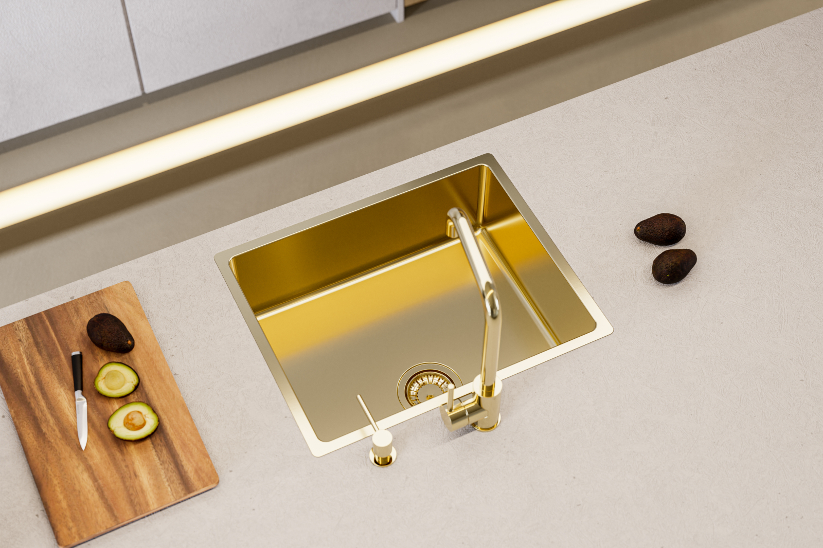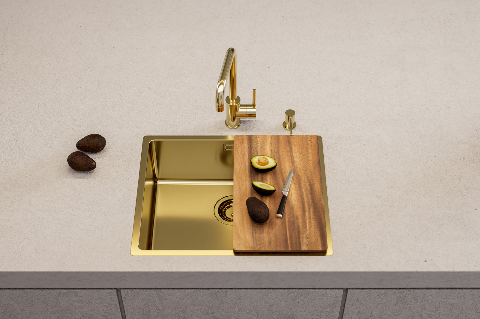 Chiuveta Monarch Alveus  Kombino 50        Alveus Kombino 50     este o chiuveta de bucatarie realizata din material inox, finisaj  Monarch . Este formata dintr-o cuva spatioasa, fara picurator avand dimensiunea totala de 54  x 44  cm.  Acest model de chiuveta Alveus este conceput pentru montajul pe blat  sau la nivelul blatului, fiind parte continua a suprafetei de lucru.  Culori disponibile: AURIU, CUPRU, ANTRACIT si BRONZ  ce ofera un contrast placut bucatariei dumneavoastra.  Chiuveta  Kombino 50   are o forma patrata, cu dimensiunea cuvei de 50 x 40  x 19.5  cm , potrivita  pentru spalarea vaselor de orice dimensiune. Aceasta chiuveta este confectionata din inox. Datorita procesarii atente a materialului, suprafata chiuvetei de bucatarie este neteda, placuta la atingere si permite o curatare usoara. In plus, ii ofera si alte avantaje, cum ar fi: rezistenta la temperaturi inalte, la utilizare intensa, rezistenta maxima la socuri termice si mecanice  si nu se zgarie.  Chiuveta vine insotita cu urmatoarele accesorii:    sifon;  ventil de 3 1 2  ;  sistem de prindere.