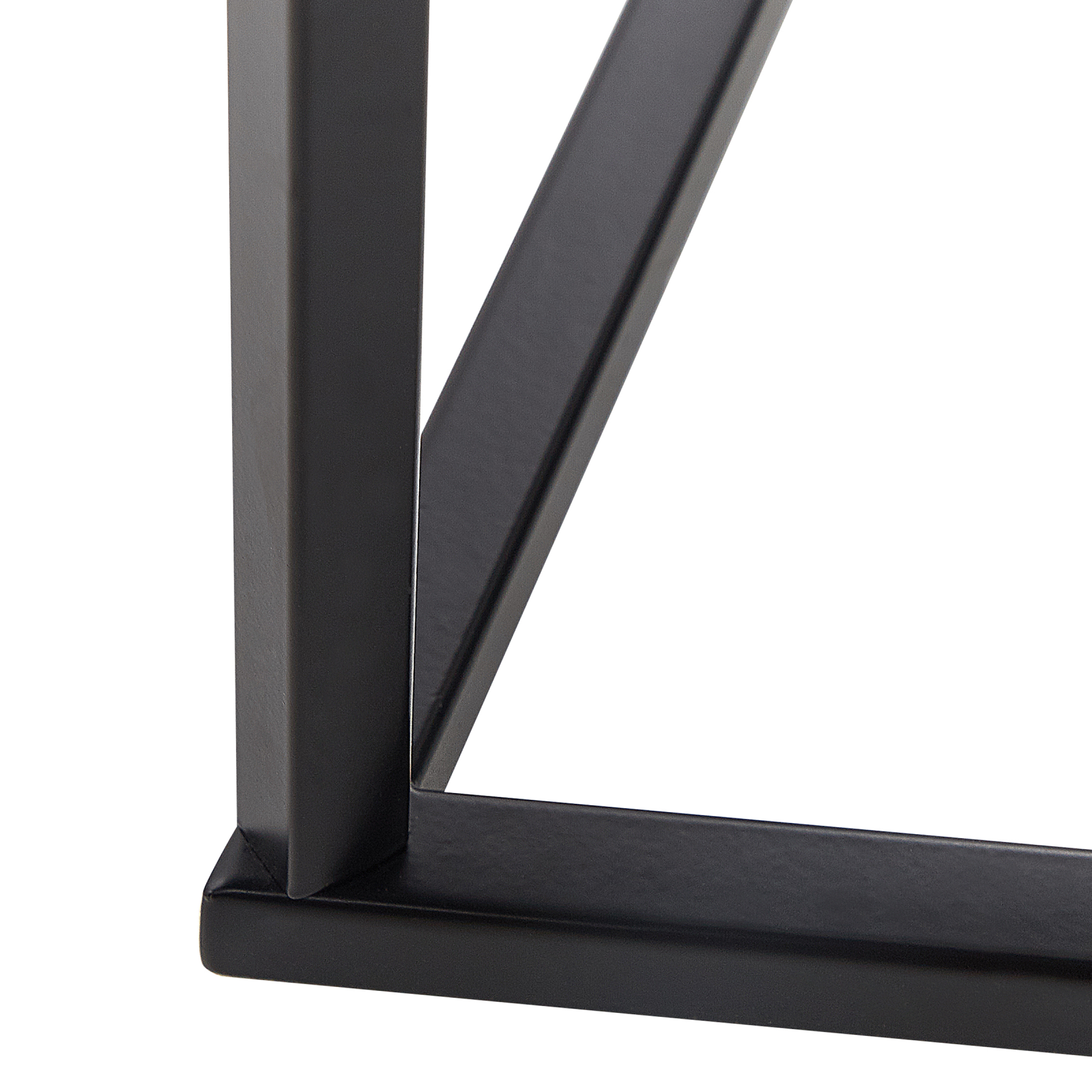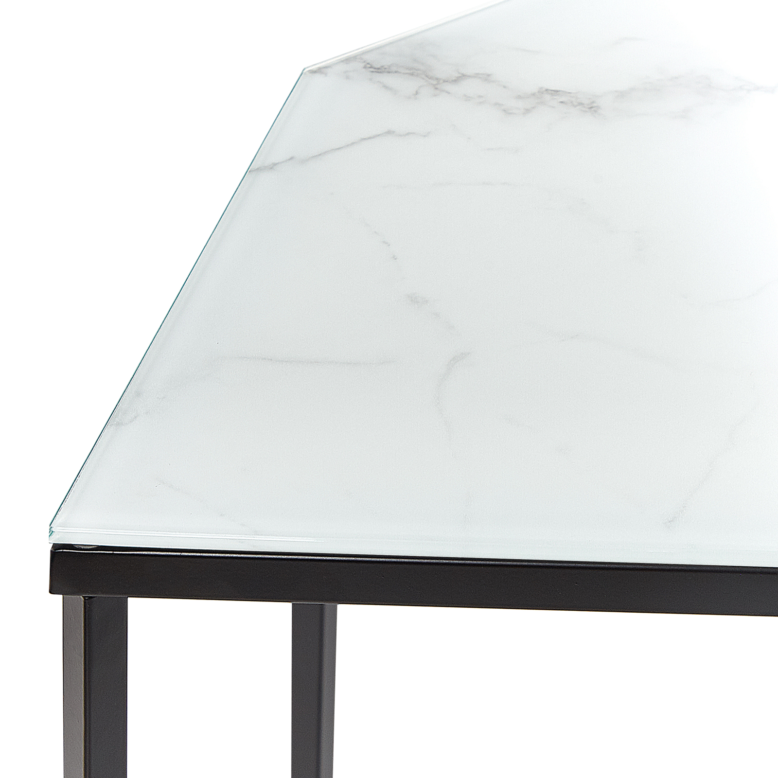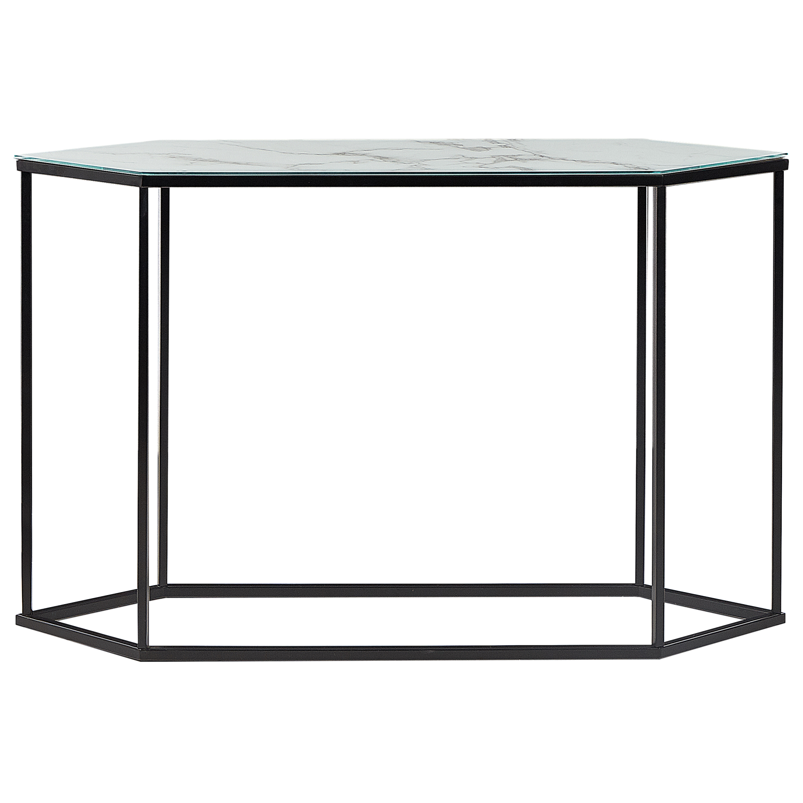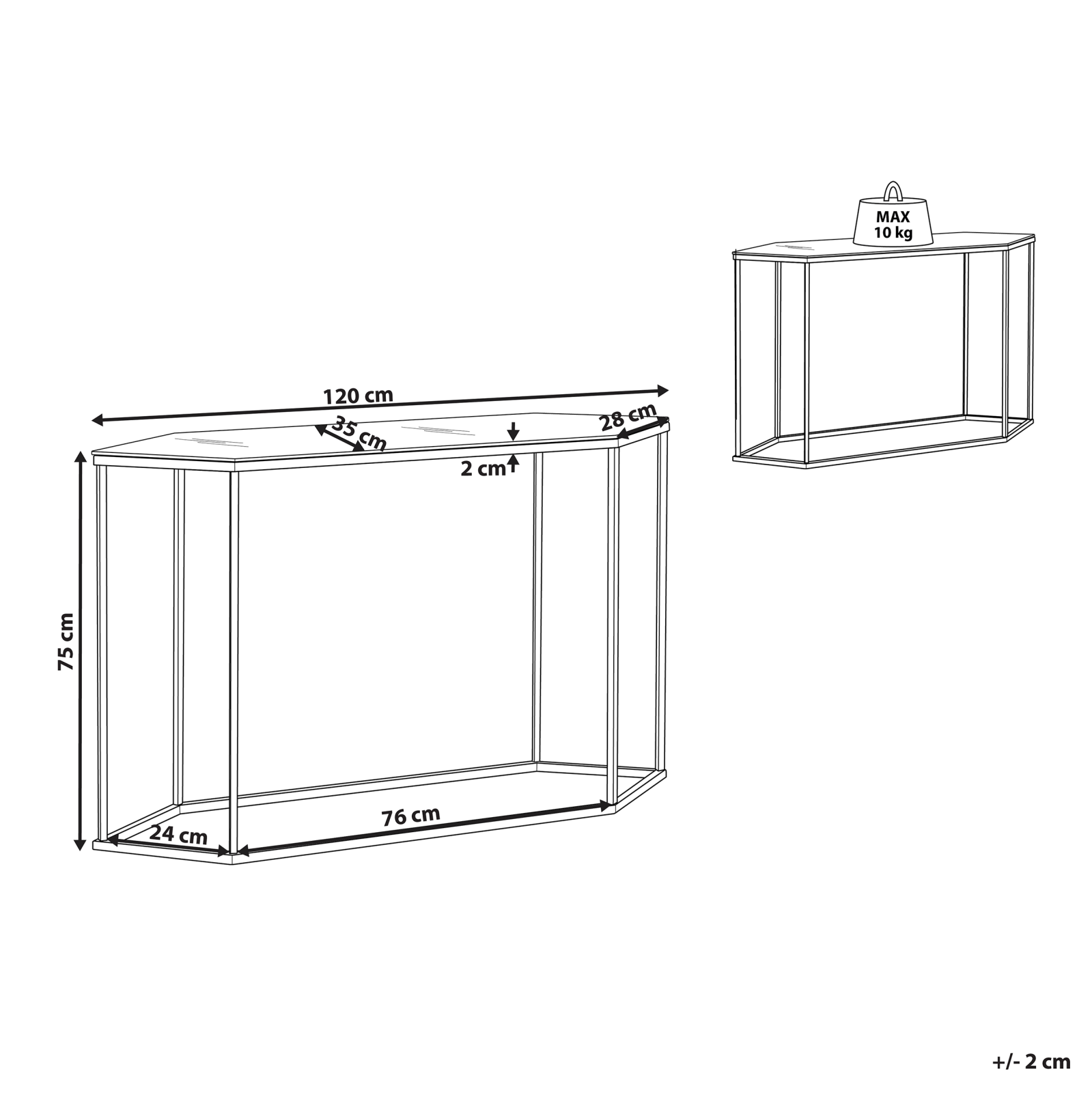 Consolă elegantă de decor. Adu o notă de glamour cu această masă consolă cu design geometric unic, perfectă pentru sufragerie, dormitor sau hol. Blatul din sticlă securizată, laminat cu folie PVC cu efect de marmură, adaugă eleganță. Baza vopsită electrostatic, de culoare neagră, completează perfect blatul. Detalii: Tip de Produs: Masă consolă. Stil: Modern. Culoare: Alb. Material: Metal. Material primar: Sticlă securizată. Material secundar: Oțel. Materialul cadrului: Metal. Detalii material picioare: Metal. Materialul suprafeței mesei: Sticlă. Sertare: Nu. Finisaj: Acoperire pulverizată. Protecții pentru picioare incluse: Da. Rafturi: Nu. Dimensiuni: Adâncime: 35 cm. Lățime: 120 cm. Înălțime: 75 cm. Greutate: 11 kg. Capacitatea maximă: 10 kg. Oferta incude: 1 x Masă tip consolă. Caracteristici cheie: Potrivit pentru orice stil de decor interior, Efect de marmură modernă, Construcție solidă și stabilă, Materiale de cea mai bună calitate, Capace pentru picioare pentru protecția suprafeței. Asamblare: Necesită asamblare completă.20-40 min. Sfaturi de întreținere: Sticlă securizată: 1.Curățați-l cu un detergent delicat sau cu un detergent pentru sticlă, folosind o cârpă moale. Uscați imediat după curățare. 2.Pentru a evita zgârieturile, nu folosiți creme de curățare. Oțel: 1.Curățați cu un detergent delicat și o cârpă moale, apoi ștergeți bine. 2.Pentru a evita zgârieturile, nu folosiți produse de curățare abrazive. 3.Pentru elementele din cupru sau crom, folosiți un agent de lustruire.