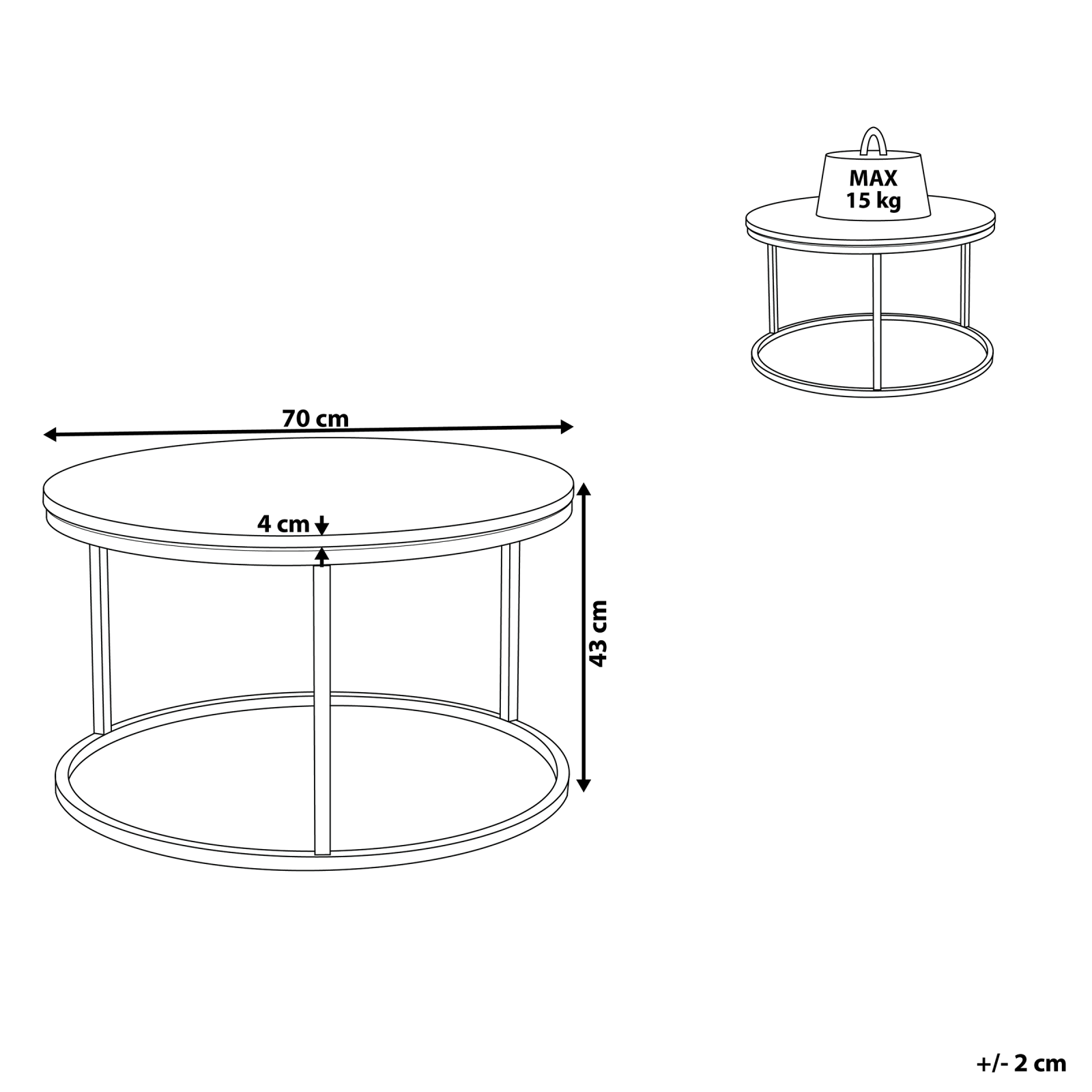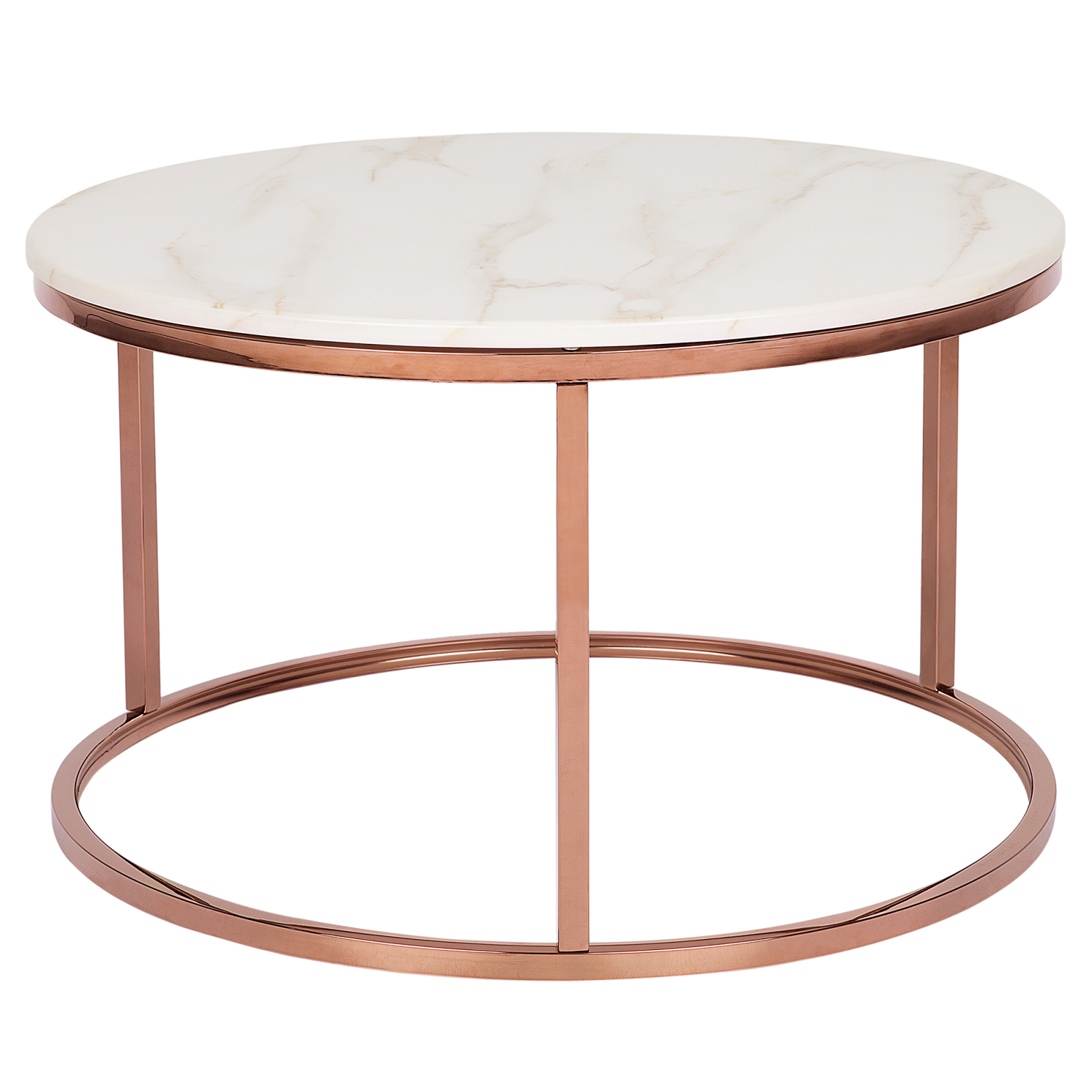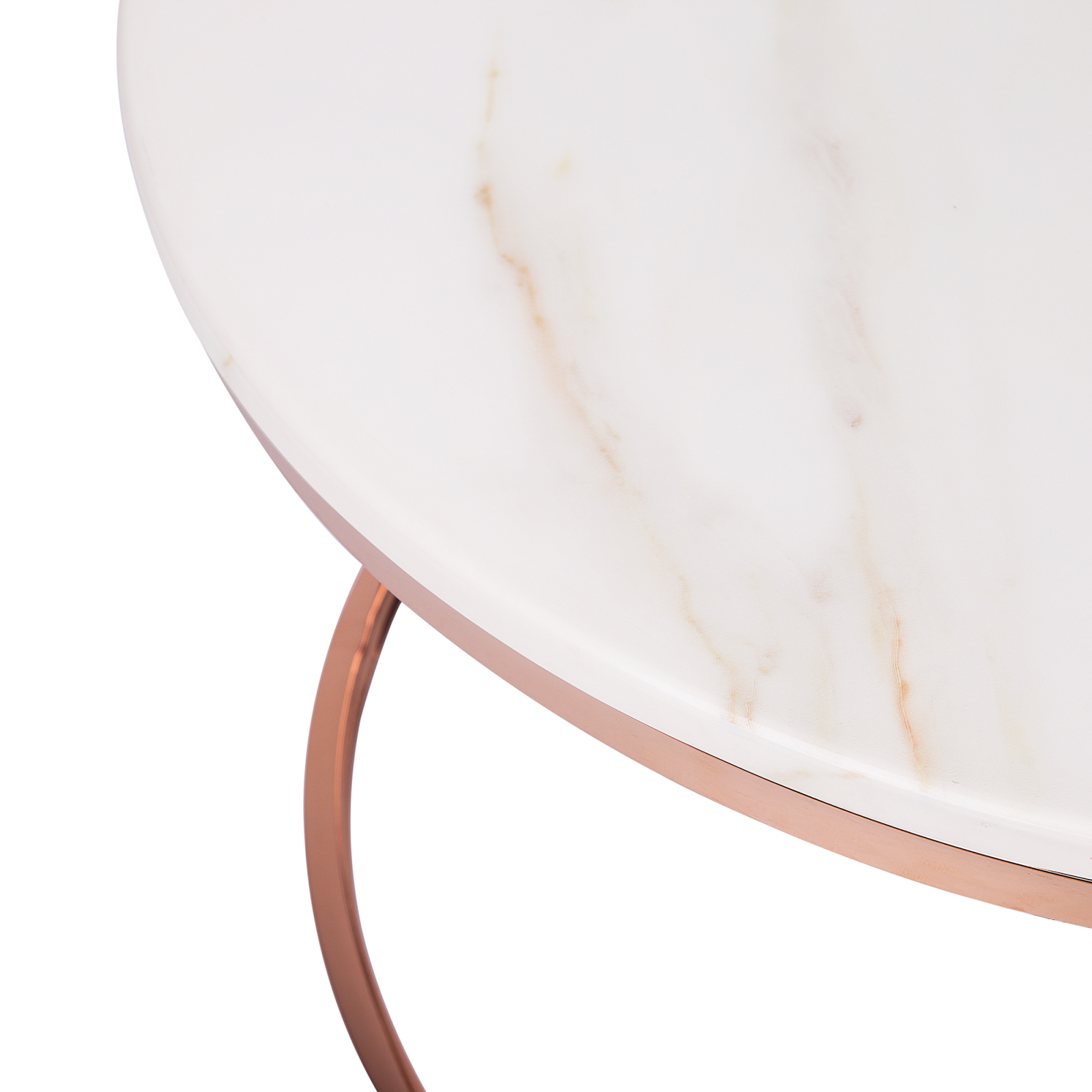 Măsuță de cafea cu finisaj de marmură. Această măsuță de cafea elegantă se va potrivi perfect în orice decor modern, minimalist sau industrial. Blatul din MDF, durabil și ușor de întreținut, are un finisaj bej asemănător marmurei, care îi dă un aspect rafinat. Baza rotundă din metal, cu un exterior de cupru lucios, adaugă un strop de strălucire și pune în valoare orice încăpere. Detalii: Tip de Produs: Masă de cafea. Stil: Modern. Culoare: Roz auriu. Material: Metal. Material primar: Oțel inoxidabil. Material secundar: Fibră cu densitate medie (MDF). Detalii material picioare: Metal. Materialul suprafeței mesei: Lemn stratificat. Formă: Rotundă. Finisaj: Furniruit. Depozitare: Nu. Dimensiuni: Lățime: 70 cm. Lungime: 70 cm. Înălțime: 43 cm. Greutate: 7 kg. Capacitatea de greutate: 15 kg. Oferta incude: 1 x Masă de cafea. Caracteristici cheie: Piesă cu accent atrăgător, Mobilier decorativ și funcțional, Efect de marmură modernă, Materiale de cea mai bună calitate, Pentru o protecție optimă, folosiți suporturi de pahare și șervete de masă pentru a feri suprafața de căldură și umezeală, Bază stabilă și durabilă. Asamblare: Necesită asamblare parțială.20-40 min. Informații suplimentare: Pentru a menține durabilitatea și estetica blatului, recomandăm utilizarea suporturilor pentru farfurii și a suporturilor pentru pahare, precum și îndepărtarea petelor umede cât mai curând posibil, pentru a preveni deteriorarea produsului. Sfaturi de întreținere: Oțel inoxidabil: 1.Curățați cu un detergent delicat și o cârpă moale, apoi ștergeți bine. 2.Pentru a evita zgârieturile, nu folosiți produse de curățare abrazive. 3.Pentru elementele din cupru sau crom, folosiți un agent de lustruire. Fibră cu densitate medie (MDF): 1.Curățați delicat cu un detergent blând și o cârpă moale, apoi ștergeți suprafața până la uscare completă.