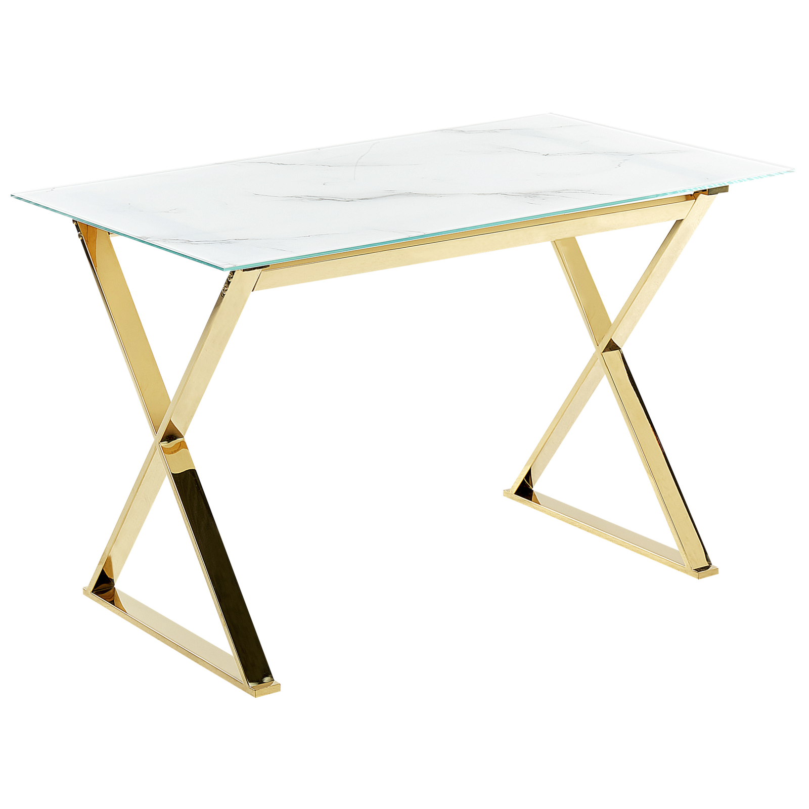 Masă de dining cu blat din sticlă securizată. Dă un aer nou spațiului tău de dining cu această masă elegantă. Blatul din sticlă securizată albă și picioarele stabile din oțel inoxidabil auriu cu finisaj lucios adaugă rafinament. Poți găzdui până la 4 persoane, iar masa este durabilă și ușor de întreținut. Detalii: Tip de Produs: Masă dining. Stil: Glamour. Culoare: Alb. Nuanță: Alb marmură. Material: Sticlă. Material primar: Sticlă securizată. Material secundar: Oțel inoxidabil. Detalii material picioare: Metal. Materialul suprafeței mesei: Sticlă. Formă: Rectangulară. Finisaj: Lucios. Locuri până la: 4 persoane. Dimensiuni: Lățime: 70 cm. Lungime: 120 cm. Înălțime: 75 cm. Greutate: 24 kg. Capacitatea de greutate: 40 kg. Oferta incude: 1 x Masă. Caracteristici cheie: Se potrivește perfect în bucătărie sau în sufragerie, Piesă cu accent atrăgător, Design elegant, Materiale de cea mai bună calitate, Capace pentru picioare pentru protecția suprafeței. Asamblare: Necesită asamblare completă.20-40 min. Sfaturi de întreținere: Sticlă securizată: 1.Curățați-l cu un detergent delicat sau cu un detergent pentru sticlă, folosind o cârpă moale. Uscați imediat după curățare. 2.Pentru a evita zgârieturile, nu folosiți creme de curățare. Oțel inoxidabil: 1.Curățați cu un detergent delicat și o cârpă moale, apoi ștergeți bine. 2.Pentru a evita zgârieturile, nu folosiți produse de curățare abrazive. 3.Pentru elementele din cupru sau crom, folosiți un agent de lustruire.