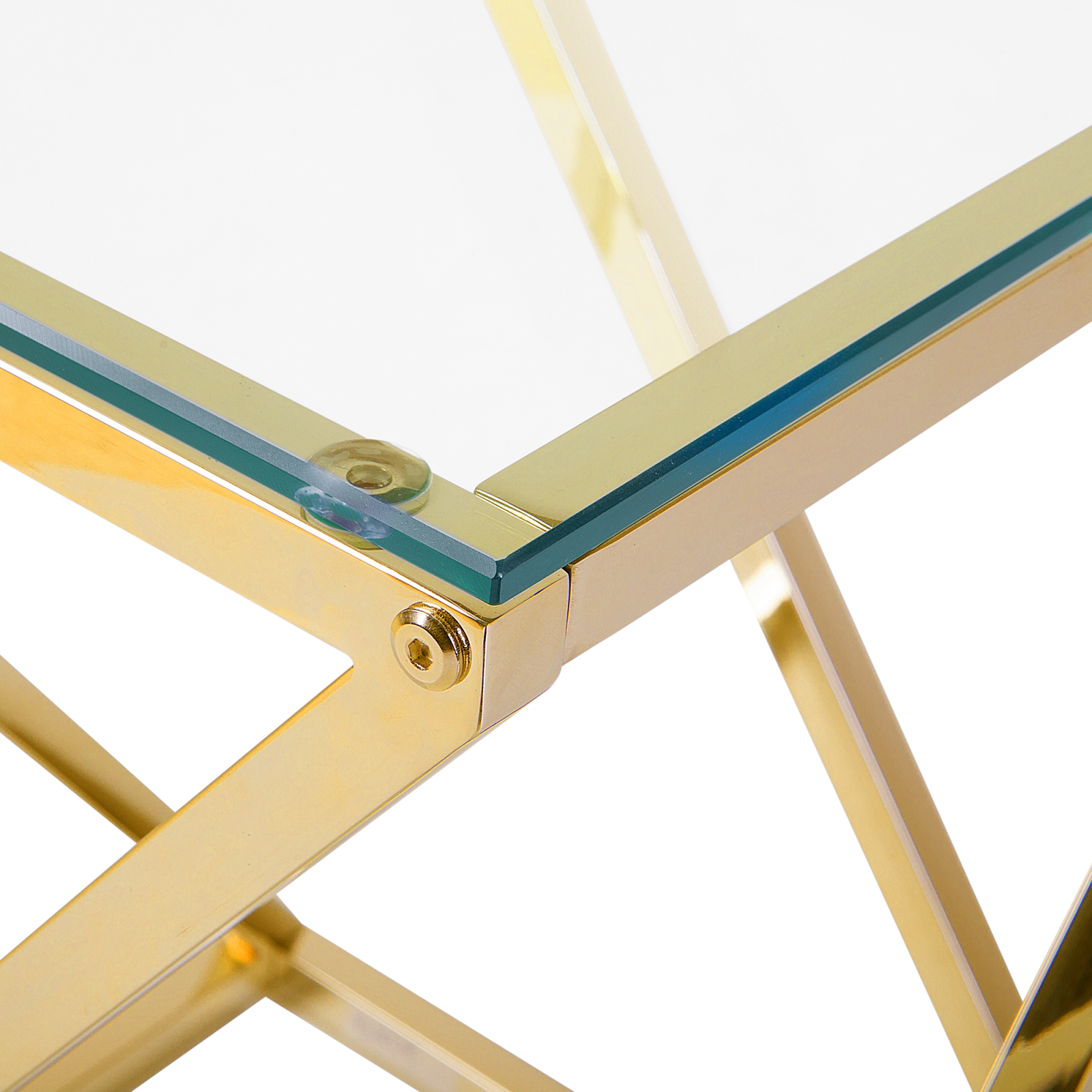 Măsuță laterală elegantă cu blat din sticlă transparentă. Adaugă eleganță livingului tău cu această masă de cafea modernă, cu blat transparent din sticlă securizată și cadru metalic auriu. Designul geometric și finisajul lucios aurit adaugă un aer glam și industrial, în timp ce construcția robustă garantează stabilitate și durabilitate. Ideală pentru decoruri moderne și minimaliste. Detalii: Tip de Produs: Masă laterală. Stil: Glamour. Culoare: Auriu. Material: Sticlă. Material primar: Sticlă. Material secundar: Oțel inoxidabil. Materialul suprafeței mesei: Sticlă. Formă: Pătrată. Finisaj: Lustruit. Depozitare: Nu. Dimensiuni: Lățime: 40 cm. Lungime: 40 cm. Înălțime: 55 cm. Greutate: 6 kg. Capacitatea de greutate: 10 kg. Oferta incude: 1 x Masă laterală. Caracteristici cheie: Blat gros din sticlă securizată, Finisaj lucios, Mobilier decorativ și funcțional, Design elegant, Construcție robustă. Asamblare: Necesită asamblare parțială.20-40 min. Sfaturi de întreținere: Sticlă: 1.Curățați-l cu un detergent delicat sau cu un detergent pentru sticlă, folosind o cârpă moale. Uscați imediat după curățare. 2.Pentru a evita zgârieturile, nu folosiți creme de curățare. Oțel inoxidabil: 1.Curățați cu un detergent delicat și o cârpă moale, apoi ștergeți bine. 2.Pentru a evita zgârieturile, nu folosiți produse de curățare abrazive. 3.Pentru elementele din cupru sau crom, folosiți un agent de lustruire.