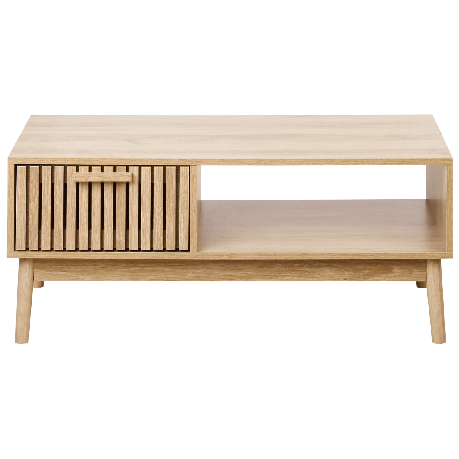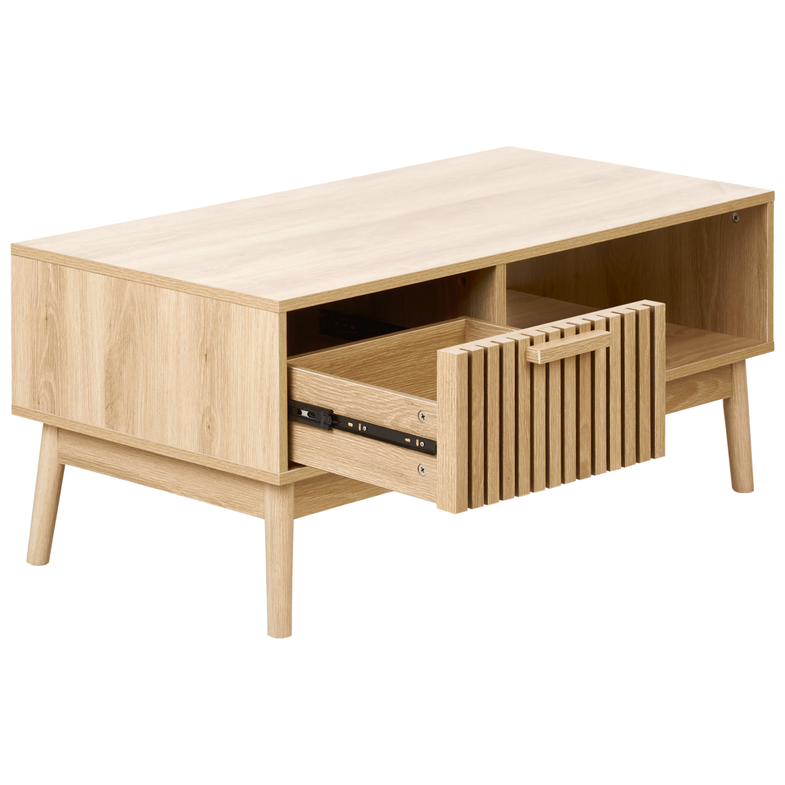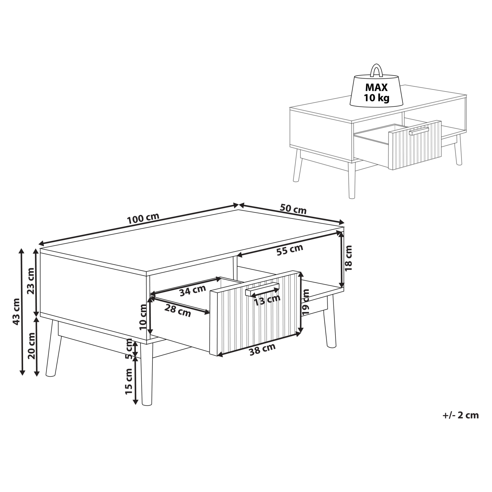 Masă de cafea cu sertar și front canelat. Această masă de cafea din lemn stratificat adaugă un aer natural dormitorului tău, cu detalii autentice ale nodurilor de lemn. Dispune de un sertar spațios cu front canelat și un raft deschis pentru acces rapid la cărți sau obiecte esențiale. Cu picioare din lemn masiv pentru stabilitate, combină depozitarea practică cu un stil rustic, potrivit oricărui decor. Detalii: Tip de Produs: Masă de cafea. Stil: Scandinav. Culoare: Maro. Material: Lemn stratificat. Material primar: Fibră cu densitate medie (MDF). Material secundar: Lemn de pin. Detalii material picioare: Lemn. Materialul suprafeței mesei: Lemn stratificat. Formă: Rectangulară. Finisaj: Furniruit. Depozitare: Da. Dimensiuni: Lățime: 100 cm. Lungime: 50 cm. Înălțime: 43 cm. Greutate: 22 kg. Capacitatea de greutate: 10 kg. Oferta incude: 1 x Masă de cafea. Caracteristici cheie: Raft de depozitare funcțional sub blatul mesei, Mobilier decorativ și funcțional, Finisaj asemănător lemnului pentru un aspect natural, Execuție robustă, De înaltă calitate, Pentru o protecție optimă, folosiți suporturi de pahare și șervete de masă pentru a feri suprafața de căldură și umezeală, Foarte încăpător. Asamblare: Necesită asamblare completă.45-60 min. Informații suplimentare: Pentru a menține durabilitatea și estetica blatului, recomandăm utilizarea suporturilor pentru farfurii și a suporturilor pentru pahare, precum și îndepărtarea petelor umede cât mai curând posibil, pentru a preveni deteriorarea produsului. Sfaturi de întreținere: Fibră cu densitate medie (MDF): 1.Curățați delicat cu un detergent blând și o cârpă moale, apoi ștergeți suprafața până la uscare completă. Lemn de pin: 1.Curățați cu un detergent delicat și o cârpă moale, urmând direcția fibrelor. 2.Ștergeți imediat după curățare pentru a preveni acumularea apei pe produs. 3.Pentru a păstra mobila finisată cu ulei în stare bună, este necesar să o ungeți cu ulei după un timp.