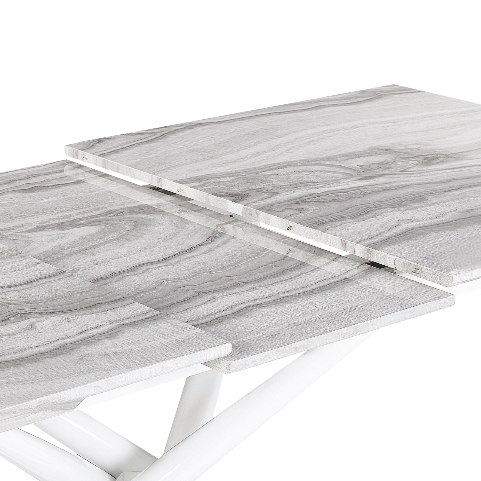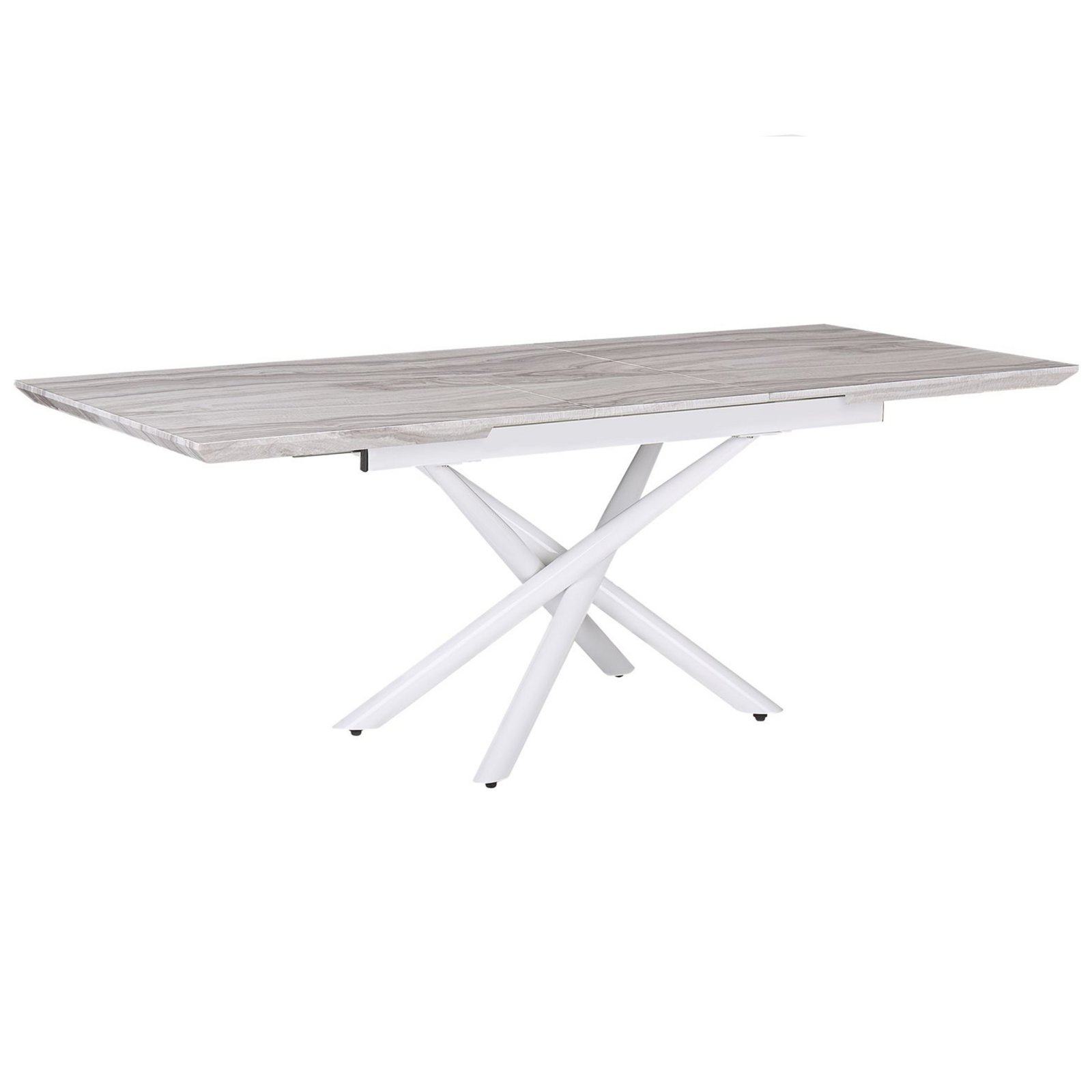 Masă de dining extensibilă elegantă. Această masă elegantă poate găzdui până la 6 persoane când este complet extinsă, fiind ideală pentru momentele petrecute alături de prieteni și familie. Blatul este realizat din MDF cu întreținere redusă, finisat cu un furnir ce imită marmura, iar picioarele albe din fier îi oferă un design unic și stabilitate de durată. Detalii: Tip de Produs: Masă dining. Stil: Modern. Culoare: Alb. Material: Lemn stratificat. Material primar: Fibră cu densitate medie (MDF). Material secundar: Fier. Detalii material picioare: Metal. Materialul suprafeței mesei: Lemn stratificat. Formă: Rectangulară. Finisaj: Acoperire pulverizată. Locuri până la: 6 - 8 persoane. Dimensiuni: Lățime: 90 cm. Lungime: 160/200 cm. Înălțime: 75 cm. Greutate: 59 kg. Capacitatea de greutate: 100 kg. Oferta incude: 1 x Masă. Caracteristici cheie: Perfect pentru prânzuri și cine cu mulți oaspeți, Design elegant, Excepțional de ușor de întreținut, Construcție robustă, Pentru o protecție optimă, folosiți suporturi de pahare și șervete de masă pentru a feri suprafața de căldură și umezeală, Masa este extensibilă, oferind spațiu suplimentar, Bază stabilă și durabilă. Asamblare: Necesită asamblare parțială.60-90 min. Informații suplimentare: Pentru a menține durabilitatea și estetica blatului, recomandăm utilizarea suporturilor pentru farfurii și a suporturilor pentru pahare, precum și îndepărtarea petelor umede cât mai curând posibil, pentru a preveni deteriorarea produsului. Sfaturi de întreținere: Fibră cu densitate medie (MDF): 1.Curățați delicat cu un detergent blând și o cârpă moale, apoi ștergeți suprafața până la uscare completă. Fier: 1.Curățați cu un detergent delicat și o cârpă moale, apoi ștergeți bine. 2.Pentru a evita zgârieturile, nu folosiți produse de curățare abrazive. 3.Pentru elementele din cupru sau crom, folosiți un agent de lustruire.