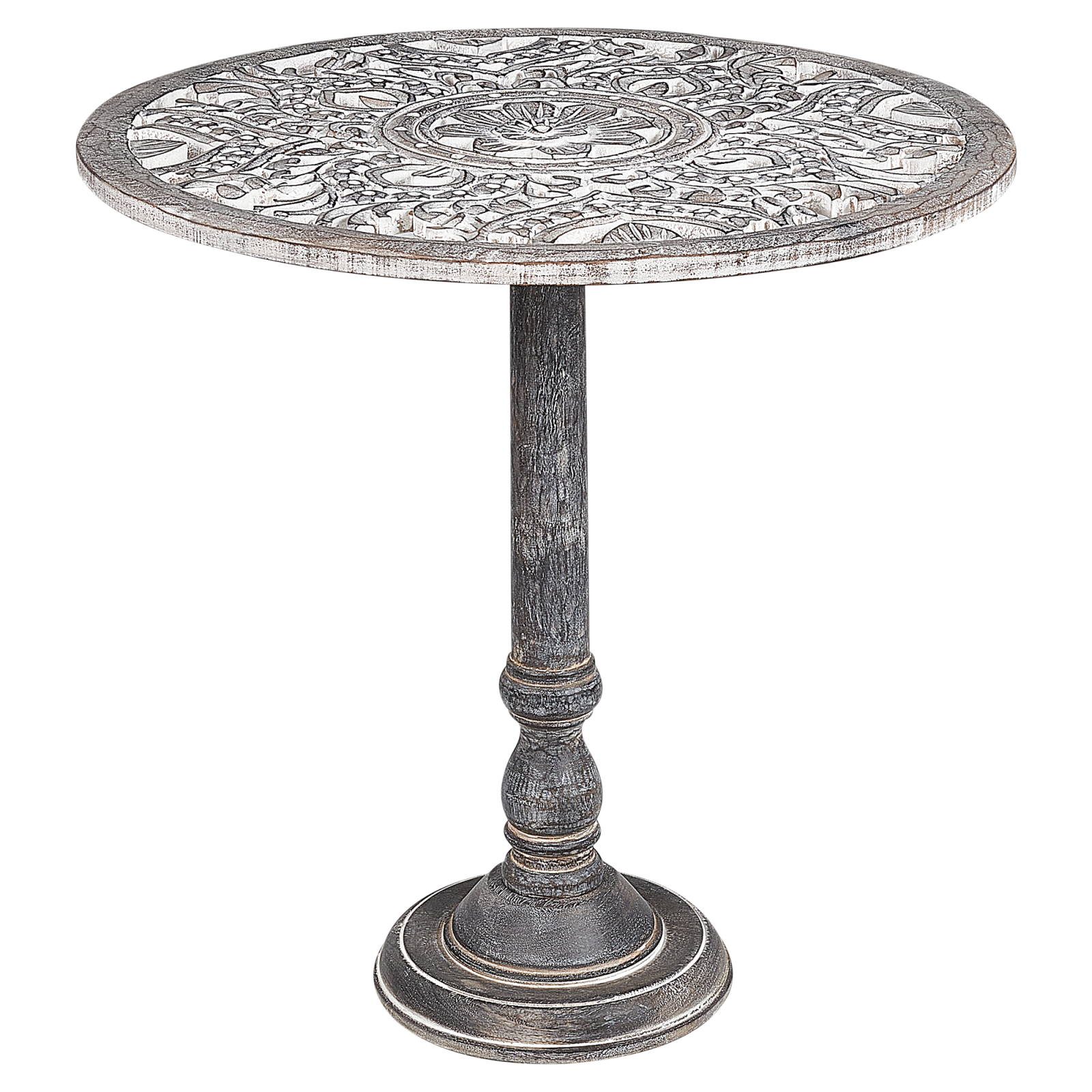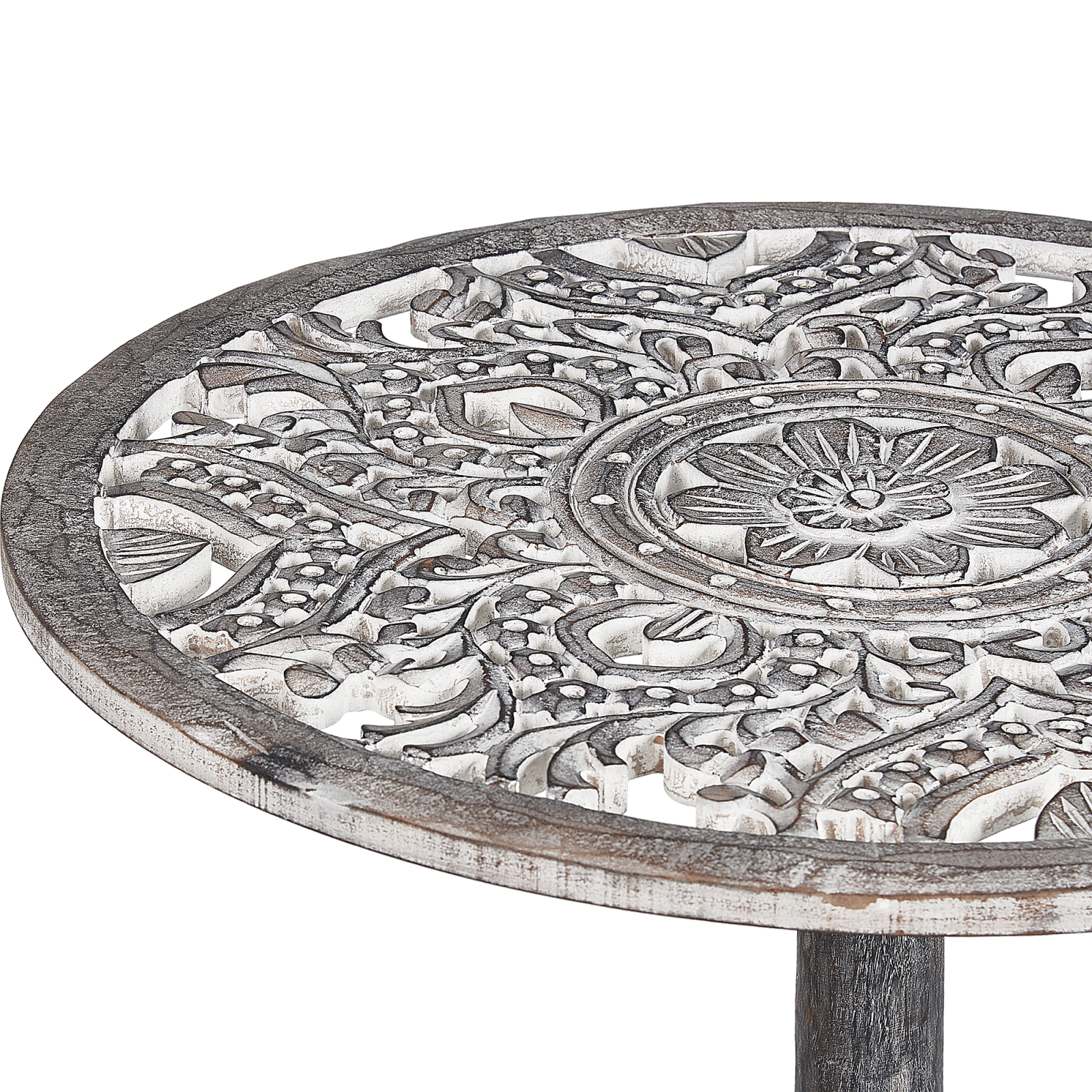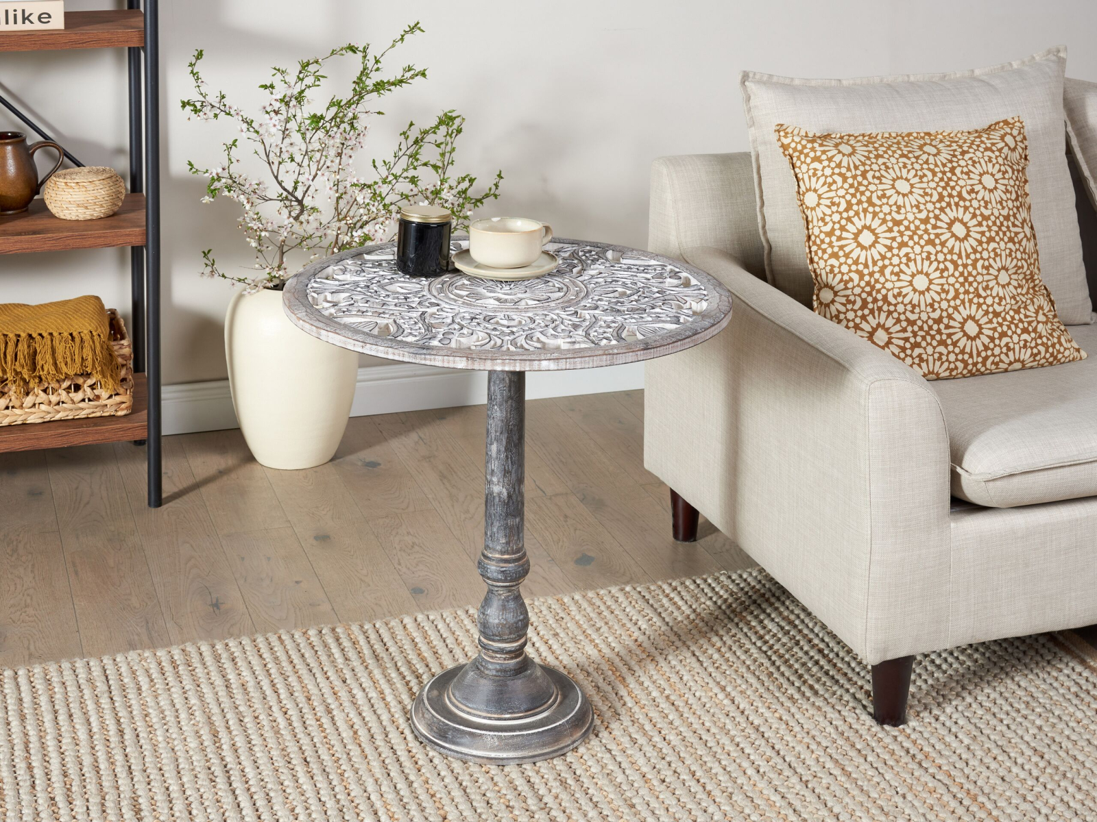 Masă de cafea rotundă cu piedestal făcut manual. Realizată manual, unică și deosebită – această masă laterală le are pe toate. Piesa, fabricată din lemn de mango și MDF, oferă o durabilitate ridicată și nu necesită întreținere zilnică pentru a rezista mulți ani. Este așezată pe un piedestal lăcuit, ceea ce o face foarte stabilă, astfel că poți pune băuturi, mâncare sau decorațiuni preferate fără să îți faci griji că se vor răsturna. Blatul vopsit al mesei prezintă gravuri florale care atrag atenția, ceea ce va capta cu siguranță privirile oaspeților tăi. Detalii: Tip de Produs: Masă laterală. Stil: Tradițional. Culoare: Gri. Material: Lemn. Material primar: Lemn de mango. Detalii material picioare: Lemn. Materialul suprafeței mesei: Lemn. Formă: Rotundă. Finisaj: Lăcuit. Depozitare: Nu. Dimensiuni: Lățime: 61 cm. Lungime: 61 cm. Înălțime: 62 cm. Greutate: 5 kg. Capacitatea de greutate: 12 kg. Oferta incude: 1 x Masă laterală. Caracteristici cheie: Piesă cu accent atrăgător, Adaugă o notă de stil în orice cameră, Excepțional de ușor de întreținut, Finisaje precise, Materiale de cea mai bună calitate. Asamblare: Necesită asamblare parțială.5-15 min. Informații suplimentare: Vă rugăm să rețineți că fiecare produs este realizat manual. Pot exista mici diferențe de textură, culoare sau formă datorită caracteristicilor materialelor folosite, iar acestea nu vor fi considerate defecte. Efectul imperfect, îmbătrânit sau pătat al acestui produs este intenționat și nu reprezintă un defect de fabricație. Trebuie remarcat faptul că lemnul este un material natural și, prin urmare, fiecare obiect din lemn diferă de celelalte. Diferențele de culoare și de textură a suprafeței (noduri de lemn, dungi etc.) sunt caracteristici intrinseci ale materialului și, prin urmare, nu sunt considerate defecte ale produsului. Sfaturi de întreținere: Lemn de mango: 1.Curățați cu un detergent delicat și o cârpă moale, urmând direcția fibrelor. 2.Ștergeți imediat după curățare pentru a preveni acumularea apei pe produs. 3.Pentru a păstra mobila finisată cu ulei în stare bună, este necesar să o ungeți cu ulei după un timp. Fibră cu densitate medie (MDF): 1.Curățați delicat cu un detergent blând și o cârpă moale, apoi ștergeți suprafața până la uscare completă.
