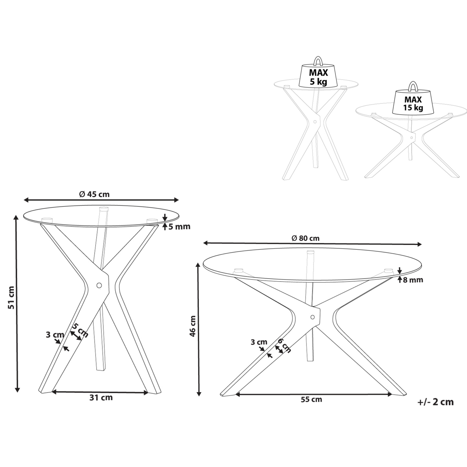 Set de 2 măsuțe rotunde cu picioare din lemn. Descoperă setul de două măsuțe de cafea perfect pentru livingul tău, cu un blat rotund din sticlă securizată. Elegante și rezistente, este ideal pentru momentele tale de relaxare. Picioarele din lemn de cauciuc, într-o nuanță de maro deschis, adaugă un plus de căldură și stabilitate, creând o atmosferă primitoare și modernă în orice colț al casei. Detalii: Tip de Produs: Masă de cafea. Stil: Modern. Culoare: Transparent. Material: Sticlă. Material primar: Sticlă securizată. Material secundar: Lemn de cauciuc. Detalii material picioare: Lemn. Materialul suprafeței mesei: Sticlă. Formă: Rotundă. Finisaj: Lăcuit. Dimensiuni: Masă mare: 80x80x46. Dimensiuni generale: 80x80x46. Masă mică: 45x45x51. Greutate: 16 kg. Capacitatea de greutate: 5/15 kg. Oferta incude: 1 x Masă de cafea, 1 x Masă laterală. Caracteristici cheie: Design modern, Granulele și nodurile lemnului natural fac ca fiecare piesă de mobilier să fie unică, Materiale de cea mai bună calitate, Ușor de curățat, Pâslă anti-zgârieturi pentru a proteja suprafețele. Asamblare: Necesită asamblare parțială.20-40 min. Informații suplimentare: Trebuie remarcat faptul că lemnul este un material natural și, prin urmare, fiecare obiect din lemn diferă de celelalte. Diferențele de culoare și de textură a suprafeței (noduri de lemn, dungi etc.) sunt caracteristici intrinseci ale materialului și, prin urmare, nu sunt considerate defecte ale produsului. Sfaturi de întreținere: Sticlă securizată: 1.Curățați-l cu un detergent delicat sau cu un detergent pentru sticlă, folosind o cârpă moale. Uscați imediat după curățare. 2.Pentru a evita zgârieturile, nu folosiți creme de curățare. Lemn de cauciuc: 1.Curățați cu un detergent delicat și o cârpă moale, urmând direcția fibrelor. 2.Ștergeți imediat după curățare pentru a preveni acumularea apei pe produs. 3.Pentru a păstra mobila finisată cu ulei în stare bună, este necesar să o ungeți cu ulei după un timp.