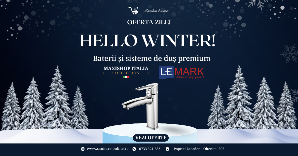 Bine ai venit la Oferta Zilei Hello Winter! Doar astăzi poți beneficia de prețuri speciale la produsele noastre de baie. Este momentul perfect să-ți upgradezi baia sau să găsești cadoul ideal pentru cei dragi.