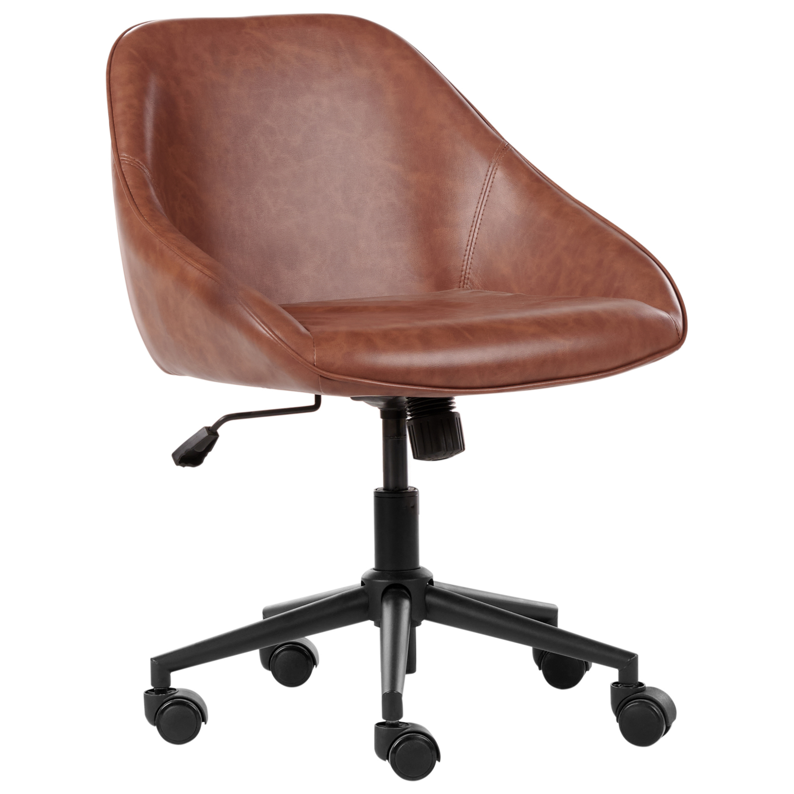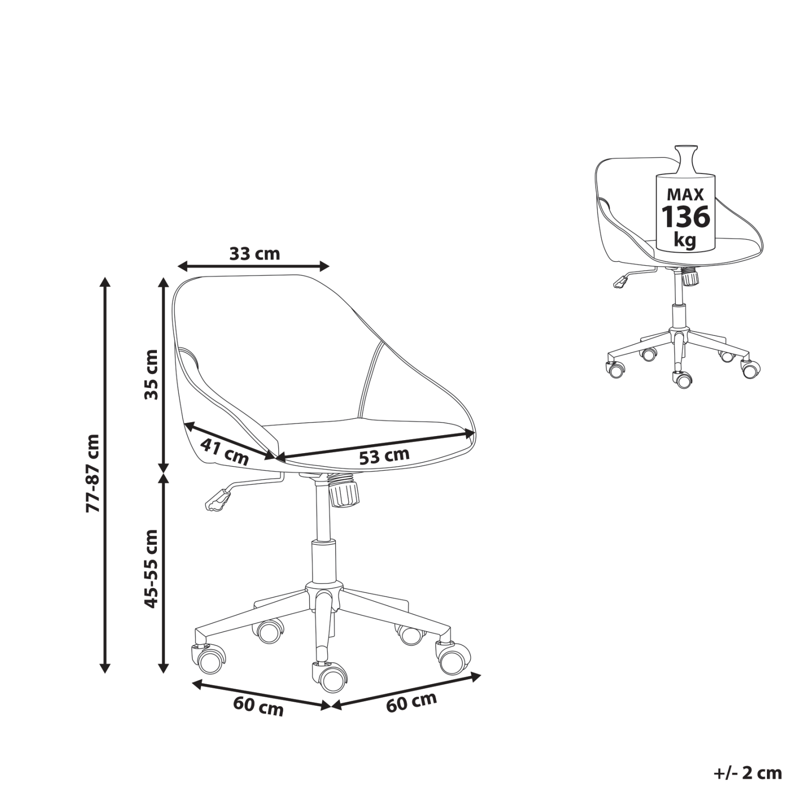 Scaun de birou elegant. Acest scaun de birou clasic este un obiect elegant de nelipsit din orice spațiu de lucru. Fabricat din piele ecologică de înaltă calitate, adaugă un plus de rafinament biroului. Scaunul este susținut de picioare robuste din oțel și include funcție de rotire, pentru o mișcare ușoară. Funcția de înălțime reglabilă permite personalizarea acestuia în funcție de nevoile tale. Culoarea sa neutră îl face versatil și ușor de integrat într-o gamă variată de decoruri de birou. Detalii: Tip de Produs: Scaun de birou. Stil: Retro. Culoare: Maro. Material: Piele ecologică. Material primar: Piele ecologică. Material secundar: Placaj. Detalii material picioare: Metal. Material scaun: Piele ecologică. Compoziția materialului: 100% Piele sintetică. Rotire la 360°: Da. Piese reglabile: Înălțime scaun. Cotiere: Da. Finisaj: Acoperire pulverizată. Protecții pentru picioare incluse: Nu. Înclinare: Da. Dimensiuni: Înălțimea cotierei: 50-60 cm. Adâncime: 60 cm. Înălțimea scaunului: 45-55 cm. Lățime: 60 cm. Înălțime: 77-87 cm. Suprafața de ședere: 41x53 cm. Greutate: 8 kg. Capacitatea de greutate: 136 kg. Oferta incude: 1 x Scaun de birou. Caracteristici cheie: Rotire de 360°, Mecanism de înclinare pentru relaxarea spatelui încordat, Tapițerie din piele ecologică de înaltă calitate pentru un aspect natural, Structură proiectată pentru a oferi stabilitate maximă, Înălțime reglabilă. Asamblare: Necesită asamblare parțială.5-15 min. Sfaturi de întreținere: Piele ecologică: 1.O dată pe săptămână, ștergeți cu o cârpă umedă și uscați după curățare. Nu folosiți substanțe uleioase. 2.Vă rugăm să curățați cu apă distilată și să folosiți detergenți pe bază de săpun pentru petele dificile. 3.Utilizați doar soluții de curățare delicate și balsamuri dedicate pielii ecologice. 4.Aspirati folosind un accesoriu potrivit. Oțel: 1.Curățați cu un detergent delicat și o cârpă moale, apoi ștergeți bine. 2.Pentru a evita zgârieturile, nu folosiți produse de curățare abrazive. 3.Pentru elementele din cupru sau crom, folosiți un agent de lustruire.