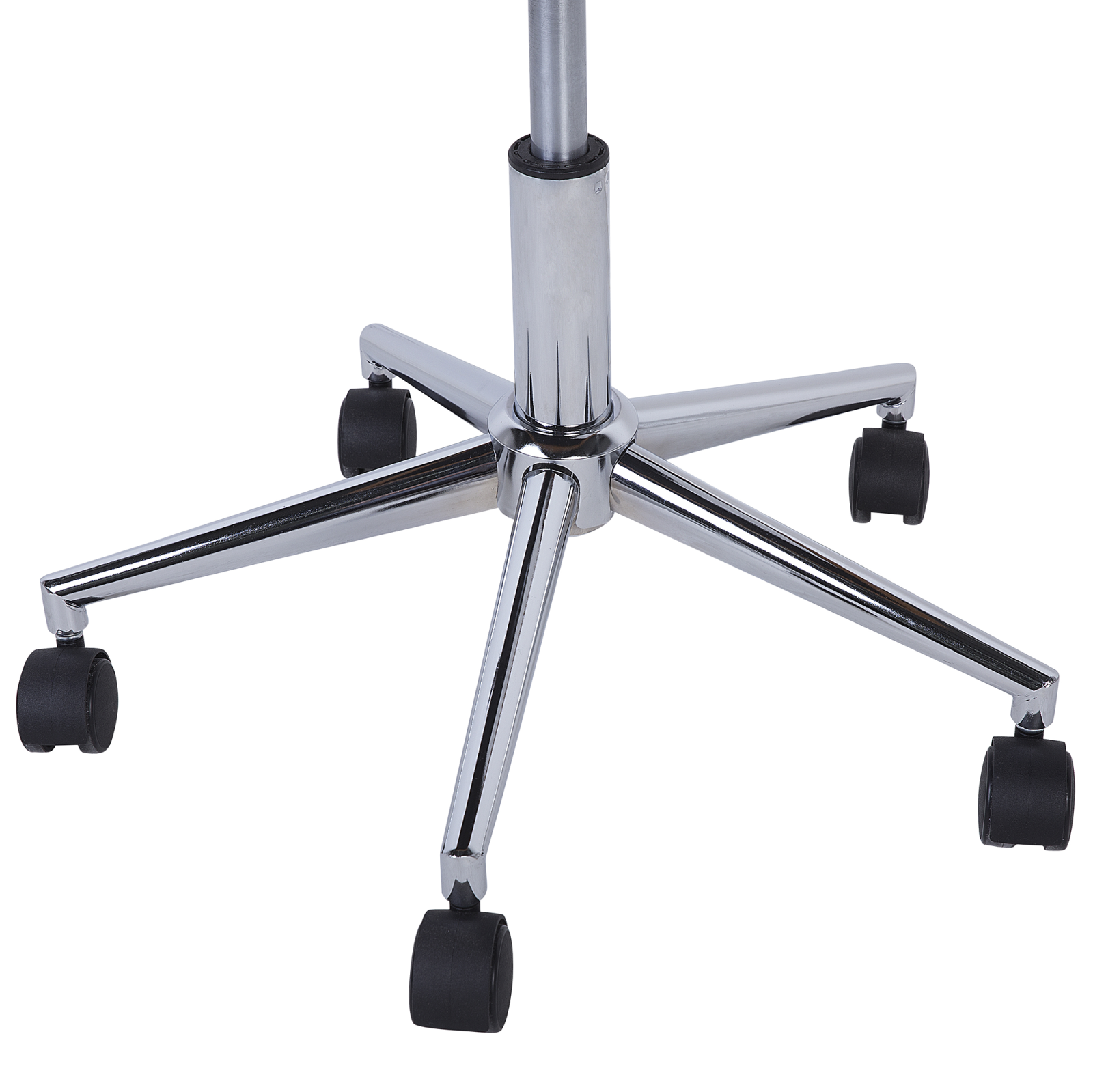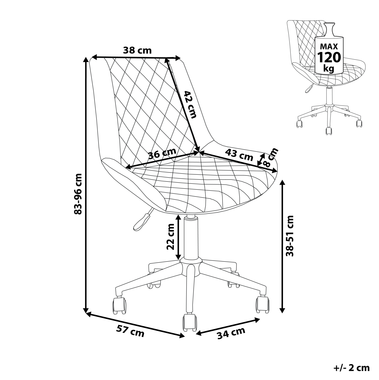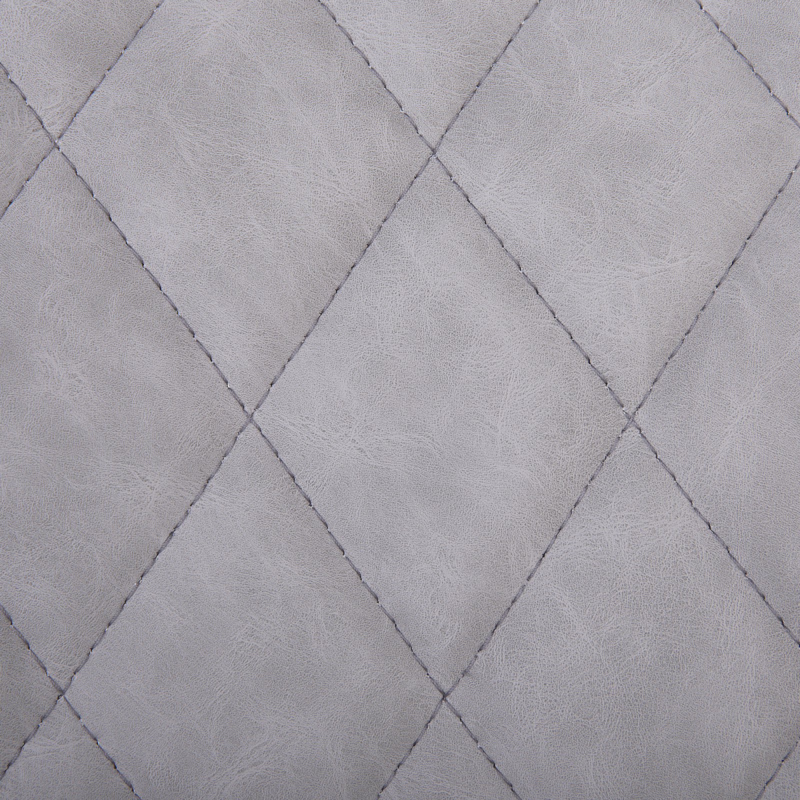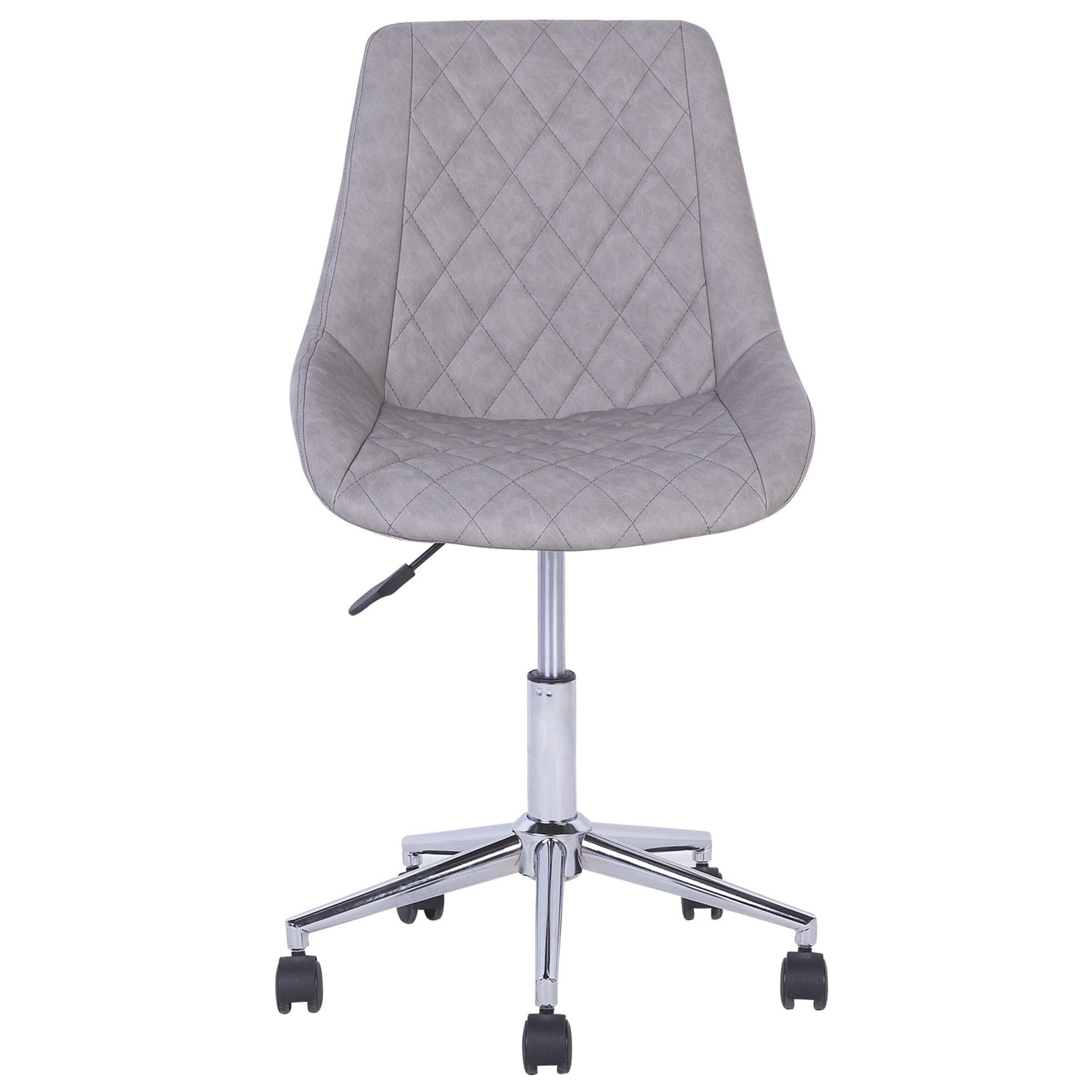 Scaun de birou rotativ fără brațe. Adaugă un plus de eleganță biroului tău de acasă cu acest scaun tapițat în piele sintetică, care se potrivește perfect într-o varietate de stiluri de la glamour la tradițional sau modern. Cusăturile decorative în formă de diamant pe tapițeria gri și baza lucioasă argintie creează un design sofisticat, ușor de integrat în diverse scheme de culori. Dotat cu roți, spumă moale și sistem pneumatic pe gaz, asigură confort pe parcursul prelungite la computer. Detalii: Tip de Produs: Scaun de birou. Stil: Glamour. Culoare: Gri. Nuanță: Gri deschis. Material: Piele ecologică. Material primar: Piele ecologică. Material secundar: Placaj. Detalii material picioare: Metal. Material scaun: Piele ecologică. Compoziția materialului: 100% Piele sintetică. Rotire la 360°: Da. Piese reglabile: Înălțime scaun. Cotiere: Nu. Finisaj: Cromat. Protecții pentru picioare incluse: Nu. Înclinare: Nu. Dimensiuni: Adâncime: 57 cm. Înălțimea scaunului: 38-51 cm. Lățime: 57 cm. Înălțime: 83-96 cm. Suprafața de ședere: 36x43 cm. Greutate: 8 kg. Capacitatea de greutate: 120 kg. Oferta incude: 1 x Scaun de birou. Caracteristici cheie: Roți pivotante cu rulare lină, Rotire de 360°, Funcție de frână de siguranță care blochează roțile pentru siguranță, se deblochează pentru mobilitate. Șezut lat, capitonat gros, Execuție robustă, Ușor de curățat. Asamblare: Necesită asamblare parțială.20-40 min. Informații suplimentare: Pentru o stabilitate și siguranță maximă în utilizare, se recomandă să verificați la aproximativ 2 săptămâni după instalare dacă produsul a fost asamblat corect. De asemenea, se recomandă să verificați dacă șuruburile sunt strânse corect, o dată la 3 luni. Sfaturi de întreținere: Piele ecologică: 1.O dată pe săptămână, ștergeți cu o cârpă umedă și uscați după curățare. Nu folosiți substanțe uleioase. 2.Vă rugăm să curățați cu apă distilată și să folosiți detergenți pe bază de săpun pentru petele dificile. 3.Utilizați doar soluții de curățare delicate și balsamuri dedicate pielii ecologice. 4.Aspirati folosind un accesoriu potrivit. Fier: 1.Curățați cu un detergent delicat și o cârpă moale, apoi ștergeți bine. 2.Pentru a evita zgârieturile, nu folosiți produse de curățare abrazive. 3.Pentru elementele din cupru sau crom, folosiți un agent de lustruire.