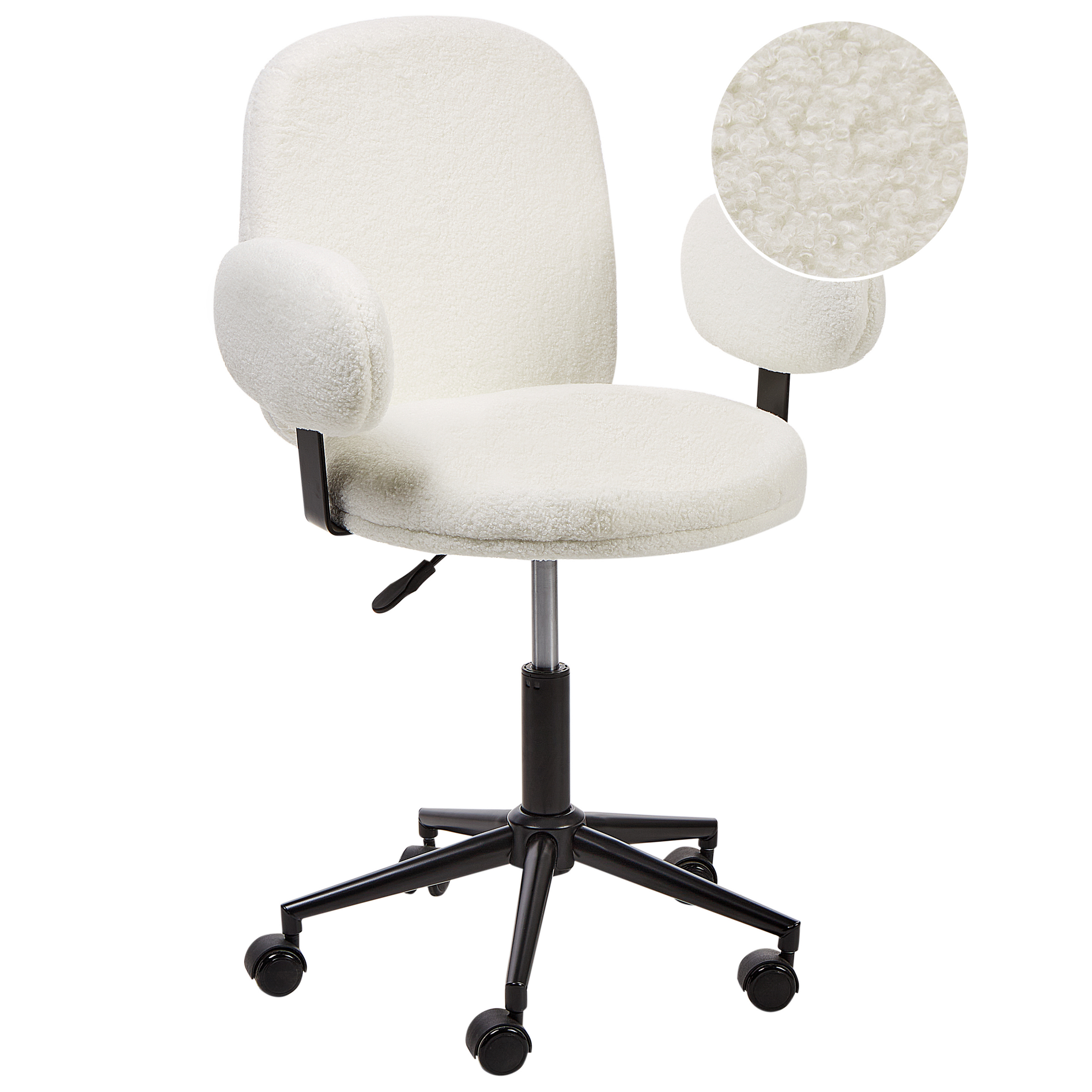 Scaun de birou tapițat cu cotiere. Creează un colț confortabil în biroul tău cu acest scaun tapițat deosebit de confortabil. Șezutul și spătarul generos, împreună cu cotierele, sunt acoperite cu țesătură boucle moale și plăcută la atingere, într-o nuanță elegantă. Baza neagră, din metal durabil, oferă stabilitate, iar mecanismul cu piston pe gaz permite reglarea precisă a înălțimii scaunului. În plus, funcția de rotație 360° îl face extrem de versatil și practic pentru orice birou. Detalii: Tip de Produs: Scaun de birou. Stil: Retro. Culoare: Alb. Nuanță: Alb-murdar. Material: Țesătură. Material primar: Boucle. Material secundar: Fier. Detalii material picioare: Metal. Material scaun: Țesătură. Compoziția materialului: 100% Poliester. Rotire la 360°: Da. Piese reglabile: Înălțime scaun. Cotiere: Da. Finisaj: Acoperire pulverizată. Protecții pentru picioare incluse: Nu. Înclinare: Nu. Dimensiuni: Înălțimea cotierei: 66 cm. Adâncime: 58 cm. Înălțimea scaunului: 42-57 cm. Lățime: 58 cm. Înălțime: 80-95 cm. Suprafața de ședere: 46x46 cm. Greutate: 8 kg. Capacitatea de greutate: 130 kg. Oferta incude: 1 x Scaun. Caracteristici cheie: Rotire de 360°, Roți pivotante cu rulare lină, Reglarea pneumatică a înălțimii scaunului, Confort maxim, Design modern. Asamblare: Necesită asamblare completă.5-15 min. Informații suplimentare: Pentru o stabilitate și siguranță maximă în utilizare, se recomandă să verificați la aproximativ 2 săptămâni după instalare dacă produsul a fost asamblat corect. De asemenea, se recomandă să verificați dacă șuruburile sunt strânse corect, o dată la 3 luni. Sfaturi de întreținere: Boucle: 1.Vă rugăm să curățați cu un șampon uscat și un burete umed sau cu un detergent ușor. 2.Aspirati folosind un accesoriu potrivit. Fier: 1.Curățați cu un detergent delicat și o cârpă moale, apoi ștergeți bine. 2.Pentru a evita zgârieturile, nu folosiți produse de curățare abrazive. 3.Pentru elementele din cupru sau crom, folosiți un agent de lustruire.