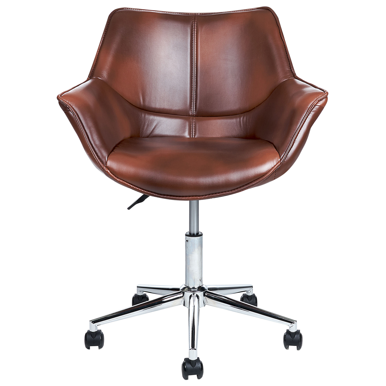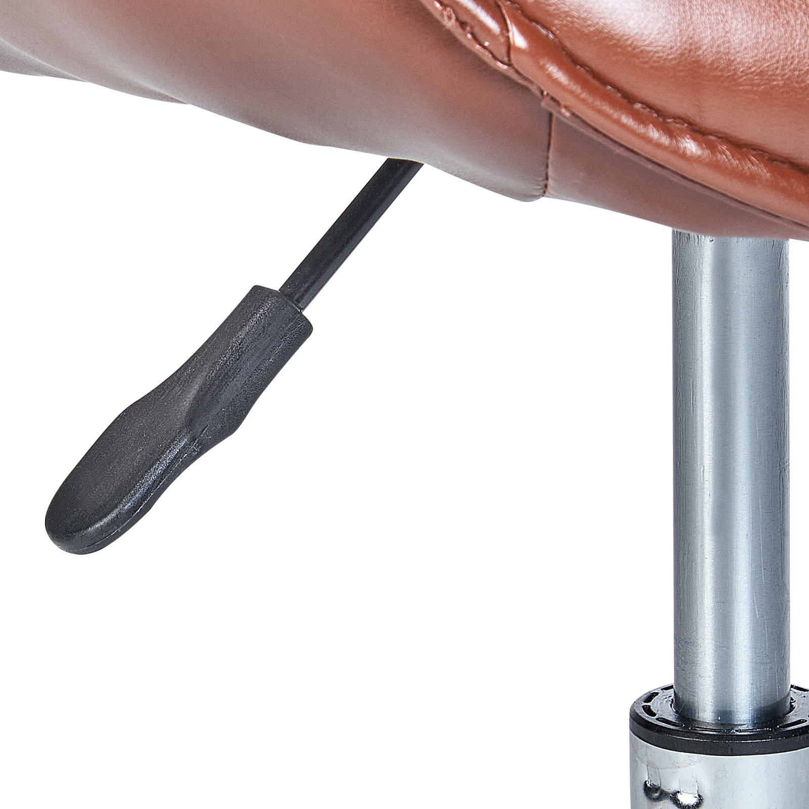 Scaun de birou rotativ elegant. Adaugă o notă atemporală biroului tău de acasă cu acest scaun. Este fabricat din piele ecologică de înaltă calitate, care este moale la atingere. Scaunul lat și cotierele profilate oferă un confort maxim. Baza metalică cu design clasic, pe roți, permite reglarea înălțimii. Detalii: Tip de Produs: Scaun de birou. Stil: Retro. Culoare: Maro. Nuanță: Maro închis. Material: Piele ecologică. Material primar: Piele ecologică. Material secundar: Fier. Detalii material picioare: Metal. Material scaun: Piele ecologică. Compoziția materialului: 100% Piele sintetică. Rotire la 360°: Da. Piese reglabile: Înălțime scaun. Cotiere: Da. Finisaj: Cromat. Protecții pentru picioare incluse: Nu. Înclinare: Nu. Dimensiuni: Înălțimea cotierei: 57-69 cm. Adâncime: 62 cm. Înălțimea scaunului: 40-52 cm. Lățime: 62 cm. Înălțime: 79-91 cm. Suprafața de ședere: 45x42 cm. Greutate: 9 kg. Capacitatea de greutate: 130 kg. Oferta incude: 1 x Scaun de birou. Caracteristici cheie: Rotire de 360°, Roți pivotante cu rulare lină, Reglarea pneumatică a înălțimii scaunului, Funcție de frână de siguranță care blochează roțile pentru siguranță, se deblochează pentru mobilitate. Confort maxim, Mobilier decorativ și funcțional. Asamblare: Necesită asamblare completă.5-15 min. Informații suplimentare: Pentru o stabilitate și siguranță maximă în utilizare, se recomandă să verificați la aproximativ 2 săptămâni după instalare dacă produsul a fost asamblat corect. De asemenea, se recomandă să verificați dacă șuruburile sunt strânse corect, o dată la 3 luni. Sfaturi de întreținere: Piele ecologică: 1.O dată pe săptămână, ștergeți cu o cârpă umedă și uscați după curățare. Nu folosiți substanțe uleioase. 2.Vă rugăm să curățați cu apă distilată și să folosiți detergenți pe bază de săpun pentru petele dificile. 3.Utilizați doar soluții de curățare delicate și balsamuri dedicate pielii ecologice. 4.Aspirati folosind un accesoriu potrivit. Fier: 1.Curățați cu un detergent delicat și o cârpă moale, apoi ștergeți bine. 2.Pentru a evita zgârieturile, nu folosiți produse de curățare abrazive. 3.Pentru elementele din cupru sau crom, folosiți un agent de lustruire.