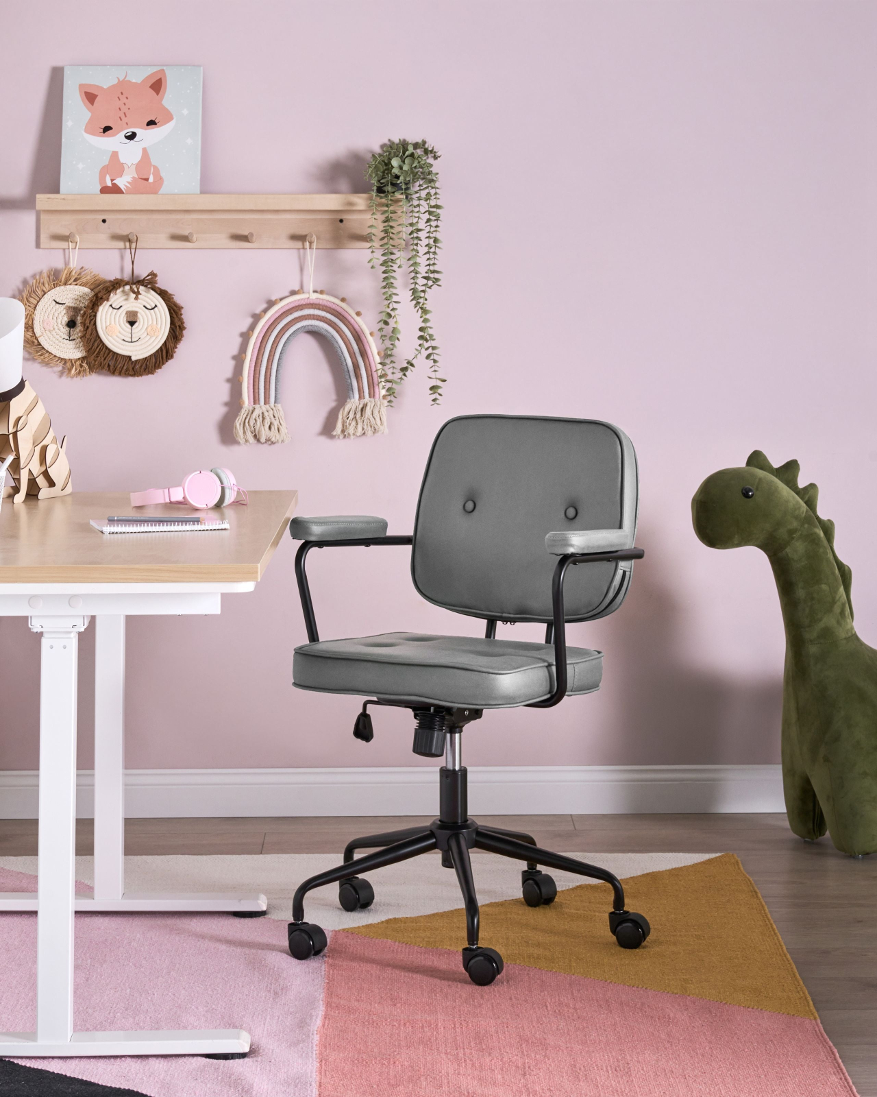 Scaun de birou rotativ în stil retro. Reîmprospătează-ți spațiul de lucru cu acest scaun de birou funcțional. Dispune de mecanism de rotație la 360°, opțiune de înclinare și piston cu gaz care permite reglarea înălțimii după preferințe. Tapițat cu țesătură rezistentă, scaunul are spătar cu butoni capitonați, cotiere și șezut căptușite, oferind un aspect simplu, dar elegant. Picioarele și baza din metal cromat îi conferă stabilitate și durabilitate. Se integrează armonios atât în interioare tradiționale, cât și moderne. Detalii: Tip de Produs: Scaun de birou. Stil: Retro. Culoare: Gri. Material: Țesătură. Material primar: Catifea. Material secundar: Fier. Detalii material picioare: Metal. Material scaun: Piele ecologică. Compoziția materialului: 100% Poliester. Rotire la 360°: Da. Piese reglabile: Înălțime scaun. Cotiere: Da. Finisaj: Acoperire pulverizată. Protecții pentru picioare incluse: Nu. Înclinare: Da. Dimensiuni: Înălțimea cotierei: 70-77 cm. Adâncime: 43 cm. Înălțimea scaunului: 49-56 cm. Lățime: 62 cm. Înălțime: 88-95 cm. Suprafața de ședere: 47x43 cm. Greutate: 9.7 kg. Capacitatea de greutate: 100 kg. Oferta incude: 1 x Scaun de birou. Caracteristici cheie: Rotire de 360°, Funcție de frână de siguranță care blochează roțile pentru siguranță, se deblochează pentru mobilitate. Reglarea pneumatică a înălțimii scaunului, Mecanism de înclinare pentru relaxarea spatelui încordat, Design tradițional cu o notă modernă, Construcție solidă și stabilă, Înălțime reglabilă. Asamblare: Picioare neasamblate.20-40 min. Informații suplimentare: Pentru o stabilitate și siguranță maximă în utilizare, se recomandă să verificați la aproximativ 2 săptămâni după instalare dacă produsul a fost asamblat corect. De asemenea, se recomandă să verificați dacă șuruburile sunt strânse corect, o dată la 3 luni. Rețineți că țesătura de catifea poate avea un aspect puțin diferit atunci când este expusă la lumină; tinde să fie mai strălucitoare și mai luminoasă în lumina soarelui, în timp ce în lumină artificială are un ton diferit, mai închis. Datorită tipului de țesătură, tonul catifelei poate varia, de asemenea, atunci când este atinsă din direcții diferite. Pentru a uniformiza culoarea și a scăpa de lovituri și cute, materialul trebuie mângâiat cu palma deschisă într-o singură direcție, frecat cu o cârpă umedă sau călcat cu abur. Sfaturi de întreținere: Catifea: 1.Vă rugăm să curățați cu un șampon uscat și un burete umed sau cu un detergent ușor. 2.Aspirati folosind un accesoriu potrivit. Fier: 1.Curățați cu un detergent delicat și o cârpă moale, apoi ștergeți bine. 2.Pentru a evita zgârieturile, nu folosiți produse de curățare abrazive. 3.Pentru elementele din cupru sau crom, folosiți un agent de lustruire.