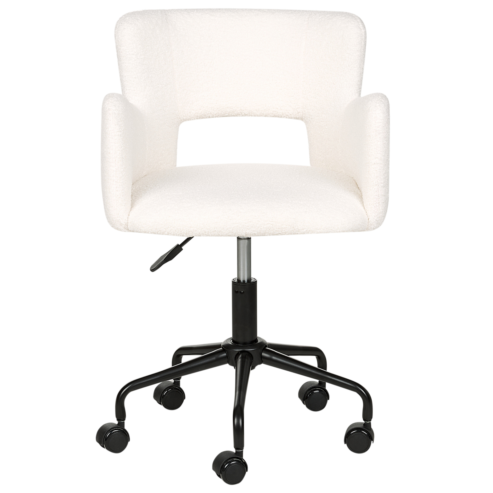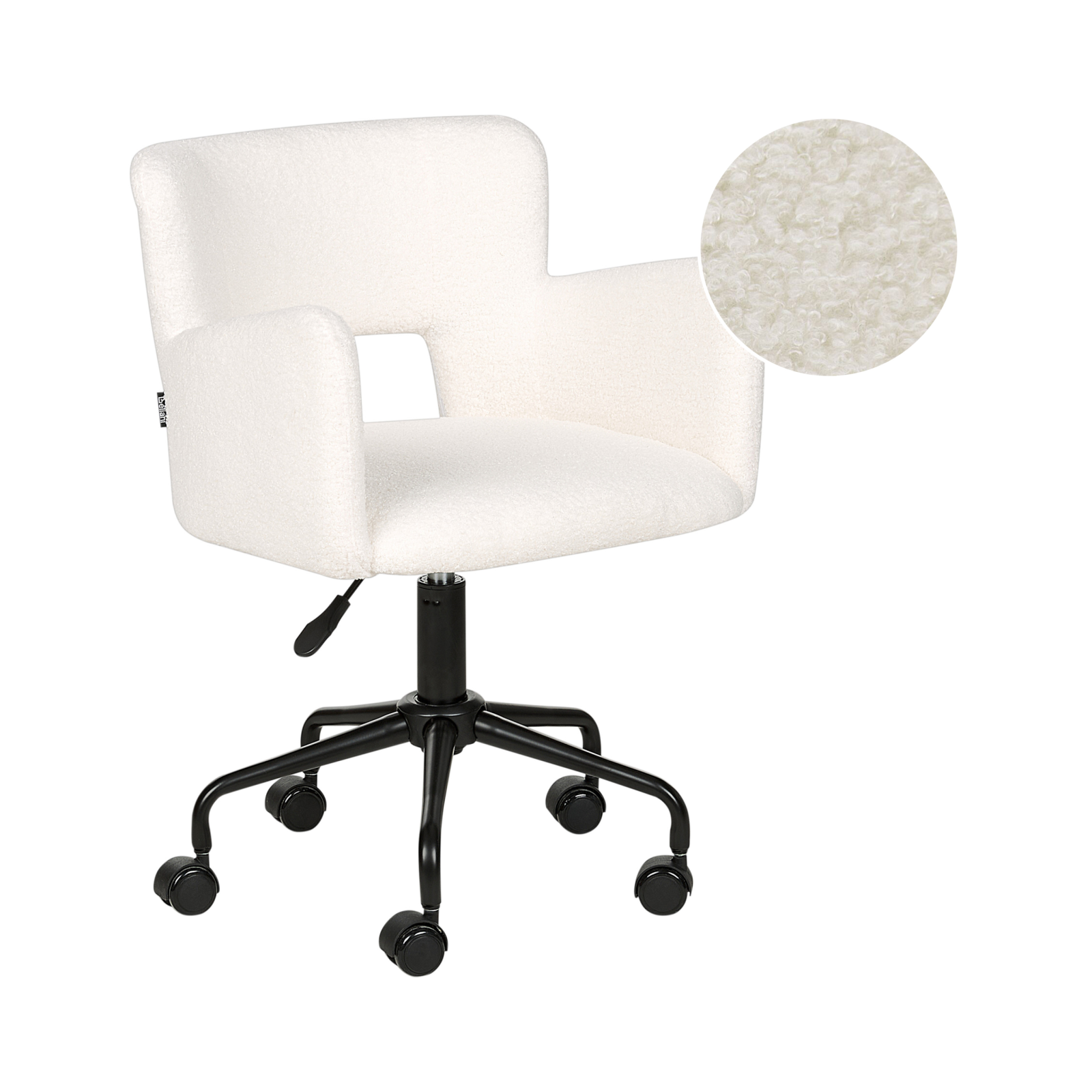 Scaun de birou tapițat cu cotiere. Acest scaun de birou rotativ îmbină perfect un design retro cu funcționalitatea modernă, oferindu-ți atât confort, cât și un aspect sofisticat. Șezutul capitonat, cotierele confortabile și spătarul cu detaliu decupat aduc un plus de stil oricărei încăperi. Tapițeria din boucle de calitate superioară adaugă profunzime și textură, în timp ce capitonajul vertical aduce un aer rafinat. Ideal pentru biroul tău, acest scaun îți va oferi susținerea necesară și un plus de eleganță, făcând fiecare moment petrecut la birou mai plăcut și mai confortabil. Detalii: Tip de Produs: Scaun de birou. Stil: Modern. Culoare: Alb. Nuanță: Alb-murdar. Material: Țesătură. Material primar: Boucle. Material secundar: Fier. Detalii material picioare: Metal. Material scaun: Țesătură. Compoziția materialului: 100% Poliester. Rotire la 360°: Da. Piese reglabile: Înălțime scaun. Cotiere: Da. Finisaj: Cromat. Protecții pentru picioare incluse: Nu. Înclinare: Nu. Dimensiuni: Înălțimea cotierei: 61-69 cm. Adâncime: 62 cm. Înălțimea scaunului: 39-47 cm. Lățime: 62 cm. Înălțime: 71-79 cm. Suprafața de ședere: 44x44 cm. Greutate: 7 kg. Capacitatea de greutate: 130 kg. Oferta incude: 1 x Scaun. Caracteristici cheie: Rotire de 360°, Roți pivotante cu rulare lină, Reglarea pneumatică a înălțimii scaunului, Funcție de frână de siguranță care blochează roțile pentru siguranță, se deblochează pentru mobilitate. Confort maxim, Mobilier decorativ și funcțional, Tapițerie din țesătură de înaltă calitate. Asamblare: Necesită asamblare parțială.5-15 min. Informații suplimentare: Pentru o stabilitate și siguranță maximă în utilizare, se recomandă să verificați la aproximativ 2 săptămâni după instalare dacă produsul a fost asamblat corect. De asemenea, se recomandă să verificați dacă șuruburile sunt strânse corect, o dată la 3 luni. Rețineți că țesătura de catifea poate avea un aspect puțin diferit atunci când este expusă la lumină; tinde să fie mai strălucitoare și mai luminoasă în lumina soarelui, în timp ce în lumină artificială are un ton diferit, mai închis. Datorită tipului de țesătură, tonul catifelei poate varia, de asemenea, atunci când este atinsă din direcții diferite. Pentru a uniformiza culoarea și a scăpa de lovituri și cute, materialul trebuie mângâiat cu palma deschisă într-o singură direcție, frecat cu o cârpă umedă sau călcat cu abur. Sfaturi de întreținere: Boucle: 1.Vă rugăm să curățați cu un șampon uscat și un burete umed sau cu un detergent ușor. 2.Aspirati folosind un accesoriu potrivit. Fier: 1.Curățați cu un detergent delicat și o cârpă moale, apoi ștergeți bine. 2.Pentru a evita zgârieturile, nu folosiți produse de curățare abrazive. 3.Pentru elementele din cupru sau crom, folosiți un agent de lustruire.