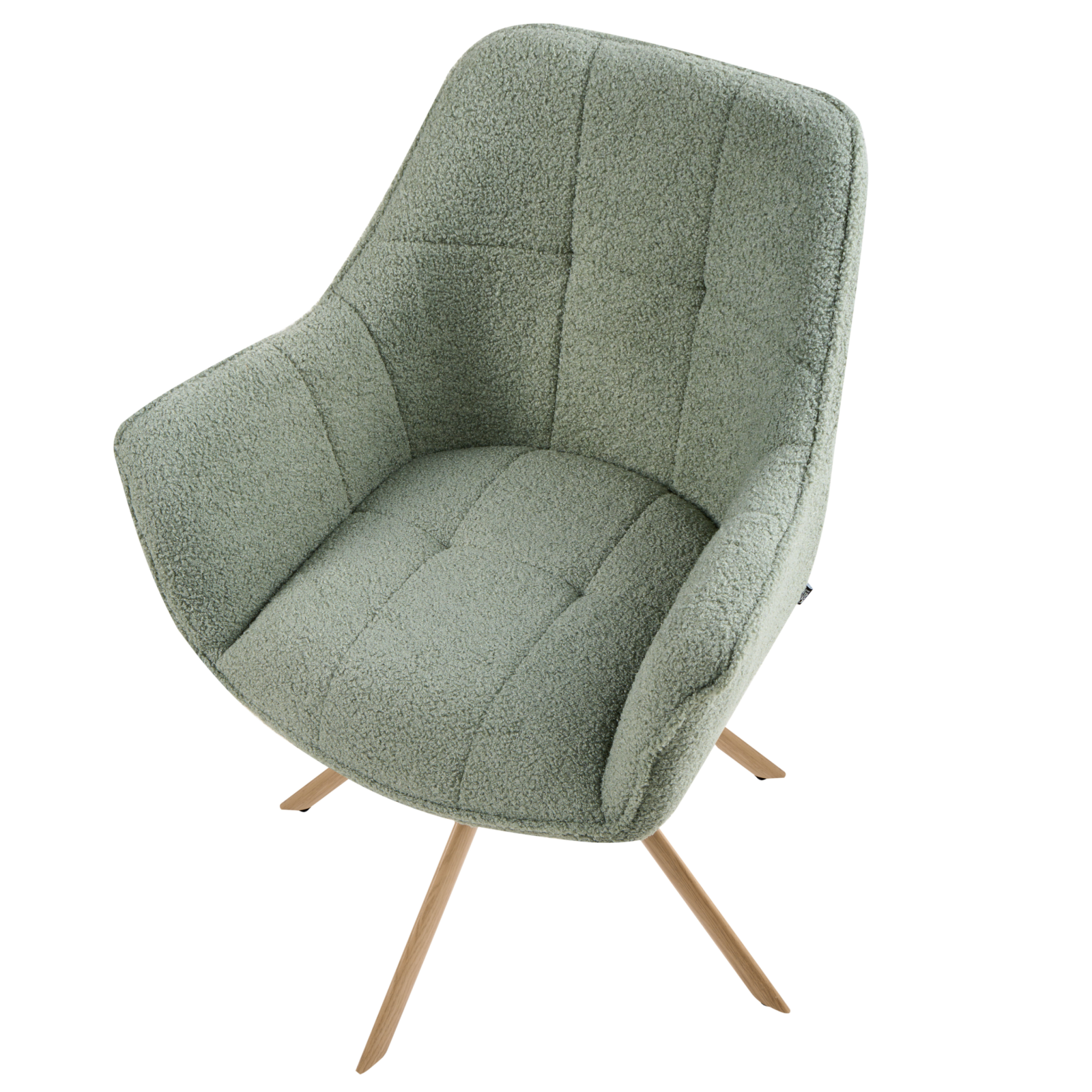 Scaun de accent pivotant. Bucură-te de confort și flexibilitate cu acest scaun pivotant elegant. Șezutul adânc este îmbrăcat în bouclé moale, cu textură noduroasă, iar picioarele din fier au un finisaj cu aspect de lemn pentru durabilitate maximă. Rotirea la 360° completează designul, oferind funcționalitate și stil oricărei mese. Detalii: Tip de Produs: Scaun dining. Stil: Scandinav. Culoare: Verde. Nuanță: Verde deschis. Material: Țesătură. Material primar: Boucle. Material secundar: Fier. Materialul cadrului: Metal. Detalii material picioare: Metal. Material scaun: Spumă. Compoziția materialului: 100% Poliester. Cotiere: Da. Finisaj: Transfer de căldură. Stivuire: Nu. Dimensiuni: Înălțimea cotierei: 65 cm. Adâncime: 69 cm. Înălțimea scaunului: 50 cm. Lățime: 64 cm. Înălțime: 85 cm. Suprafața de ședere: 45x39 cm. Greutate: 9 kg. Capacitatea de greutate: 120 kg. Oferta incude: 1 x Scaun. Caracteristici cheie: Rotire de 360°, Formă curbată pentru a maximiza confortul, Picioare robuste pentru o stabilitate optimă, Stil minimalist scandinav, Tapițerie din țesătură de înaltă calitate. Asamblare: Necesită asamblare parțială.5-15 min. Informații suplimentare: Pentru o stabilitate și siguranță maximă în utilizare, se recomandă să verificați la aproximativ 2 săptămâni după instalare dacă produsul a fost asamblat corect. De asemenea, se recomandă să verificați dacă șuruburile sunt strânse corect, o dată la 3 luni. Trebuie remarcat faptul că lemnul este un material natural și, prin urmare, fiecare obiect din lemn diferă de celelalte. Diferențele de culoare și de textură a suprafeței (noduri de lemn, dungi etc.) sunt caracteristici intrinseci ale materialului și, prin urmare, nu sunt considerate defecte ale produsului. Sfaturi de întreținere: Boucle: 1.Vă rugăm să curățați cu un șampon uscat și un burete umed sau cu un detergent ușor. 2.Aspirati folosind un accesoriu potrivit. Fier: 1.Curățați cu un detergent delicat și o cârpă moale, apoi ștergeți bine. 2.Pentru a evita zgârieturile, nu folosiți produse de curățare abrazive. 3.Pentru elementele din cupru sau crom, folosiți un agent de lustruire.