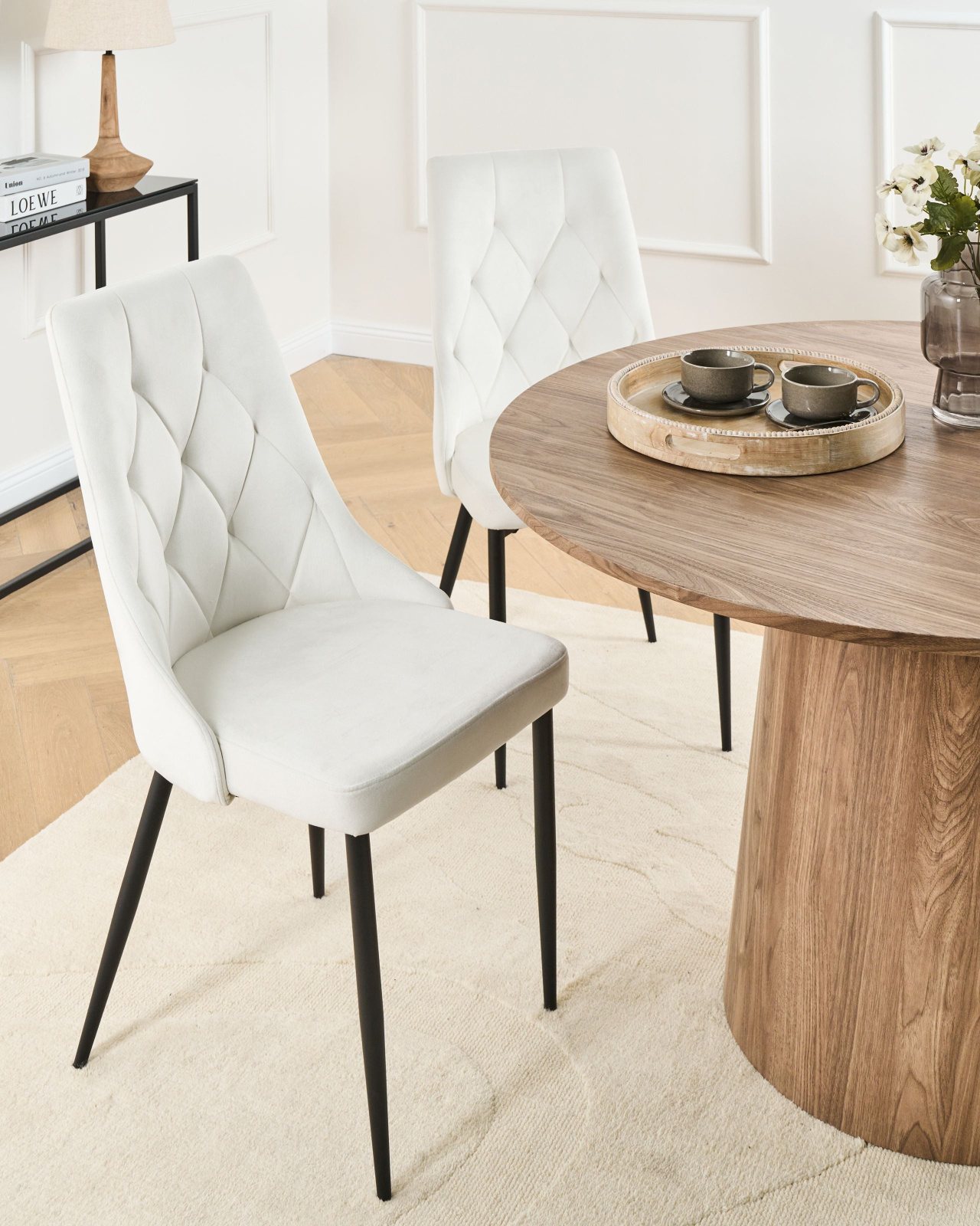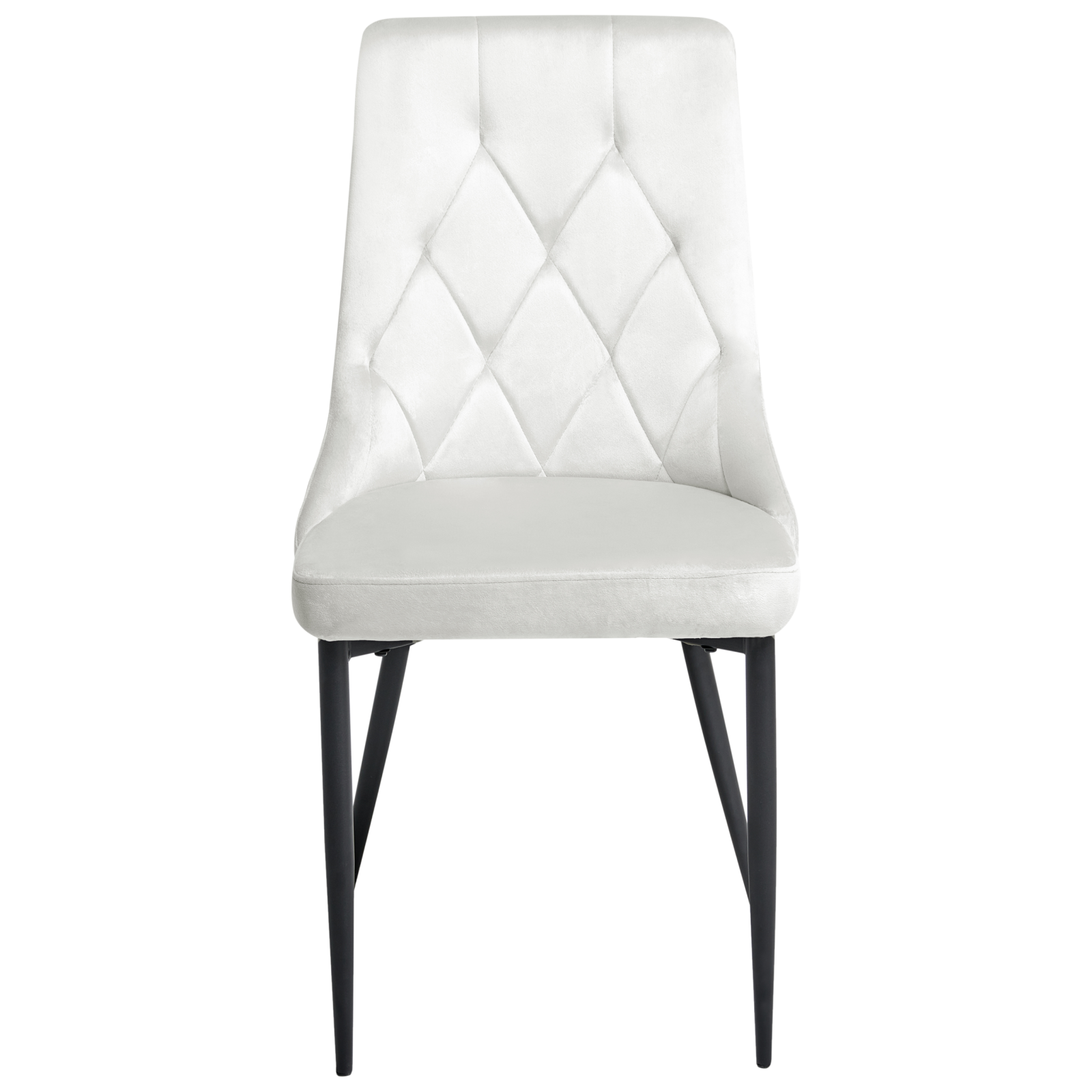 Scaune moderne tapițate. Adaugă o notă de eleganță rafinată în orice încăpere cu acest set de scaune de dining fără brațe. Tapițate în catifea fină, de calitate superioară, și decorate cu un capitonaj sofisticat, aceste scaune îmbină perfect confortul cu stilul. Picioarele rezistente din metal le oferă stabilitate pe termen lung, iar designul lor glam se potrivește ușor cu diferite stiluri de amenajare — perfecte pentru zona de dining sau living, acolo unde vrei un plus de rafinament și versatilitate. Detalii: Tip de Produs: Scaun dining. Stil: Glamour. Culoare: Alb. Culoarea cadrului: Negru. Nuanță: Alb-murdar. Material: Țesătură. Material primar: Catifea. Material secundar: Fier. Detalii material picioare: Metal. Material scaun: Catifea. Compoziția materialului: 100% Poliester. Cotiere: Nu. Finisaj: Acoperire pulverizată. Stivuire: Nu. Dimensiuni: Adâncime: 61 cm. Înălțimea scaunului: 50 cm. Lățime: 46 cm. Înălțime: 96 cm. Suprafața de ședere: 46x46 cm. Greutate: 5 kg. Capacitatea de greutate: 150 kg. Oferta incude: 2 x Scaun. Caracteristici cheie: Potrivit pentru orice stil de decor interior, Design elegant, Țesătură de catifea netedă și mătăsoasă, Execuție robustă, Ușor de mutat. Asamblare: Necesită asamblare parțială.5-15 min. Informații suplimentare: Pentru o stabilitate și siguranță maximă în utilizare, se recomandă să verificați la aproximativ 2 săptămâni după instalare dacă produsul a fost asamblat corect. De asemenea, se recomandă să verificați dacă șuruburile sunt strânse corect, o dată la 3 luni. Rețineți că țesătura de catifea poate avea un aspect puțin diferit atunci când este expusă la lumină; tinde să fie mai strălucitoare și mai luminoasă în lumina soarelui, în timp ce în lumină artificială are un ton diferit, mai închis. Datorită tipului de țesătură, tonul catifelei poate varia, de asemenea, atunci când este atinsă din direcții diferite. Pentru a uniformiza culoarea și a scăpa de lovituri și cute, materialul trebuie mângâiat cu palma deschisă într-o singură direcție, frecat cu o cârpă umedă sau călcat cu abur. Sfaturi de întreținere: Catifea: 1.Vă rugăm să curățați cu un șampon uscat și un burete umed sau cu un detergent ușor. 2.Aspirati folosind un accesoriu potrivit. Fier: 1.Curățați cu un detergent delicat și o cârpă moale, apoi ștergeți bine. 2.Pentru a evita zgârieturile, nu folosiți produse de curățare abrazive. 3.Pentru elementele din cupru sau crom, folosiți un agent de lustruire.