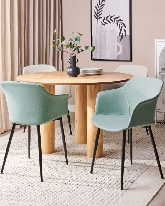 Scaune dining tapițate. Adaugă un strop de prospețime și stil zonei de dining cu acest set de scaune tapițate într-o nuanță delicată de verde mentă. Designul modern, accentuat de picioarele negre subțiri, se integrează cu ușurință în interioare contemporane sau cu influențe retro. Materialul durabil, ușor de întreținut, menține un aspect impecabil în timp, fără efort. O alegere inspirată pentru un spațiu confortabil și plin de personalitate. Detalii: Tip de Produs: Scaun dining. Stil: Retro. Culoare: Verde. Nuanță: Verde mentă. Material: Țesătură. Material primar: Țesătură. Material secundar: Fier. Detalii material picioare: Metal. Material scaun: Țesătură. Compoziția materialului: 100% Poliester. Cotiere: Da. Finisaj: Acoperire pulverizată. Stivuire: Nu. Dimensiuni: Înălțimea cotierei: 69 cm. Adâncime: 45 cm. Grosimea scaunului: 3 cm. Înălțimea scaunului: 45 cm. Lățime: 43 cm. Înălțime: 82 cm. Suprafața de ședere: 43x47 cm. Greutate: 6 kg. Capacitatea de greutate: 120 kg. Oferta incude: 2 x Scaun. Caracteristici cheie: Cotiere confortabile, Scaun spațios și confortabil, Picioare robuste pentru o stabilitate optimă, Stil retro, Materiale de cea mai bună calitate, Capace pentru picioare pentru protecția suprafeței. Asamblare: Picioare neasamblate.5-15 min. Informații suplimentare: Pentru o stabilitate și siguranță maximă în utilizare, se recomandă să verificați la aproximativ 2 săptămâni după instalare dacă produsul a fost asamblat corect. De asemenea, se recomandă să verificați dacă șuruburile sunt strânse corect, o dată la 3 luni. Sfaturi de întreținere: Țesătură: 1.Vă rugăm să curățați cu un șampon uscat și un burete umed sau cu un detergent ușor. 2.Aspirati folosind un accesoriu potrivit. Fier: 1.Curățați cu un detergent delicat și o cârpă moale, apoi ștergeți bine. 2.Pentru a evita zgârieturile, nu folosiți produse de curățare abrazive. 3.Pentru elementele din cupru sau crom, folosiți un agent de lustruire.
