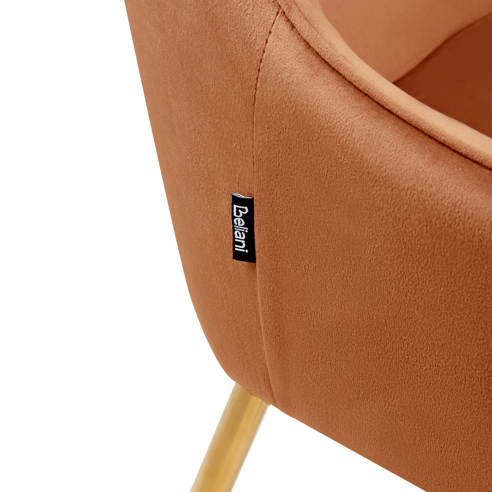 Scaune dining tapițate. Cu picioare subțiri, aurii și tapițerie din catifea, aceste scaune adaugă un farmec retro atemporal oricărui decor. Proiectate pentru confort, au șezuturi largi, bine căptușite, și cotiere poziționate ergonomic. Detaliile decorative de pe spătar le oferă un plus de eleganță, făcându-le ideale ca piese centrale în zone de dining în stil glamour, modern sau industrial. Detalii: Tip de Produs: Scaun dining. Stil: Retro. Culoare: Portocaliu. Material: Țesătură. Material primar: Catifea. Material secundar: Fier. Detalii material picioare: Metal. Material scaun: Țesătură. Compoziția materialului: 100% Poliester. Cotiere: Da. Finisaj: Acoperire pulverizată. Stivuire: Nu. Dimensiuni: Înălțimea cotierei: 61 cm. Adâncime: 63 cm. Grosimea scaunului: 7 cm. Înălțimea scaunului: 50 cm. Lățime: 54 cm. Înălțime: 87 cm. Suprafața de ședere: 46x41 cm. Greutate: 6 kg. Capacitatea de greutate: 120 kg. Oferta incude: 2 x Scaun. Caracteristici cheie: Cotiere confortabile, Stil retro, Se adaptează la orice stil de interior, Materiale de înaltă calitate, Țesătură de catifea netedă și mătăsoasă, Capace pentru picioare pentru protecția suprafeței. Asamblare: Picioare neasamblate.20-40 min. Informații suplimentare: Pentru o stabilitate și siguranță maximă în utilizare, se recomandă să verificați la aproximativ 2 săptămâni după instalare dacă produsul a fost asamblat corect. De asemenea, se recomandă să verificați dacă șuruburile sunt strânse corect, o dată la 3 luni. Rețineți că țesătura de catifea poate avea un aspect puțin diferit atunci când este expusă la lumină; tinde să fie mai strălucitoare și mai luminoasă în lumina soarelui, în timp ce în lumină artificială are un ton diferit, mai închis. Datorită tipului de țesătură, tonul catifelei poate varia, de asemenea, atunci când este atinsă din direcții diferite. Pentru a uniformiza culoarea și a scăpa de lovituri și cute, materialul trebuie mângâiat cu palma deschisă într-o singură direcție, frecat cu o cârpă umedă sau călcat cu abur. Sfaturi de întreținere: Catifea: 1.Vă rugăm să curățați cu un șampon uscat și un burete umed sau cu un detergent ușor. 2.Aspirati folosind un accesoriu potrivit. Fier: 1.Curățați cu un detergent delicat și o cârpă moale, apoi ștergeți bine. 2.Pentru a evita zgârieturile, nu folosiți produse de curățare abrazive. 3.Pentru elementele din cupru sau crom, folosiți un agent de lustruire.