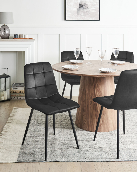 Scaune dining cu design modern. Redefinește-ți spațiul de dining cu acest set de patru scaune din catifea, care îmbină perfect eleganța cu confortul. Tonurile neutre și designul simplu, dar rafinat, adaugă o notă primitoare și sofisticată oricărei încăperi. Tapițeria catifelată îți oferă senzația de răsfăț la fiecare ședere, iar picioarele din fier negru asigură stabilitate și un aspect modern. Ideal pentru seri relaxate sau evenimente speciale. Detalii: Tip de Produs: Scaun dining. Stil: Modern. Culoare: Negru. Culoarea cadrului: Negru. Material: Țesătură. Material primar: Catifea. Material secundar: Fier. Materialul cadrului: Metal. Detalii material picioare: Metal. Material scaun: Țesătură. Compoziția materialului: 100% Poliester. Cotiere: Nu. Finisaj: Acoperire pulverizată. Stivuire: Nu. Dimensiuni: Adâncime: 62 cm. Înălțimea scaunului: 43 cm. Lățime: 45 cm. Înălțime: 88 cm. Suprafața de ședere: 40x45 cm. Greutate: 4 kg. Capacitatea de greutate: 150 kg. Oferta incude: 4 x Scaun. Caracteristici cheie: Design modern, Se adaptează la orice stil de interior, Tapițerie din țesătură de înaltă calitate, Structură proiectată pentru a oferi stabilitate maximă, Capace pentru picioare pentru protecția suprafeței. Asamblare: Picioare neasamblate.20-40 min. Informații suplimentare: Pentru o stabilitate și siguranță maximă în utilizare, se recomandă să verificați la aproximativ 2 săptămâni după instalare dacă produsul a fost asamblat corect. De asemenea, se recomandă să verificați dacă șuruburile sunt strânse corect, o dată la 3 luni. Rețineți că țesătura de catifea poate avea un aspect puțin diferit atunci când este expusă la lumină; tinde să fie mai strălucitoare și mai luminoasă în lumina soarelui, în timp ce în lumină artificială are un ton diferit, mai închis. Datorită tipului de țesătură, tonul catifelei poate varia, de asemenea, atunci când este atinsă din direcții diferite. Pentru a uniformiza culoarea și a scăpa de lovituri și cute, materialul trebuie mângâiat cu palma deschisă într-o singură direcție, frecat cu o cârpă umedă sau călcat cu abur. Sfaturi de întreținere: Catifea: 1.Vă rugăm să curățați cu un șampon uscat și un burete umed sau cu un detergent ușor. 2.Aspirati folosind un accesoriu potrivit. Fier: 1.Curățați cu un detergent delicat și o cârpă moale, apoi ștergeți bine. 2.Pentru a evita zgârieturile, nu folosiți produse de curățare abrazive. 3.Pentru elementele din cupru sau crom, folosiți un agent de lustruire.