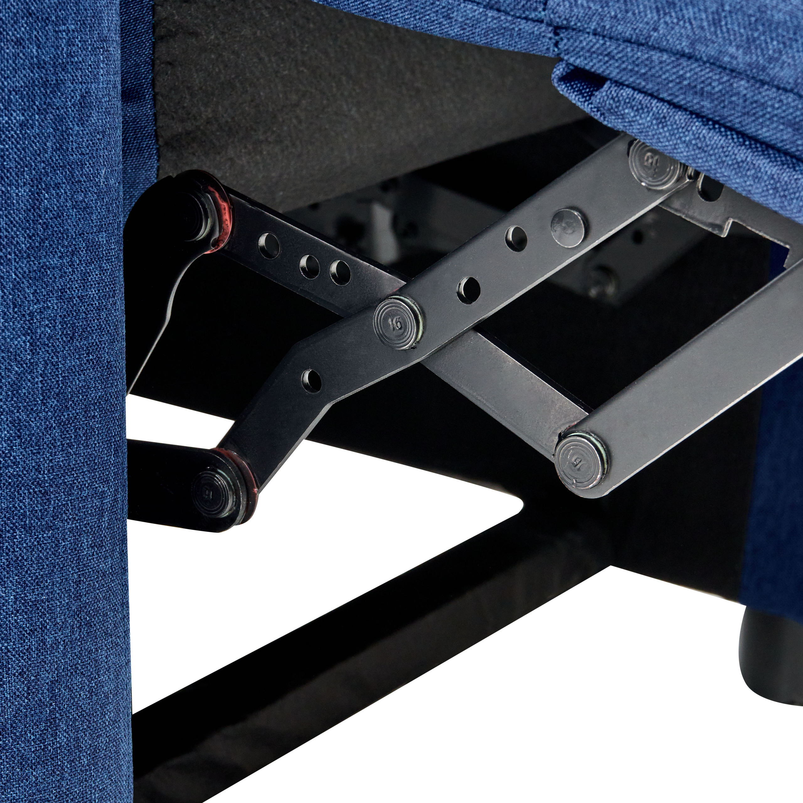Fotoliu tapițat cu funcție de înclinare. Relaxează-te după o zi lungă în acest fotoliu confortabil, tapițat cu țesătură elegantă și rezistentă din imitație de in. Mecanismul manual de reclinare, ușor de folosit, îți permite să ajustezi spătarul și suportul pentru picioare în poziția preferată, pentru o relaxare completă. Îmbinând elemente de design clasic și modern, acest fotoliu se integrează perfect în orice living, oferind atât stil, cât și confort, ideal pentru momentele de relaxare în fața televizorului sau un scurt pui de somn. Detalii: Tip de Produs: Scaun reclinabil. Stil: Tradițional. Culoare: Albastru. Nuanță: Bleumarin. Material: Țesătură. Material primar: In sintetic. Material secundar: Placaj. Căptușeală: Spumă. Detalii material picioare: Material sintetic. Material scaun: Țesătură. Compoziția materialului: 100% Poliester. Stilul cotierei: Liniar. Cotiere: Da. Protecții pentru picioare incluse: Da. Model: Culoare solidă. Reclinabil: Da. Structura scaunului: Placaj. Densitatea pernei scaunului: 25-50 kg/m3. Dimensiuni: Înălțimea cotierei: 56 cm. Adâncime: 74 cm. Înălțimea scaunului: 44 cm. Lățime: 66 cm. Înălțime: 103 cm. Suprafața de ședere: 50x54 cm. Greutate: 22 kg. Capacitatea de greutate: 150 kg. Oferta incude: 1 x Fotoliu. Caracteristici cheie: Spătar și suport pentru picioare reglabile, Poziție de șezut relaxată, Design tradițional cu o notă modernă, Tapițerie din țesătură de înaltă calitate, Capace pentru picioare pentru protecția suprafeței. Asamblare: Necesită asamblare parțială.20-40 min. Sfaturi de întreținere: In sintetic: 1.Aspirati folosind un accesoriu potrivit. 2.Vă rugăm să curățați cu un șampon uscat și un burete umed sau cu un detergent ușor.