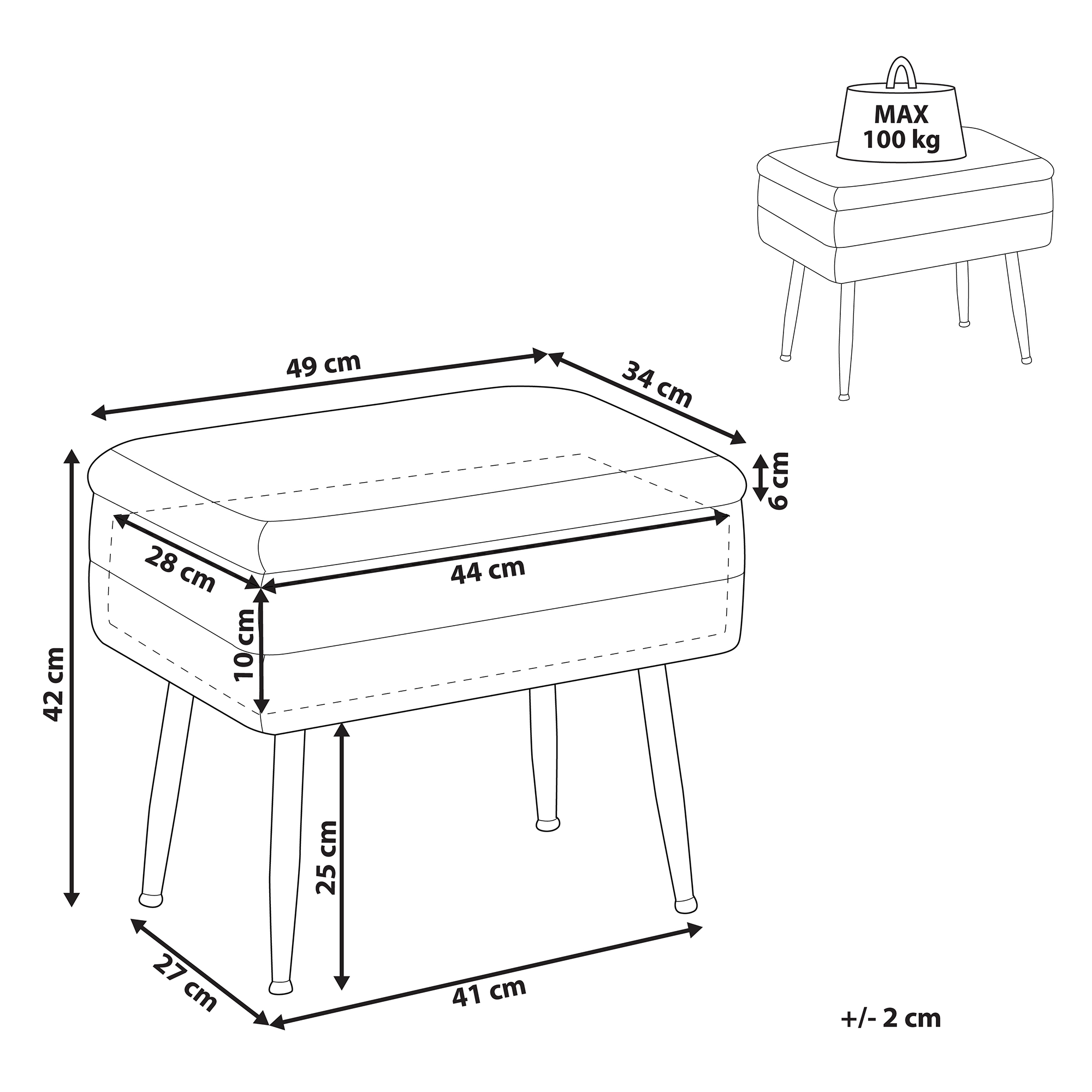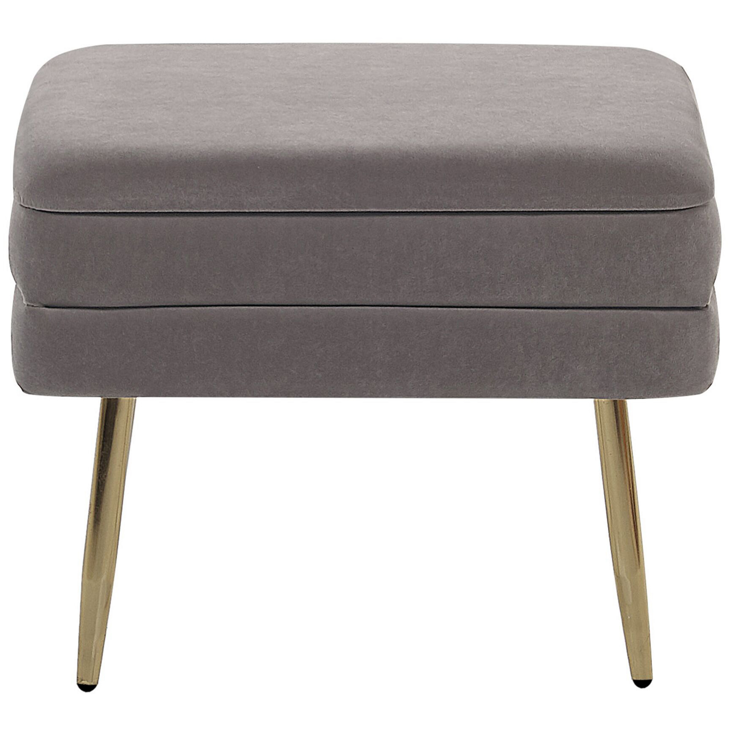 Bancă cu spațiu de depozitare pentru living. Decorează-ți livingul sau dormitorul cu această bancă cu depozitare versatilă. Tapițată într-o nuanță rafinată de gri, din catifea durabilă, și completată de picioare aurii, această piesă adaugă un accent glamour care va atrage toate privirile. Compartimentul practic și spațios de depozitare, permite păstrarea la îndemână a obiectelor personale. Datorită dimensiunilor sale compacte, poate fi integrată cu ușurință în spații mai mici, precum holuri sau dulapuri, fiind un element funcțional și stilat în orice colț al casei tale. Detalii: Tip de Produs: Scaun taburet. Stil: Modern. Culoare: Gri. Material: Țesătură. Material primar: Catifea. Material secundar: Material nețesut. Detalii material picioare: Metal. Compoziția materialului: 100% Poliester. Formă: Rectangulară. Protecții pentru picioare incluse: Da. Depozitare: Da. Dimensiuni: Adâncime: 34 cm. Grosimea scaunului: 6 cm. Lățime: 49 cm. Înălțime: 43 cm. Suprafața de ședere: 49x34 cm. Greutate: 5 kg. Capacitatea de greutate: 100 kg. Oferta incude: 1 x Bancă. Caracteristici cheie: Ideal atât pentru dormitor, cât și pentru camera de zi, Design elegant, Țesătură de catifea netedă și mătăsoasă, Spațiu funcțional pentru fiecare obiect mic, Mobilier multifuncțional. Asamblare: Picioare neasamblate.5-15 min. Informații suplimentare: Rețineți că țesătura de catifea poate avea un aspect puțin diferit atunci când este expusă la lumină; tinde să fie mai strălucitoare și mai luminoasă în lumina soarelui, în timp ce în lumină artificială are un ton diferit, mai închis. Datorită tipului de țesătură, tonul catifelei poate varia, de asemenea, atunci când este atinsă din direcții diferite. Pentru a uniformiza culoarea și a scăpa de lovituri și cute, materialul trebuie mângâiat cu palma deschisă într-o singură direcție, frecat cu o cârpă umedă sau călcat cu abur. Sfaturi de întreținere: Catifea: 1.Vă rugăm să curățați cu un șampon uscat și un burete umed sau cu un detergent ușor. 2.Aspirati folosind un accesoriu potrivit.