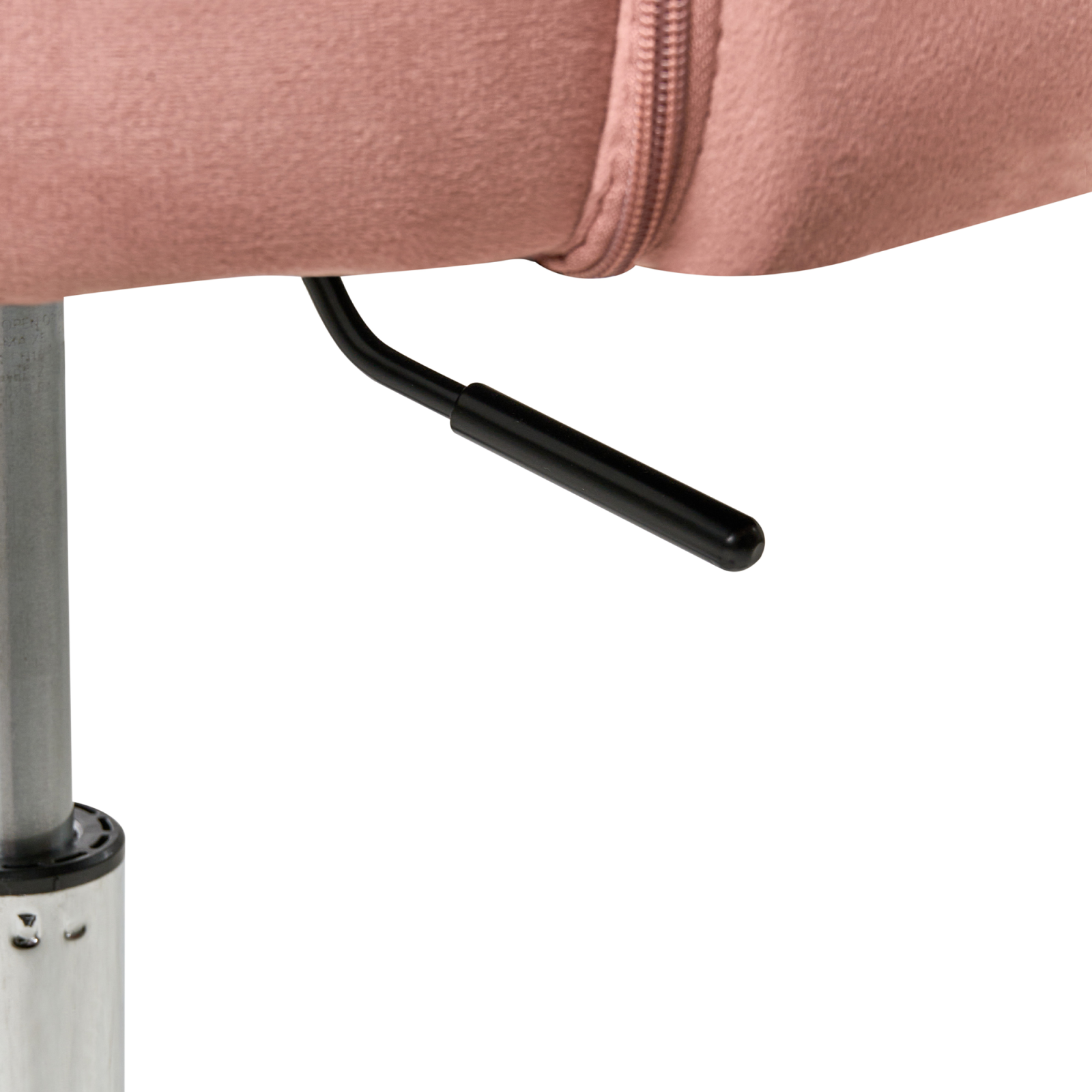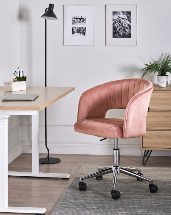 Scaun de birou pivotant. Răsfață-te în confortul acestui scaun de birou tapițat, care îți oferă o experiență plăcută și relaxantă pe toată durata zilei de muncă. Spătarul curbat, capitonat, adaugă un plus de eleganță, oferind suport și un design vizual atrăgător. Datorită reglării convenabile a înălțimii cu sistem pneumatic, poți ajusta cu ușurință scaunul la poziția dorită. Rotilele pivotante permit mișcări fluide, iar tapițeria strălucitoare conferă un farmec sofisticat. Este piesa perfectă pentru birou, dar se potrivește de minune și în living sau dormitor. Detalii: Tip de Produs: Scaun de birou. Stil: Scandinav. Culoare: Roz. Material: Țesătură. Material primar: Catifea. Material secundar: Placaj. Detalii material picioare: Material sintetic. Material scaun: Țesătură. Compoziția materialului: 100% Poliester. Rotire la 360°: Da. Piese reglabile: Înălțime scaun. Cotiere: Da. Finisaj: Acoperire pulverizată. Protecții pentru picioare incluse: Nu. Înclinare: Nu. Dimensiuni: Adâncime: 57 cm. Înălțimea scaunului: 44-54 cm. Lățime: 57 cm. Înălțime: 78-88 cm. Suprafața de ședere: 47x47 cm. Greutate: 7 kg. Capacitatea de greutate: 120 kg. Oferta incude: 1 x Scaun. Caracteristici cheie: Reglarea pneumatică a înălțimii scaunului, Funcție de frână de siguranță care blochează roțile pentru siguranță, se deblochează pentru mobilitate. Cu un tufting decorativ clasic, Completare elegantă pentru orice interior, Adaugă o notă de stil în orice cameră, Țesătură de catifea netedă și mătăsoasă. Asamblare: Necesită asamblare parțială.20-40 min. Informații suplimentare: Pentru o stabilitate și siguranță maximă în utilizare, se recomandă să verificați la aproximativ 2 săptămâni după instalare dacă produsul a fost asamblat corect. De asemenea, se recomandă să verificați dacă șuruburile sunt strânse corect, o dată la 3 luni. Rețineți că țesătura de catifea poate avea un aspect puțin diferit atunci când este expusă la lumină; tinde să fie mai strălucitoare și mai luminoasă în lumina soarelui, în timp ce în lumină artificială are un ton diferit, mai închis. Datorită tipului de țesătură, tonul catifelei poate varia, de asemenea, atunci când este atinsă din direcții diferite. Pentru a uniformiza culoarea și a scăpa de lovituri și cute, materialul trebuie mângâiat cu palma deschisă într-o singură direcție, frecat cu o cârpă umedă sau călcat cu abur. Sfaturi de întreținere: Catifea: 1.Vă rugăm să curățați cu un șampon uscat și un burete umed sau cu un detergent ușor. 2.Aspirati folosind un accesoriu potrivit. Oțel: 1.Curățați cu un detergent delicat și o cârpă moale, apoi ștergeți bine. 2.Pentru a evita zgârieturile, nu folosiți produse de curățare abrazive. 3.Pentru elementele din cupru sau crom, folosiți un agent de lustruire.