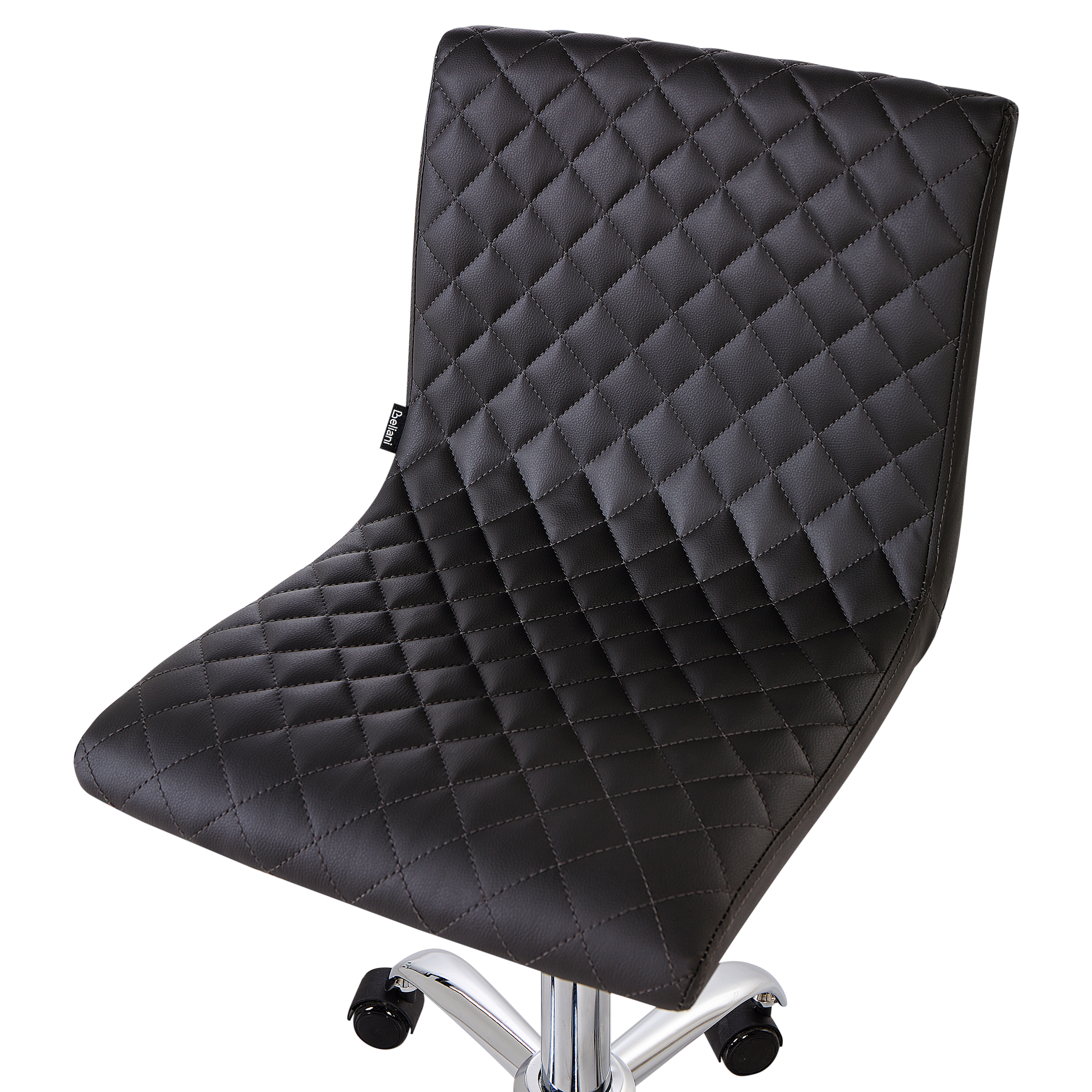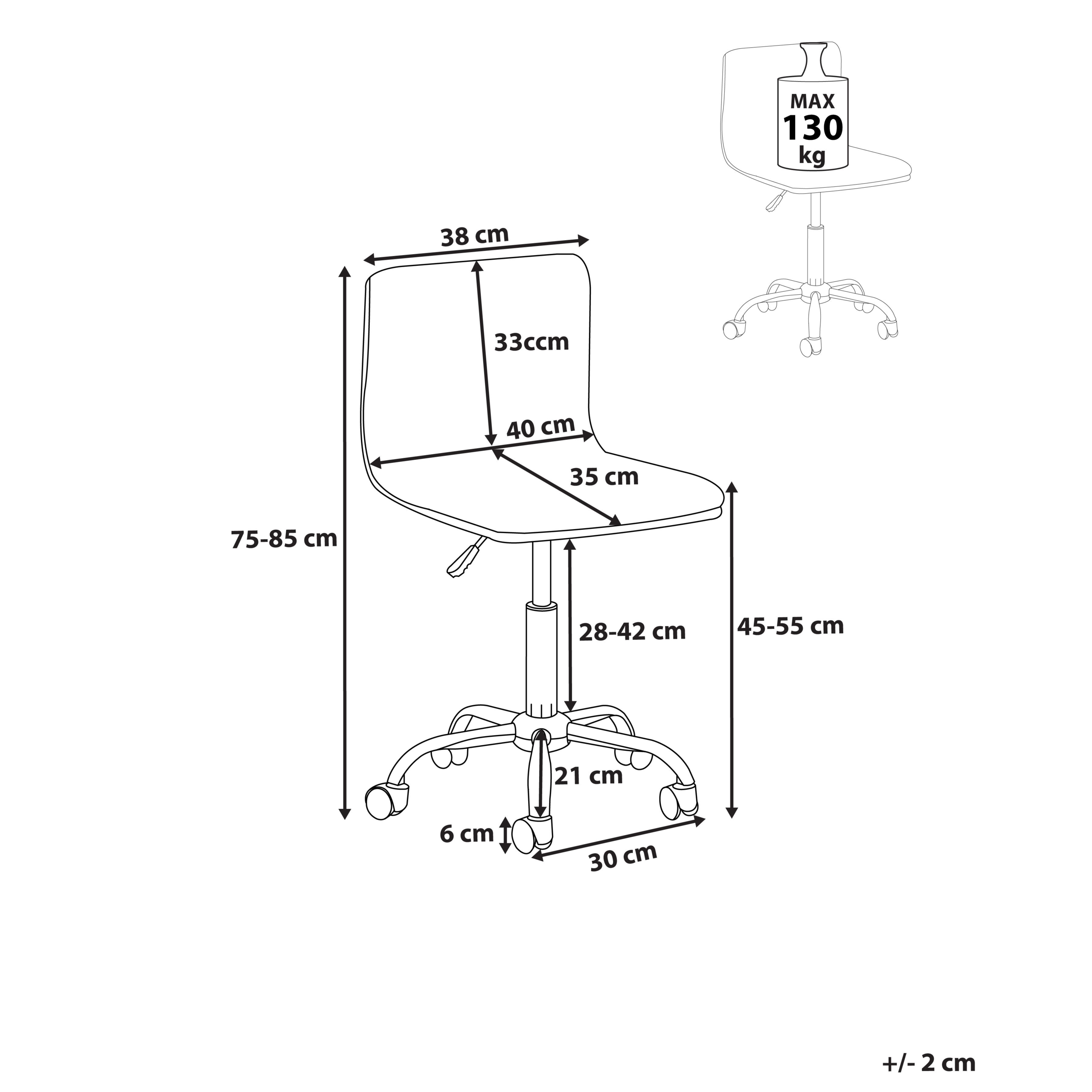 Scaun de birou cu spătar capitonat. Îmbunătățește-ți spațiul de lucru cu acest scaun decorativ și practic, ce combină funcționalitatea cu un design elegant. Șezutul capitonat oferă confort maxim, iar tapițeria din material piele sintetică de calitate superioară, cu model sofisticat, completează aspectul rafinat. Baza solidă din metal este dispune de mecanism pneumatic pe gaz, permițând reglarea rapidă a înălțimii după preferințe. Detalii: Tip de Produs: Scaun de birou. Stil: Retro. Culoare: Negru. Material: Piele ecologică. Material primar: Piele ecologică. Material secundar: Fier. Detalii material picioare: Metal. Material scaun: Piele ecologică. Compoziția materialului: 100% Piele sintetică. Rotire la 360°: Da. Piese reglabile: Înălțime scaun. Cotiere: Nu. Finisaj: Cromat. Protecții pentru picioare incluse: Nu. Înclinare: Nu. Dimensiuni: Adâncime: 38 cm. Înălțimea scaunului: 45-55 cm. Lățime: 38 cm. Înălțime: 75-85 cm. Suprafața de ședere: 40x35 cm. Greutate: 6 kg. Capacitatea de greutate: 130 kg. Oferta incude: 1 x Scaun. Caracteristici cheie: Rotire de 360°, Reglarea pneumatică a înălțimii scaunului, Roți pivotante cu rulare lină, Confort maxim, Design modern. Asamblare: Necesită asamblare completă.5-15 min. Informații suplimentare: Pentru o stabilitate și siguranță maximă în utilizare, se recomandă să verificați la aproximativ 2 săptămâni după instalare dacă produsul a fost asamblat corect. De asemenea, se recomandă să verificați dacă șuruburile sunt strânse corect, o dată la 3 luni. Sfaturi de întreținere: Piele ecologică: 1.O dată pe săptămână, ștergeți cu o cârpă umedă și uscați după curățare. Nu folosiți substanțe uleioase. 2.Vă rugăm să curățați cu apă distilată și să folosiți detergenți pe bază de săpun pentru petele dificile. 3.Utilizați doar soluții de curățare delicate și balsamuri dedicate pielii ecologice. 4.Aspirati folosind un accesoriu potrivit. Fier: 1.Curățați cu un detergent delicat și o cârpă moale, apoi ștergeți bine. 2.Pentru a evita zgârieturile, nu folosiți produse de curățare abrazive. 3.Pentru elementele din cupru sau crom, folosiți un agent de lustruire.