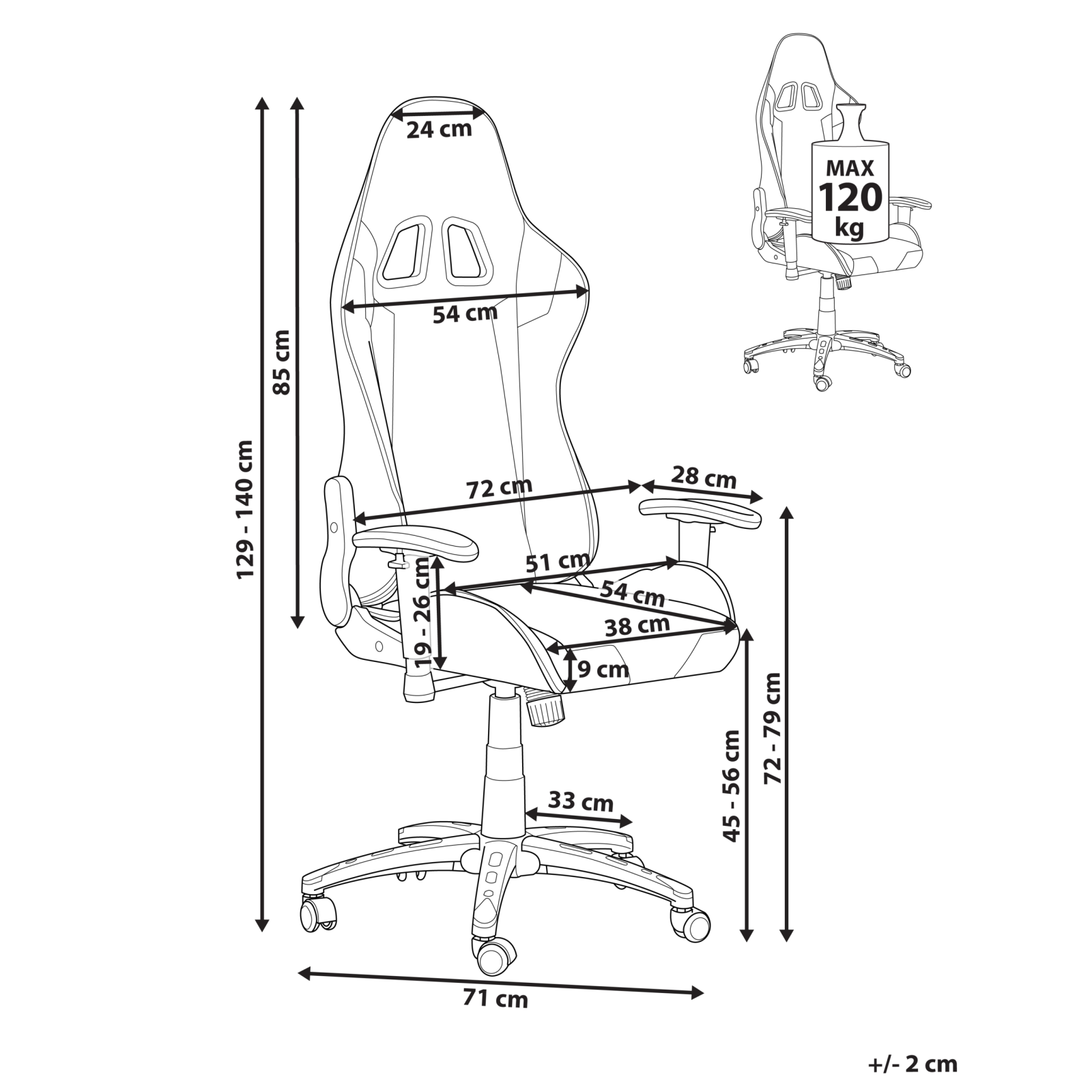Scaun de birou cu reglaj pe înălțime. Reînnoiește-ți biroul sau biroul într-o clipă cu acest scaun de lucru modern. Fabricat din piele sintetică moale și durabilă de înaltă calitate, dispune de cotiere confortabile și de un mecanism practic de reglare a înălțimii. Perna mică a spătarului este concepută pentru a ușura zona gâtului. Detalii: Tip de Produs: Scaun gaming. Stil: Retro. Culoare: Negru. Material: Piele ecologică. Material primar: Piele ecologică. Material secundar: Fier. Detalii material picioare: Metal. Material scaun: Piele ecologică. Compoziția materialului: 100% Piele PVC. Rotire la 360°: Da. Piese reglabile: Spătar. Cotiere: Da. Înclinare: Da. Dimensiuni: Înălțimea cotierei: 19-26 cm. Adâncime: 71 cm. Înălțimea scaunului: 45-56 cm. Lățime: 71 cm. Înălțime: 129-140 cm. Suprafața de ședere: 38x54 cm. Greutate: 21 kg. Capacitatea de greutate: 120 kg. Oferta incude: 1 x Scaun de birou. Caracteristici cheie: Rotire de 360°, Reglarea pneumatică a înălțimii scaunului, Reclinarea spătarului până la aproape 180°. Confort maxim la șezut, Spătar ergonomic înclinabil, Design sportiv, Cotiere reglabile, Spătar reglabil. Asamblare: Necesită asamblare completă.20-40 min. Informații suplimentare: Pentru o stabilitate și siguranță maximă în utilizare, se recomandă să verificați la aproximativ 2 săptămâni după instalare dacă produsul a fost asamblat corect. De asemenea, se recomandă să verificați dacă șuruburile sunt strânse corect, o dată la 3 luni. Sfaturi de întreținere: Piele ecologică: 1.O dată pe săptămână, ștergeți cu o cârpă umedă și uscați după curățare. Nu folosiți substanțe uleioase. 2.Vă rugăm să curățați cu apă distilată și să folosiți detergenți pe bază de săpun pentru petele dificile. 3.Utilizați doar soluții de curățare delicate și balsamuri dedicate pielii ecologice. 4.Aspirati folosind un accesoriu potrivit. PVC: 1.Curățați cu un detergent delicat și o cârpă moale, apoi ștergeți bine.