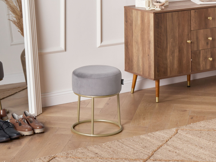 Taburet rotund cu bază aurie. Dacă vrei să adaugi o notă glam încăperii tale, alege acest taburet multifuncțional. Tapițat cu catifea moale, dar rezistentă, și susținut de o bază solidă din metal auriu, oferă un plus de rafinament atât în interioarele moderne, cât și în cele clasice. Poate fi folosit ca loc suplimentar de șezut pentru oaspeți, sprijin confortabil pentru picioare după o zi obositoare sau ca suport pentru o tavă cu gustări. Detalii: Tip de Produs: Scaun taburet. Stil: Modern. Culoare: Gri. Material: Țesătură. Material primar: Catifea. Material secundar: Fier. Căptușeală: Spumă. Compoziția materialului: 100% Poliester. Formă: Rotundă. Model: Culoare solidă. Densitatea pernei scaunului: 30 kg/m3. Depozitare: Nu. Dimensiuni: Adâncime: 35 cm. Lățime: 35 cm. Înălțime: 40 cm. Suprafața de ședere: 35x35 cm. Greutate: 3.5 kg. Capacitatea de greutate: 150 kg. Oferta incude: 1 x Pouf. Caracteristici cheie: Confort maxim, Foarte chic, Tapițerie din țesătură de înaltă calitate, Ușor de mutat, Mobilier multifuncțional. Asamblare: Nu necesită asamblare. Informații suplimentare: Rețineți că țesătura de catifea poate avea un aspect puțin diferit atunci când este expusă la lumină; tinde să fie mai strălucitoare și mai luminoasă în lumina soarelui, în timp ce în lumină artificială are un ton diferit, mai închis. Datorită tipului de țesătură, tonul catifelei poate varia, de asemenea, atunci când este atinsă din direcții diferite. Pentru a uniformiza culoarea și a scăpa de lovituri și cute, materialul trebuie mângâiat cu palma deschisă într-o singură direcție, frecat cu o cârpă umedă sau călcat cu abur. Sfaturi de întreținere: Catifea: 1.Vă rugăm să curățați cu un șampon uscat și un burete umed sau cu un detergent ușor. 2.Aspirati folosind un accesoriu potrivit. Fier: 1.Curățați cu un detergent delicat și o cârpă moale, apoi ștergeți bine. 2.Pentru a evita zgârieturile, nu folosiți produse de curățare abrazive. 3.Pentru elementele din cupru sau crom, folosiți un agent de lustruire.