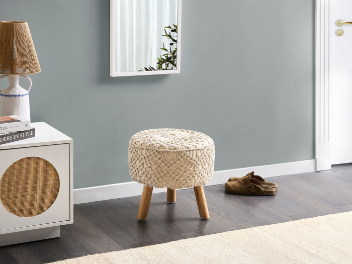 Taburet handmade în stil boho. Acest taburet stilat adaugă un plus de farmec oricărui interior boho. Șezutul decorat cu macrame handmade în nuanță bej, se sprijină pe picioare din lemn pentru o stabilitate optimă. Ideal ca loc suplimentar de ședere sau ca accent decorativ, completează perfect orice spațiu. Detalii: Tip de Produs: Scaun taburet. Stil: Boho. Culoare: Bej. Material: Țesătură. Material primar: Bumbac. Material secundar: Lemn de eucalipt. Căptușeală: Spumă. Compoziția materialului: 100% Bumbac. Formă: Rotundă. Model: Imprimeu geometric. Densitatea pernei scaunului: 32 kg/m3. Depozitare: Nu. Dimensiuni: Adâncime: 40 cm. Lățime: 40 cm. Înălțime: 44 cm. Suprafața de ședere: 40x40 cm. Greutate: 3.7 kg. Capacitatea de greutate: 100 kg. Oferta incude: 1 x Scaun. Caracteristici cheie: Realizat manual cu mare atenție la detalii, Ideal atât pentru dormitor, cât și pentru camera de zi, Mobilier multifuncțional, Ușor de mutat, Picioare cu tampoane de cauciuc antiderapante. Asamblare: Nu necesită asamblare. Informații suplimentare: Fiecare piesă este realizată manual și unică, astfel încât textura și culorile pot fi ușor diferite de cele prezentate în fotografie. Sfaturi de întreținere: Bumbac: 1.Curățați numai cu o cârpă uscată. Nu folosiți detergenți.