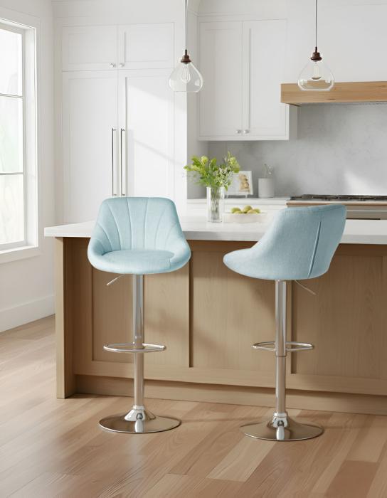Scaune de bar clasice cu înălțime reglabilă. Un set de două scaune de bar concepute pentru confort și funcționalitate. Șezutul tapițat în țesătură asigură o experiență plăcută la ședere, iar baza solidă oferă durabilitate și un aspect modern. Cu funcție rotativă de 360° și reglare a înălțimii, aceste scaune se adaptează ușor la diferite blaturi și insule de bucătărie. Detalii: Stil: Tradițional. Culoare: Albastru. Nuanță: Albastru deschis. Material: Țesătură. Material primar: Țesătură. Material secundar: Fier. Materialul cadrului: Lemn. Detalii material picioare: Metal. Material scaun: Spumă. Compoziția materialului: 100% Poliester. Cotiere: Nu. Stivuire: Nu. Dimensiuni: Adâncime: 52 cm. Înălțimea scaunului: 61-82 cm. Lățime: 47 cm. Înălțime: 83-107 cm. Suprafața de ședere: 34x38 cm. Greutate: 7 kg. Capacitatea de greutate: 120 kg. Oferta incude: 2 x Scaun de bar. Caracteristici cheie: Rotire de 360°, Suport pentru picioare practic, Stil minimalist scandinav, Construcție robustă, Înălțime reglabilă. Asamblare: Necesită asamblare parțială.5-15 min. Informații suplimentare: Pentru o stabilitate și siguranță maximă în utilizare, se recomandă să verificați la aproximativ 2 săptămâni după instalare dacă produsul a fost asamblat corect. De asemenea, se recomandă să verificați dacă șuruburile sunt strânse corect, o dată la 3 luni. Sfaturi de întreținere: Țesătură: 1.Vă rugăm să curățați cu un șampon uscat și un burete umed sau cu un detergent ușor. 2.Aspirati folosind un accesoriu potrivit. Fier: 1.Curățați cu un detergent delicat și o cârpă moale, apoi ștergeți bine. 2.Pentru a evita zgârieturile, nu folosiți produse de curățare abrazive. 3.Pentru elementele din cupru sau crom, folosiți un agent de lustruire.