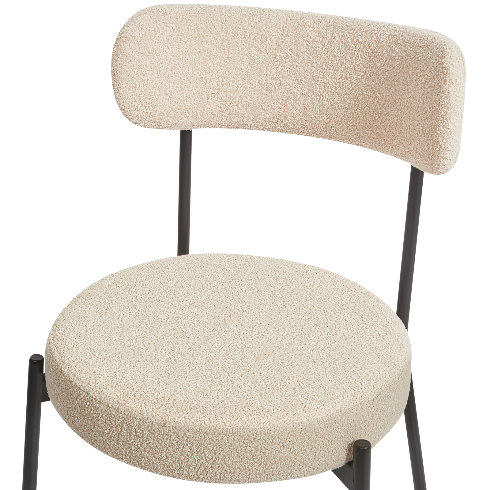 Scaune dining fără cotiere. Aceste scaune elegante pentru dining tapițate cu material boucle bej deschis, oferă o textură plăcută și o senzație de confort la fiecare utilizare. Picioarele subțiri din oțel negru, dotate cu capace de protecție, oferă stabilitate și protejează podeaua, fără a compromite stilul. Fie că servești o cină în familie sau savurezi cafeaua de dimineață, acest set este detaliul care face diferența și transformă orice spațiu într-un loc modern și primitor. Detalii: Tip de Produs: Scaun dining. Stil: Modern. Culoare: Bej. Culoarea cadrului: Negru. Nuanță: Bej deschis. Material: Țesătură. Material primar: Boucle. Material secundar: Oțel. Detalii material picioare: Metal. Material scaun: Țesătură. Compoziția materialului: 100% Poliester. Cotiere: Nu. Finisaj: Opac. Stivuire: Nu. Dimensiuni: Adâncime: 52 cm. Înălțimea scaunului: 44 cm. Lățime: 47 cm. Înălțime: 77 cm. Suprafața de ședere: 44x44 cm. Greutate: 5 kg. Capacitatea de greutate: 120 kg. Oferta incude: 2 x Scaun. Caracteristici cheie: Culori calde și elegante, Se adaptează la orice stil de interior, De înaltă calitate, Excepțional de ușor de întreținut, Capace pentru picioare pentru protecția suprafeței. Asamblare: Necesită asamblare completă.5-15 min. Informații suplimentare: Pentru o stabilitate și siguranță maximă în utilizare, se recomandă să verificați la aproximativ 2 săptămâni după instalare dacă produsul a fost asamblat corect. De asemenea, se recomandă să verificați dacă șuruburile sunt strânse corect, o dată la 3 luni. Sfaturi de întreținere: Boucle: 1.Vă rugăm să curățați cu un șampon uscat și un burete umed sau cu un detergent ușor. 2.Aspirati folosind un accesoriu potrivit. Oțel: 1.Curățați cu un detergent delicat și o cârpă moale, apoi ștergeți bine. 2.Pentru a evita zgârieturile, nu folosiți produse de curățare abrazive. 3.Pentru elementele din cupru sau crom, folosiți un agent de lustruire.