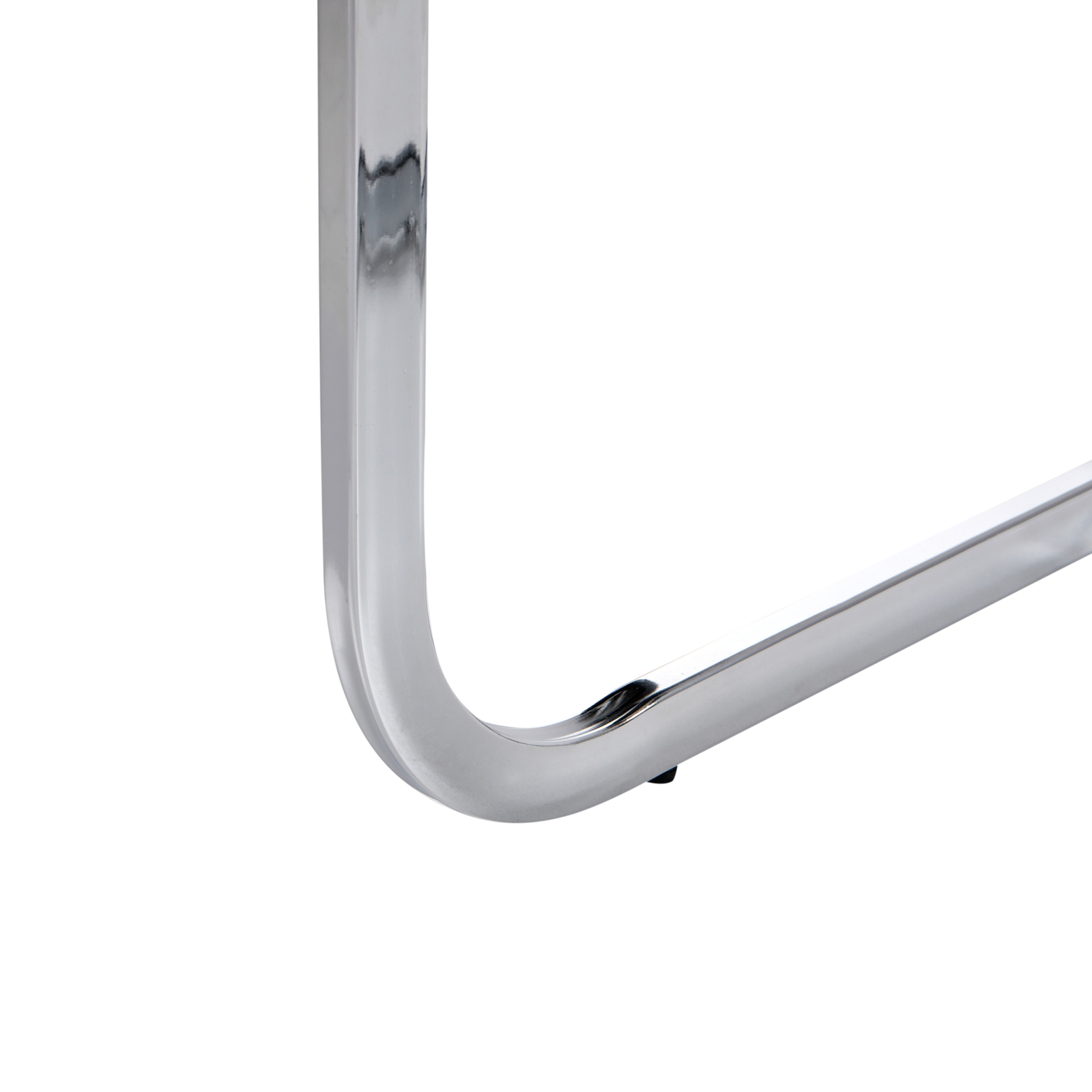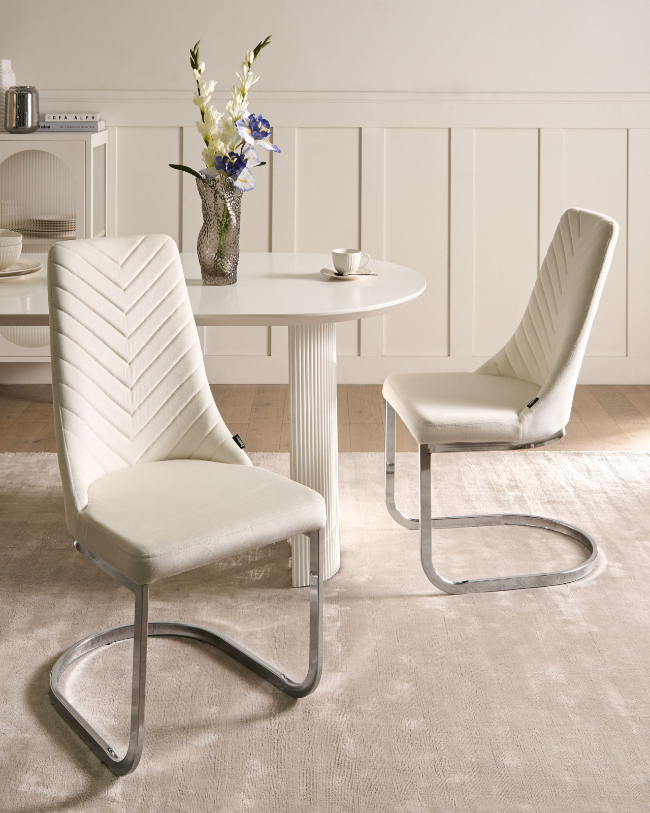 Scaune cantilever cu cadru cromat. Adaugă un aer sofisticat zonei tale de dining sau living cu acest set de două scaune cu spătar înalt. Tapițeria catifelată, într-o nuanță elegantă de alb-murdar, aduce un plus de confort și rafinament, în timp ce cadrul metalic cromat creează un contrast modern și strălucitor. Se integrează perfect alături de mese în nuanțe deschise, completând armonios un decor contemporan, cald și primitor. Ideal pentru cine relaxante sau întâlniri cu cei dragi, într-un ambient cu stil. Detalii: Tip de Produs: Scaun dining. Stil: Glamour. Culoare: Alb. Nuanță: Alb-murdar. Material: Țesătură. Material primar: Catifea. Material secundar: Placaj. Detalii material picioare: Metal. Material scaun: Țesătură. Compoziția materialului: 100% Poliester. Cotiere: Nu. Finisaj: Cromat. Stivuire: Nu. Dimensiuni: Adâncime: 61 cm. Grosimea scaunului: 6 cm. Înălțimea scaunului: 47 cm. Lățime: 46 cm. Înălțime: 96 cm. Suprafața de ședere: 44x46 cm. Greutate: 7 kg. Capacitatea de greutate: 150 kg. Oferta incude: 2 x Scaun. Caracteristici cheie: Confort maxim, Spătar înalt și scaun confortabil, Design elegant, Construcție robustă, Țesătură de catifea netedă și mătăsoasă, Diverse posibilități de combinație, Capace pentru picioare pentru protecția suprafeței. Asamblare: Picioare neasamblate.20-40 min. Informații suplimentare: Pentru o stabilitate și siguranță maximă în utilizare, se recomandă să verificați la aproximativ 2 săptămâni după instalare dacă produsul a fost asamblat corect. De asemenea, se recomandă să verificați dacă șuruburile sunt strânse corect, o dată la 3 luni. Rețineți că țesătura de catifea poate avea un aspect puțin diferit atunci când este expusă la lumină; tinde să fie mai strălucitoare și mai luminoasă în lumina soarelui, în timp ce în lumină artificială are un ton diferit, mai închis. Datorită tipului de țesătură, tonul catifelei poate varia, de asemenea, atunci când este atinsă din direcții diferite. Pentru a uniformiza culoarea și a scăpa de lovituri și cute, materialul trebuie mângâiat cu palma deschisă într-o singură direcție, frecat cu o cârpă umedă sau călcat cu abur. Sfaturi de întreținere: Catifea: 1.Vă rugăm să curățați cu un șampon uscat și un burete umed sau cu un detergent ușor. 2.Aspirati folosind un accesoriu potrivit. Fier: 1.Curățați cu un detergent delicat și o cârpă moale, apoi ștergeți bine. 2.Pentru a evita zgârieturile, nu folosiți produse de curățare abrazive. 3.Pentru elementele din cupru sau crom, folosiți un agent de lustruire.