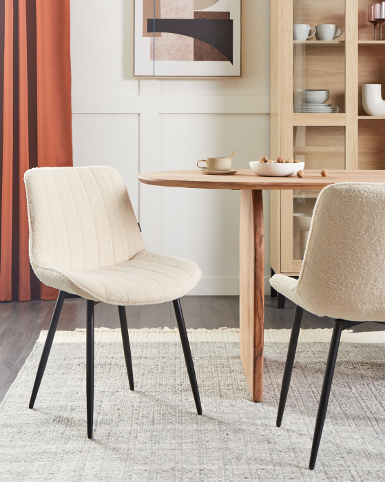 Scaune dining fără cotiere. Transformă-ți zona de dining cu acest set elegant de două scaune, care îmbină confortul cu stilul modern. Tapițeria fină din boucle oferă o senzație plăcută la atingere, iar structura solidă din metal asigură stabilitate și durabilitate. Designul fără brațe și dimensiunile bine gândite le fac ideale pentru utilizarea zilnică, aducând un plus de funcționalitate și rafinament în bucătăria sau sufrageria ta. Detalii: Tip de Produs: Scaun dining. Stil: Retro. Culoare: Bej. Culoarea cadrului: Negru. Nuanță: Bej deschis. Material: Țesătură. Material primar: Boucle. Material secundar: Oțel. Detalii material picioare: Metal. Material scaun: Țesătură. Compoziția materialului: 100% Poliester. Cotiere: Nu. Finisaj: Opac. Stivuire: Nu. Dimensiuni: Adâncime: 58 cm. Înălțimea scaunului: 44 cm. Lățime: 53 cm. Înălțime: 81 cm. Suprafața de ședere: 63x40 cm. Greutate: 6 kg. Capacitatea de greutate: 120 kg. Oferta incude: 2 x Scaun. Caracteristici cheie: Adaugă o notă de eleganță oricărui interior, Stil retro, Tapițerie din țesătură de înaltă calitate, Excepțional de ușor de întreținut, Capace pentru picioare pentru protecția suprafeței. Asamblare: Necesită asamblare parțială.5-15 min. Informații suplimentare: Pentru o stabilitate și siguranță maximă în utilizare, se recomandă să verificați la aproximativ 2 săptămâni după instalare dacă produsul a fost asamblat corect. De asemenea, se recomandă să verificați dacă șuruburile sunt strânse corect, o dată la 3 luni. Sfaturi de întreținere: Boucle: 1.Vă rugăm să curățați cu un șampon uscat și un burete umed sau cu un detergent ușor. 2.Aspirati folosind un accesoriu potrivit. Oțel: 1.Curățați cu un detergent delicat și o cârpă moale, apoi ștergeți bine. 2.Pentru a evita zgârieturile, nu folosiți produse de curățare abrazive. 3.Pentru elementele din cupru sau crom, folosiți un agent de lustruire.
