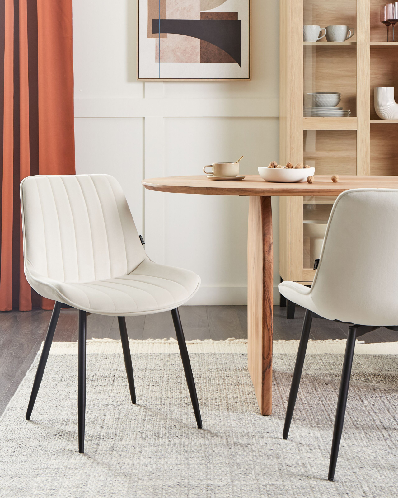 Scaune dining fără cotiere. Transformă-ți zona de dining cu acest set elegant de două scaune, care îmbină confortul cu stilul modern. Tapițeria fină din catifea oferă o senzație plăcută la atingere, iar structura solidă din metal asigură stabilitate și durabilitate. Designul fără brațe și dimensiunile bine gândite le fac ideale pentru utilizarea zilnică, aducând un plus de funcționalitate și rafinament în bucătăria sau sufrageria ta. Detalii: Tip de Produs: Scaun dining. Stil: Retro. Culoare: Bej. Culoarea cadrului: Negru. Nuanță: Bej deschis. Material: Țesătură. Material primar: Catifea. Material secundar: Oțel. Detalii material picioare: Metal. Material scaun: Țesătură. Compoziția materialului: 100% Poliester. Cotiere: Nu. Finisaj: Opac. Stivuire: Nu. Dimensiuni: Adâncime: 58 cm. Înălțimea scaunului: 44 cm. Lățime: 53 cm. Înălțime: 81 cm. Suprafața de ședere: 63x40 cm. Greutate: 6 kg. Capacitatea de greutate: 120 kg. Oferta incude: 2 x Scaun. Caracteristici cheie: Adaugă o notă de eleganță oricărui interior, Stil retro, Tapițerie din țesătură de înaltă calitate, Excepțional de ușor de întreținut, Capace pentru picioare pentru protecția suprafeței. Asamblare: Necesită asamblare parțială.5-15 min. Informații suplimentare: Pentru o stabilitate și siguranță maximă în utilizare, se recomandă să verificați la aproximativ 2 săptămâni după instalare dacă produsul a fost asamblat corect. De asemenea, se recomandă să verificați dacă șuruburile sunt strânse corect, o dată la 3 luni. Rețineți că țesătura de catifea poate avea un aspect puțin diferit atunci când este expusă la lumină; tinde să fie mai strălucitoare și mai luminoasă în lumina soarelui, în timp ce în lumină artificială are un ton diferit, mai închis. Datorită tipului de țesătură, tonul catifelei poate varia, de asemenea, atunci când este atinsă din direcții diferite. Pentru a uniformiza culoarea și a scăpa de lovituri și cute, materialul trebuie mângâiat cu palma deschisă într-o singură direcție, frecat cu o cârpă umedă sau călcat cu abur. Sfaturi de întreținere: Catifea: 1.Vă rugăm să curățați cu un șampon uscat și un burete umed sau cu un detergent ușor. 2.Aspirati folosind un accesoriu potrivit. Oțel: 1.Curățați cu un detergent delicat și o cârpă moale, apoi ștergeți bine. 2.Pentru a evita zgârieturile, nu folosiți produse de curățare abrazive. 3.Pentru elementele din cupru sau crom, folosiți un agent de lustruire.