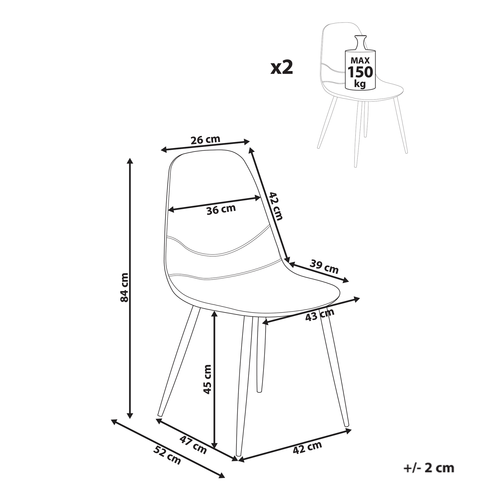 Set de 2 scaune de dining din țesătură de velur. Îmbunătățește-ți zona de dining cu acest set de 2 scaune moderne, care combină stilul și confortul. Tapițate cu velur cu dungi verticale, oferă un șezut moale și texturat. Spătarul curbat și șezutul căptușit îți garantează confort pe parcursul meselor. Picioarele din fier cu finisaj de lemn se integrează perfect în orice decor, iar capacele antiderapante protejează podeaua. Perfecte pentru dining, colțuri de bucătărie sau spații moderne. Detalii: Tip de Produs: Scaun dining. Stil: Scandinav. Culoare: Alb. Culoarea cadrului: Maro. Nuanță: Maro deschis. Material: Țesătură. Material primar: Velur. Material secundar: Fier. Detalii material picioare: Metal. Material scaun: Țesătură. Compoziția materialului: 100% Poliester. Cotiere: Nu. Finisaj: Transfer de căldură. Stivuire: Nu. Dimensiuni: Adâncime: 52 cm. Înălțimea scaunului: 45 cm. Lățime: 43 cm. Înălțime: 84 cm. Suprafața de ședere: 39x43 cm. Greutate: 5 kg. Capacitatea de greutate: 150 kg. Oferta incude: 2 x Scaun. Caracteristici cheie: Stil minimalist scandinav, Piesă cu accent atrăgător, Tapițerie din țesătură de înaltă calitate, Material ușor, dar durabil, Capace pentru picioare pentru protecția suprafeței. Asamblare: Necesită asamblare parțială.5-15 min. Informații suplimentare: Acest produs este realizat din velur, caracterizat prin striațiile sale specifice. Prin urmare, atunci când comandați articole individuale, vă rugăm să vă asigurați că direcția materialului se aliniază pentru a menține consistența în aspect. Sfaturi de întreținere: Țesătură: 1.Vă rugăm să curățați cu un șampon uscat și un burete umed sau cu un detergent ușor. 2.Aspirati folosind un accesoriu potrivit. Fier: 1.Curățați cu un detergent delicat și o cârpă moale, apoi ștergeți bine. 2.Pentru a evita zgârieturile, nu folosiți produse de curățare abrazive. 3.Pentru elementele din cupru sau crom, folosiți un agent de lustruire.