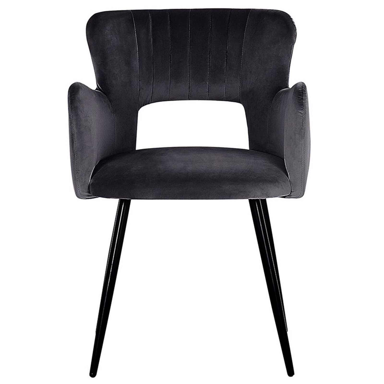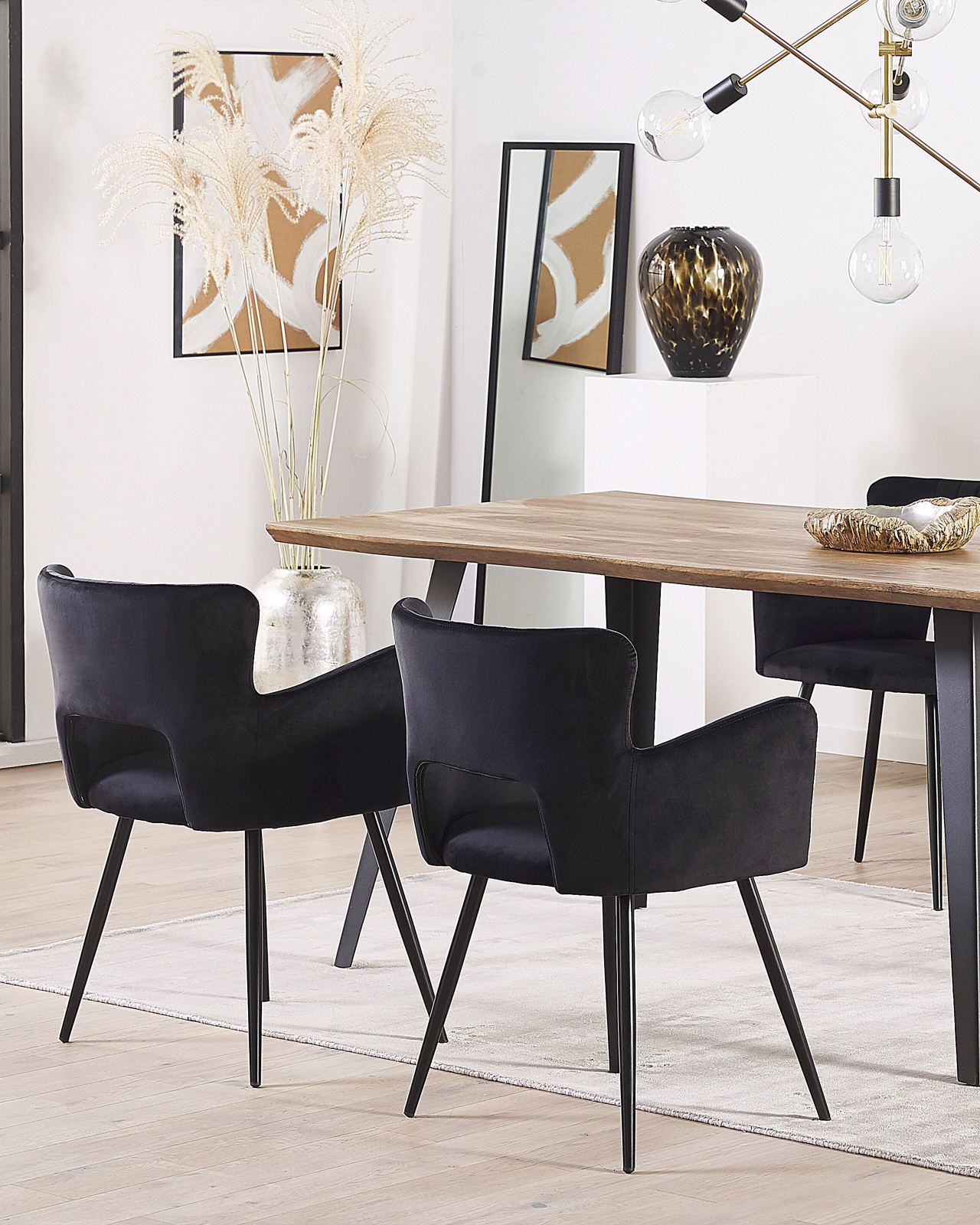Set de 2 scaune tapițate cu cotiere. Acest set de scaune îmbină perfect stilul retro cu designul modern, oferind un plus de eleganță și confort oricărei încăperi. Cu un șezut căptușit, cotiere confortabile și un spătar cu detaliu decupat, acesta este ideal pentru relaxare. Tapițeria din catifea fină adâncește culoarea, iar picioarele metalice negre, completează aspectul sofisticat. Perfecte pentru masa de dining, birou sau dormitor, aceste scaune aduc un aer rafinat și plin de stil în orice spațiu. Detalii: Tip de Produs: Scaun dining. Stil: Modern. Culoare: Negru. Material: Țesătură. Material primar: Catifea. Material secundar: Fier. Detalii material picioare: Metal. Material scaun: Țesătură. Compoziția materialului: 100% Poliester. Cotiere: Da. Finisaj: Acoperire pulverizată. Stivuire: Nu. Dimensiuni: Înălțimea cotierei: 64 cm. Adâncime: 44 cm. Grosimea scaunului: 4 cm. Înălțimea scaunului: 43 cm. Lățime: 52 cm. Înălțime: 75 cm. Suprafața de ședere: 43x44 cm. Greutate: 6 kg. Capacitatea de greutate: 120 kg. Oferta incude: 2 x Scaun. Caracteristici cheie: Cotiere confortabile, Suprafață de șezut largă și confortabilă, Design mereu actualizat, Finisaje fine, Țesătură de catifea netedă și mătăsoasă, Capace pentru picioare pentru protecția suprafeței. Asamblare: Picioare neasamblate.20-40 min. Informații suplimentare: Pentru o stabilitate și siguranță maximă în utilizare, se recomandă să verificați la aproximativ 2 săptămâni după instalare dacă produsul a fost asamblat corect. De asemenea, se recomandă să verificați dacă șuruburile sunt strânse corect, o dată la 3 luni. Rețineți că țesătura de catifea poate avea un aspect puțin diferit atunci când este expusă la lumină; tinde să fie mai strălucitoare și mai luminoasă în lumina soarelui, în timp ce în lumină artificială are un ton diferit, mai închis. Datorită tipului de țesătură, tonul catifelei poate varia, de asemenea, atunci când este atinsă din direcții diferite. Pentru a uniformiza culoarea și a scăpa de lovituri și cute, materialul trebuie mângâiat cu palma deschisă într-o singură direcție, frecat cu o cârpă umedă sau călcat cu abur. Sfaturi de întreținere: Catifea: 1.Vă rugăm să curățați cu un șampon uscat și un burete umed sau cu un detergent ușor. 2.Aspirati folosind un accesoriu potrivit. Fier: 1.Curățați cu un detergent delicat și o cârpă moale, apoi ștergeți bine. 2.Pentru a evita zgârieturile, nu folosiți produse de curățare abrazive. 3.Pentru elementele din cupru sau crom, folosiți un agent de lustruire.
