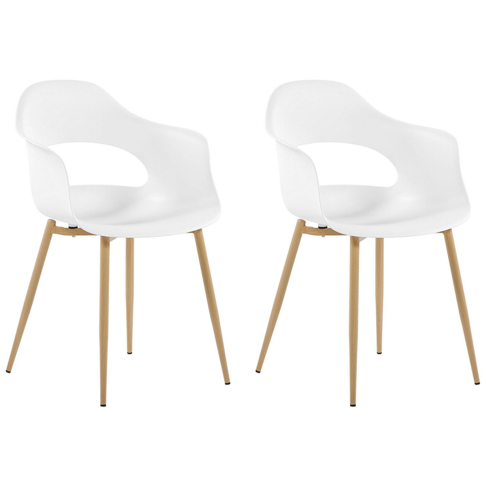Set de 2 scaune de dining. Dacă îți dorești un dining modern cu un accent scandinav, acest set de scaune este alegerea perfectă. Ideal pentru o bucătărie spațioasă sau living, scaunele vor arăta excelent alături de o masă pătrată, creând un colț perfect pentru mic dejun. Structura din material sintetic asigură durabilitate și menține culoarea albă vibrantă pe termen lung, în timp ce picioarele metalice cu finisaj lemnos adaugă o notă de eleganță minimalistă. Detalii: Tip de Produs: Scaun dining. Stil: Modern. Culoare: Alb. Material: Material sintetic. Material primar: Material sintetic. Material secundar: Metal. Detalii material picioare: Metal. Material scaun: Material sintetic. Cotiere: Da. Finisaj: Opac. Stivuire: Nu. Dimensiuni: Înălțimea cotierei: 67 cm. Adâncime: 47 cm. Înălțimea scaunului: 44 cm. Lățime: 54 cm. Înălțime: 81 cm. Suprafața de ședere: 40x39 cm. Greutate: 5 kg. Capacitatea de greutate: 150 kg. Oferta incude: 2 x Scaun. Caracteristici cheie: Cotiere confortabile, Confort maxim, Foarte chic, Construcție solidă și stabilă, Materiale de cea mai bună calitate, Diverse posibilități de combinație, Capace pentru picioare pentru protecția suprafeței. Asamblare: Picioare neasamblate.20-40 min. Informații suplimentare: Pentru o stabilitate și siguranță maximă în utilizare, se recomandă să verificați la aproximativ 2 săptămâni după instalare dacă produsul a fost asamblat corect. De asemenea, se recomandă să verificați dacă șuruburile sunt strânse corect, o dată la 3 luni. Sfaturi de întreținere: Material sintetic: 1.Curățați cu un detergent delicat și o cârpă moale, apoi ștergeți bine. Metal: 1.Curățați cu un detergent delicat și o cârpă moale, apoi ștergeți bine. 2.Pentru a evita zgârieturile, nu folosiți produse de curățare abrazive. 3.Pentru elementele din cupru sau crom, folosiți un agent de lustruire.