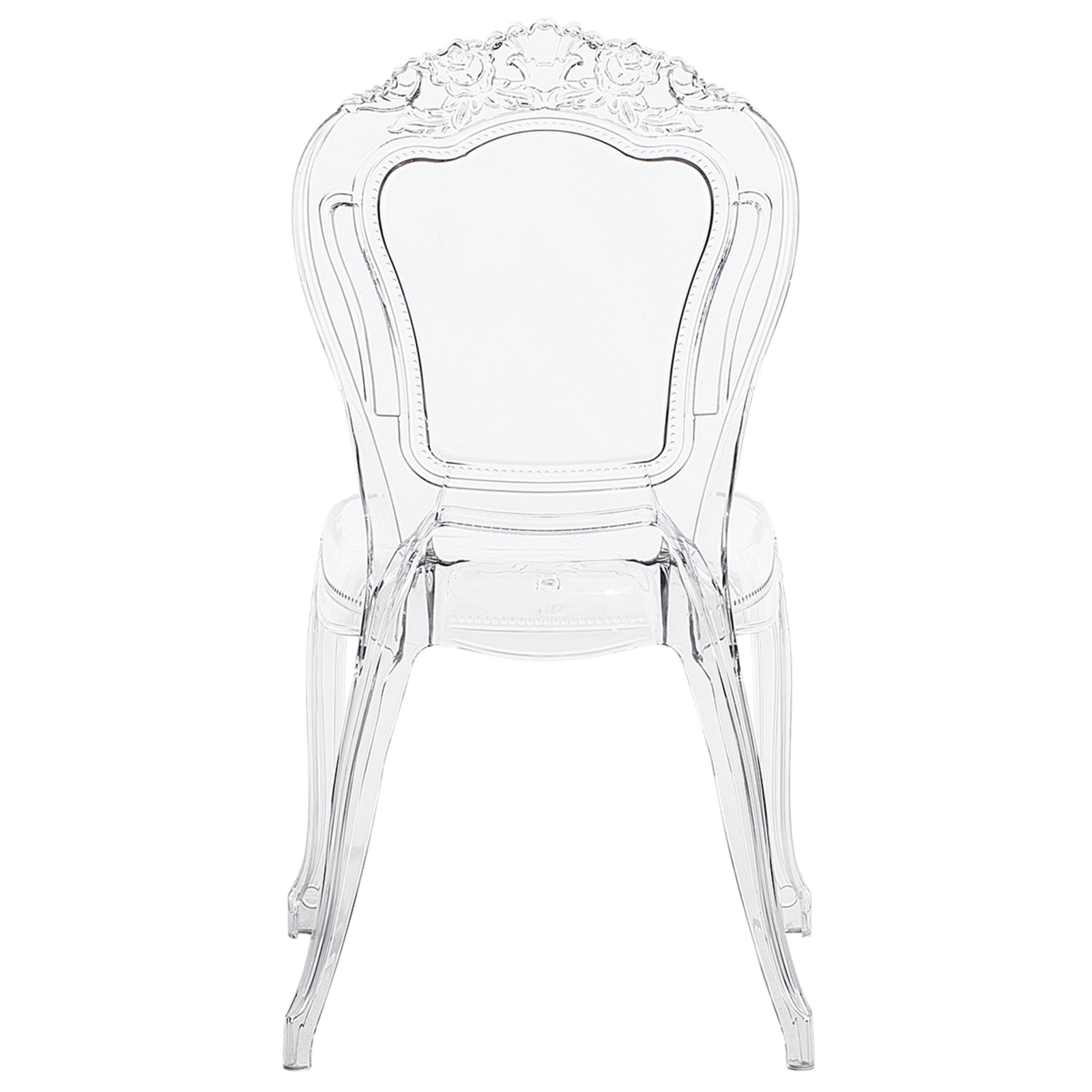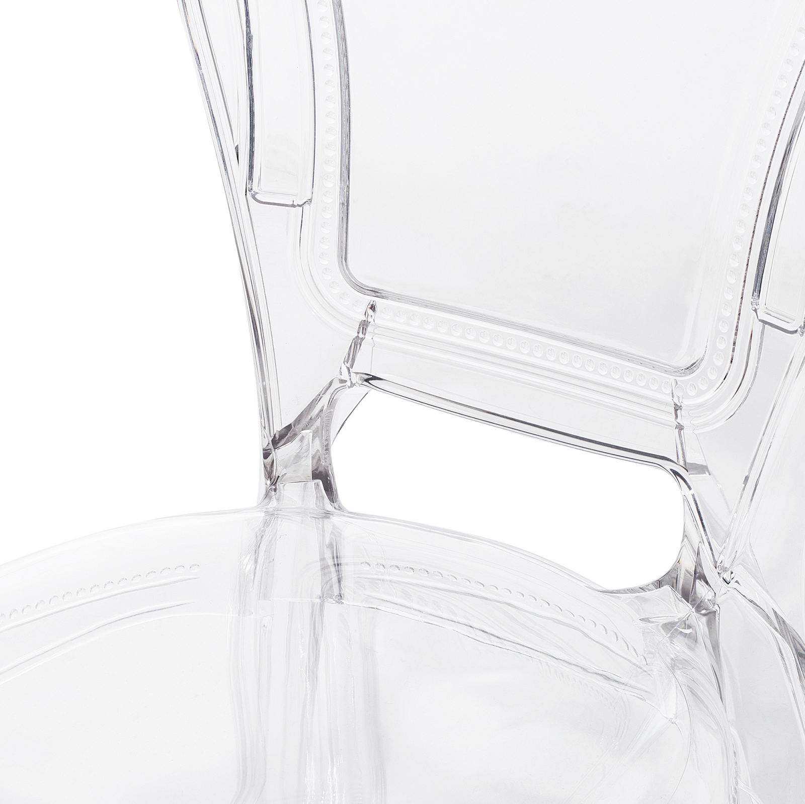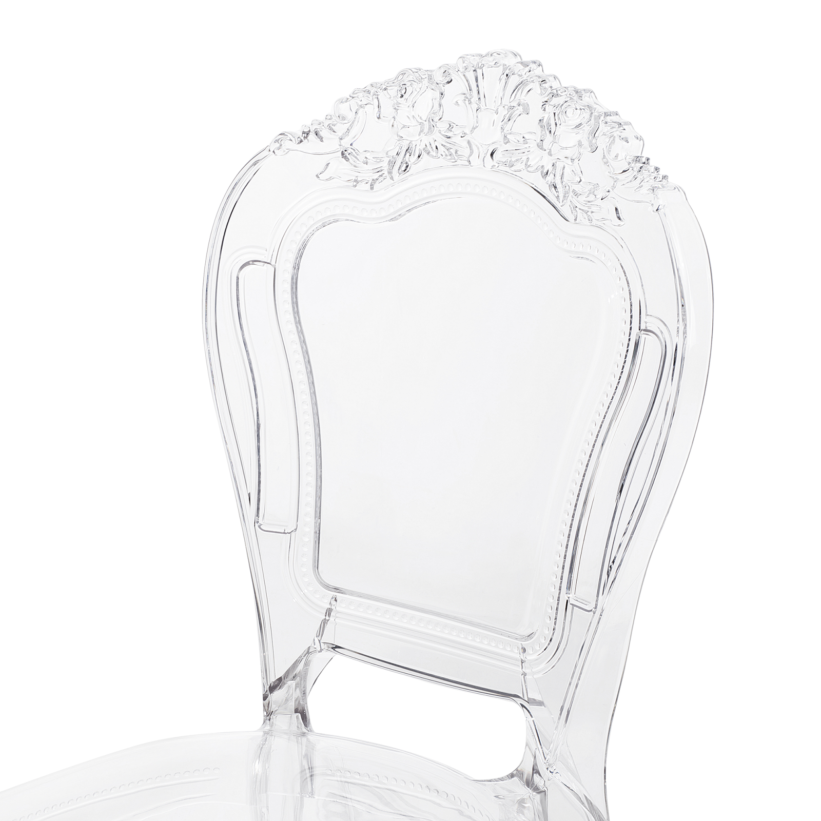 Scaune vintage în stil provensal. O interpretare deosebită a stilului clasic provensal, aceste scaune aduc un plus de personalitate în orice camera de dining sau living. Realizate din acril de calitate superioară, combină durabilitatea cu un aspect aerisit. Materialul translucid și ornamentele elegante adaugă stil, făcând aceste piese alegerea ideală pentru un interior contemporan sau vintage. Detalii: Tip de Produs: Scaun de banchet. Stil: Glamour. Culoare: Transparent. Culoarea cadrului: Transparent. Material: Material sintetic. Material primar: Policarbonat. Detalii material picioare: Material sintetic. Material scaun: Material sintetic. Cotiere: Nu. Finisaj: Lucios. Stivuire: Da. Dimensiuni: Adâncime: 52 cm. Înălțimea scaunului: 45 cm. Lățime: 52 cm. Înălțime: 98 cm. Suprafața de ședere: 43x42/44 cm. Greutate: 5 kg. Capacitatea de greutate: 150 kg. Oferta incude: 2 x Scaun. Caracteristici cheie: Design mereu actualizat, Mobilier decorativ și funcțional, De înaltă calitate, Ușor de curățat, Capace pentru picioare pentru protecția suprafeței, Compact și stivuibil, Bază stabilă și durabilă. Asamblare: Nu necesită asamblare. Sfaturi de întreținere: Policarbonat: 1.Curățați cu un detergent delicat și o cârpă moale, apoi ștergeți bine.