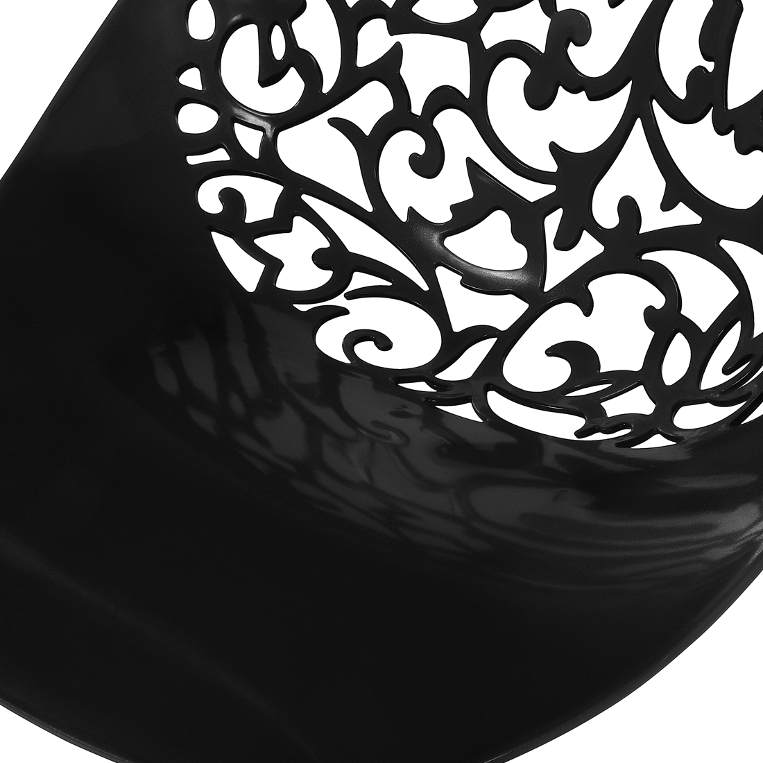 Scaune sintetice cu spătar decupat. Acest set modern de patru scaune aduce un plus de stil și confort în orice încăpere. Picioarele subțiri din metal cromat asigură stabilitate, iar spătarele negre cu model floral decupat oferă un design elegant și aerisit. Cu șezut confortabil și înălțime universală, aceste piese sunt ideale pentru sufragerie, bucătărie sau birou, transformând fiecare moment petrecut acolo într-o experiență plăcută și rafinată. Detalii: Tip de Produs: Scaun dining. Stil: Modern. Culoare: Negru. Culoarea cadrului: Negru. Material: Material sintetic. Material primar: Material sintetic. Material secundar: Metal. Detalii material picioare: Metal. Material scaun: Material sintetic. Cotiere: Nu. Finisaj: Cromat. Stivuire: Da. Dimensiuni: Adâncime: 43 cm. Înălțimea scaunului: 42 cm. Lățime: 62 cm. Înălțime: 80 cm. Suprafața de ședere: 50x42 cm. Greutate: 4 kg. Capacitatea de greutate: 100 kg. Oferta incude: 4 x Scaun. Caracteristici cheie: Se potrivește perfect în bucătărie sau în sufragerie, Culori elegante și la modă, Se integrează practic cu orice stil de amenajare, Ușor de curățat, Capace pentru picioare pentru protecția suprafeței, Ușor de păstrat datorită posibilității de stivuire. Asamblare: Necesită asamblare parțială.20-40 min. Informații suplimentare: Pentru o stabilitate și siguranță maximă în utilizare, se recomandă să verificați la aproximativ 2 săptămâni după instalare dacă produsul a fost asamblat corect. De asemenea, se recomandă să verificați dacă șuruburile sunt strânse corect, o dată la 3 luni. Sfaturi de întreținere: Material sintetic: 1.Curățați cu un detergent delicat și o cârpă moale, apoi ștergeți bine. Metal: 1.Curățați cu un detergent delicat și o cârpă moale, apoi ștergeți bine. 2.Pentru a evita zgârieturile, nu folosiți produse de curățare abrazive. 3.Pentru elementele din cupru sau crom, folosiți un agent de lustruire.