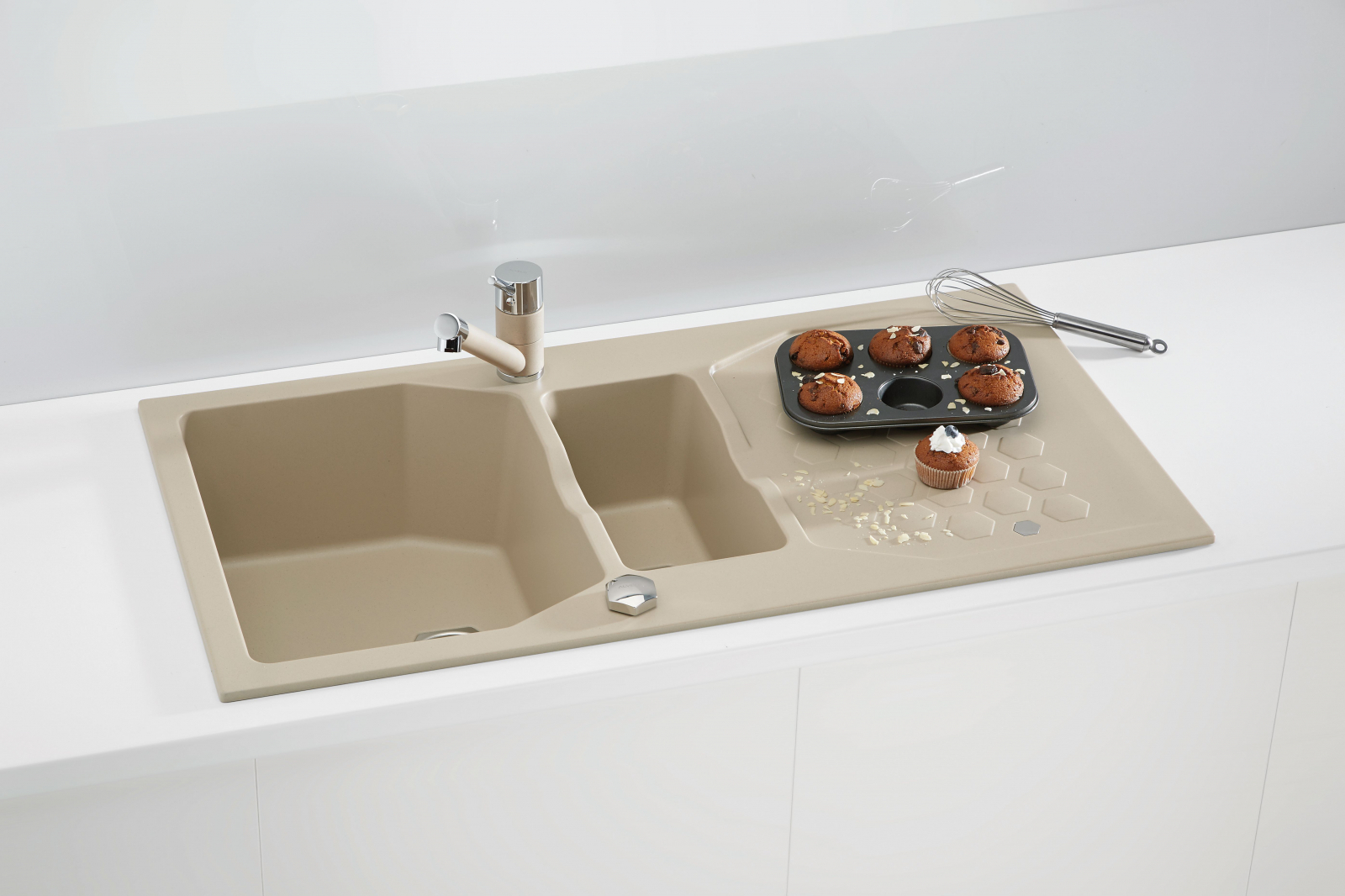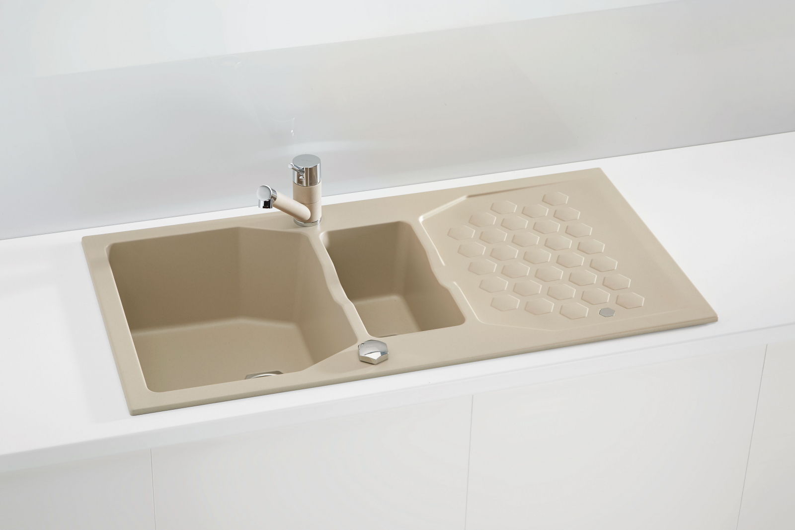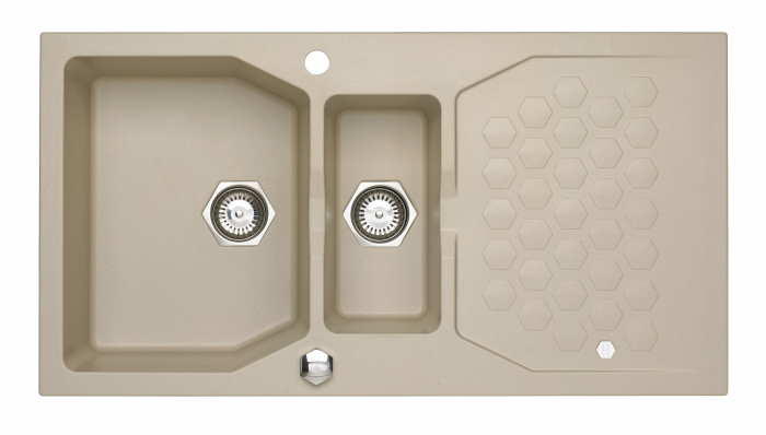 Chiuveta Alveus compozit   Sensual 70   Alveus Sensual 70  este o chiuveta de bucatarie realizata din material compozit, granital. Este formata din doua  cuve, prevazuta cu picurator si are dimensiunea totala de 98 x 52 cm.  Acest model de chiuveta Alveus este conceput pentru montajul pe blatul de bucatarie (incastrabil), fiind parte continua a suprafetei de lucru.  Chiuveta   Sensual 70  are o forma dreptunghiulara, cu dimensiunea cuvelor  de 35 x 45 x 20 cm   16.5 x 34 x 16 cm , potrivite pentru spalarea vaselor de orice dimensiune. Aceasta chiuveta este confectionata dintr-un amestec compozit de calitate superioara, numit granital. Datorita procesarii atente a materialului, suprafata chiuvetei de bucatarie este neteda, placuta la atingere si permite o curatare usoara. In plus, ii ofera si alte avantaje, cum ar fi: rezistenta la temperaturi inalte, la utilizare intensa, rezistenta maxima la socuri termice si mecanice, nu se fisureaza si nu se zgarie.  Chiuveta vine insotita cu urmatoarele accesorii:  sifon cu pop up;  ventil de 3 1 2  ;  sistem de prindere.