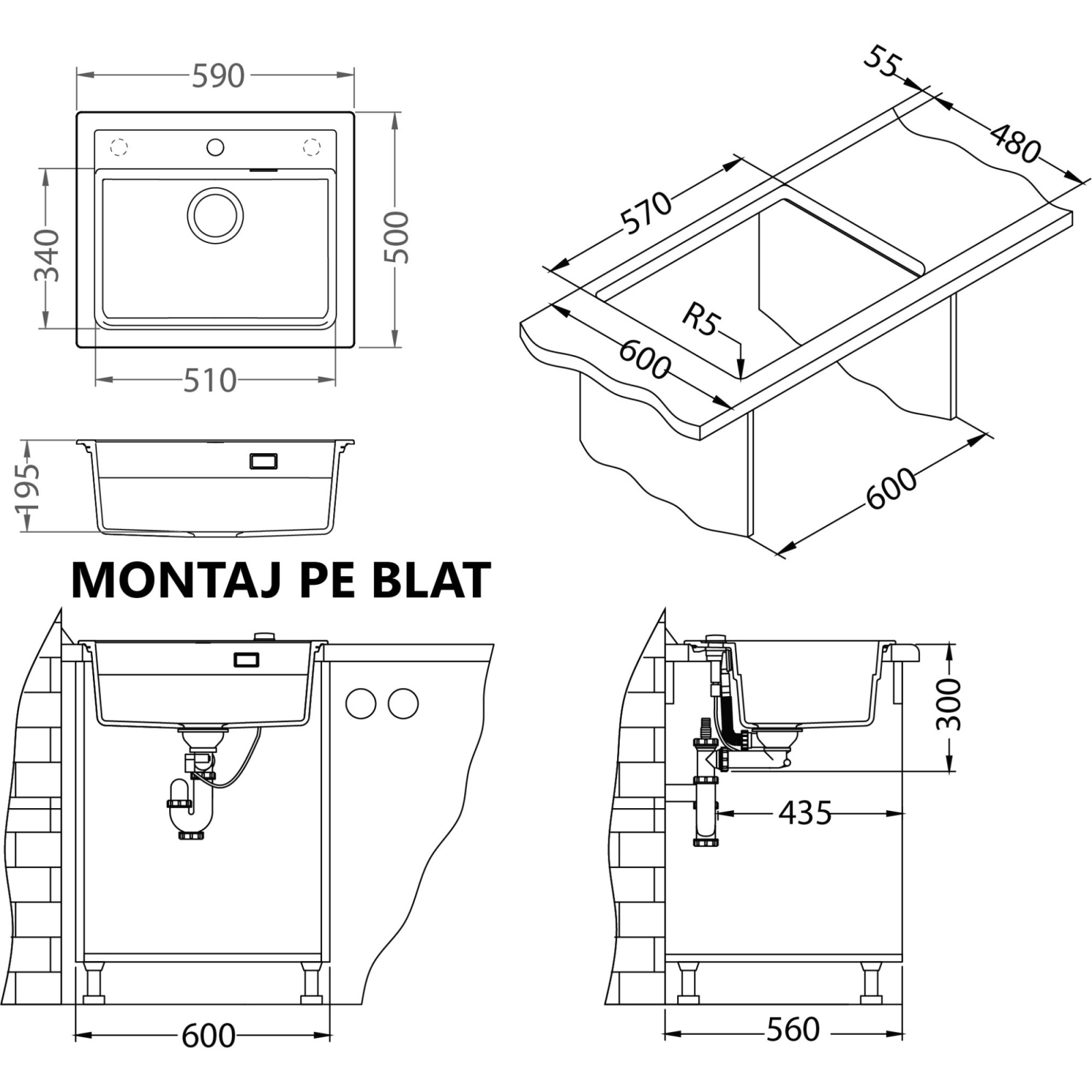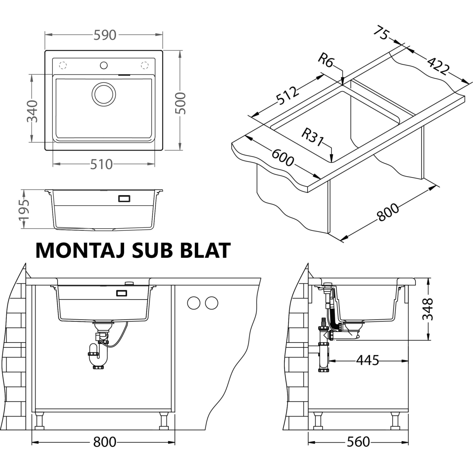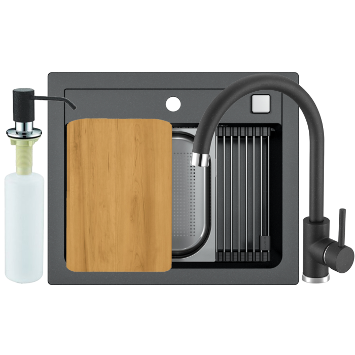 Pachetul este compus din - chiuveta , baterie , dozator detergent , tocator , sita , sifon cu pop up