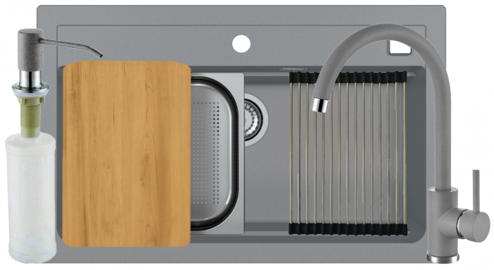Pachetul este compus din - chiuveta , baterie , dozator detergent , tocator , sita , sifon cu pop up