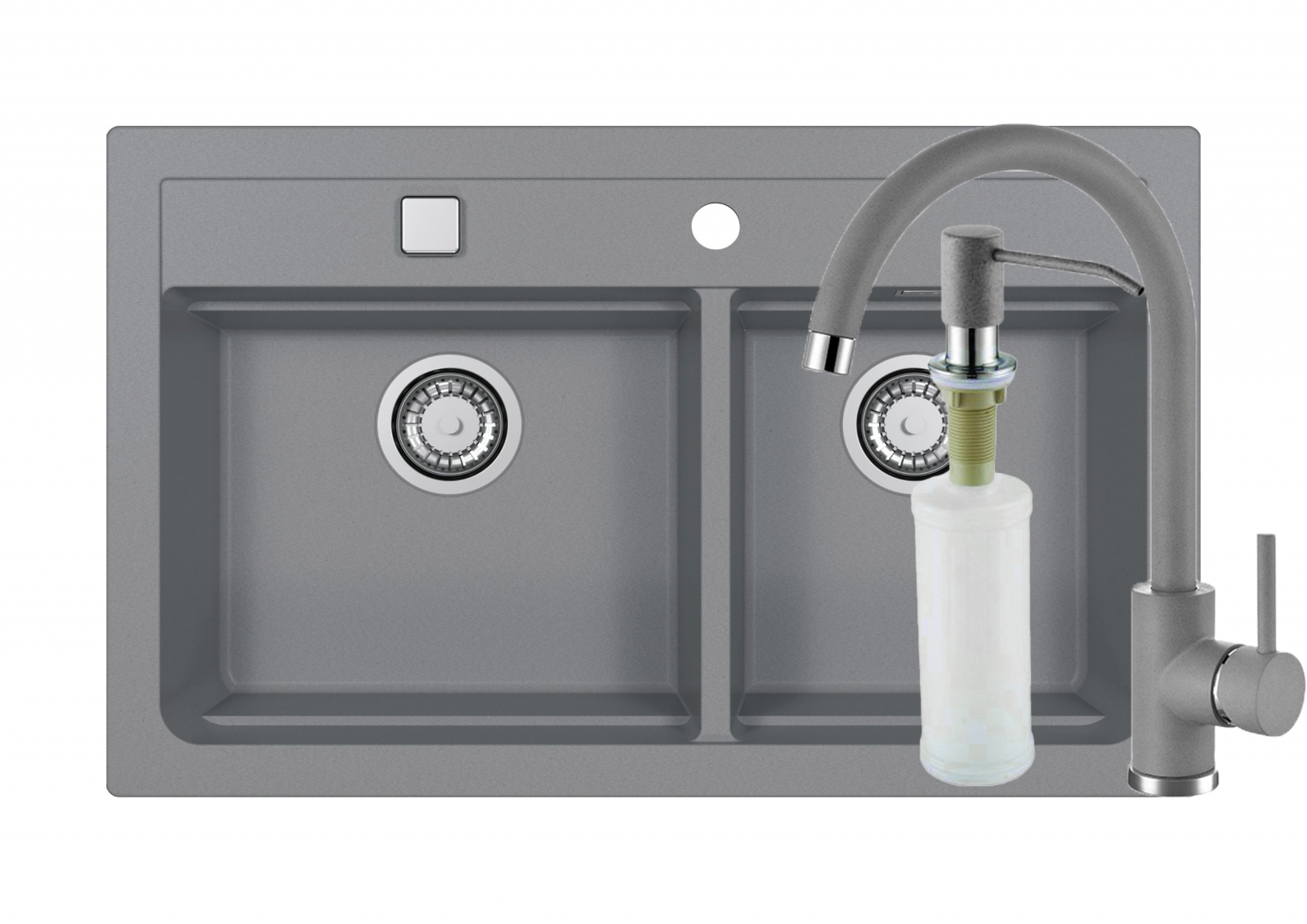 Pachet Alveus  Atrox 50  si baterie   Jana (Accesorii incluse)    Alveus Atrox 50    este o chiuveta de bucatarie realizata din material compozit, granital. Este formata din doua cuve, nu este prevazuta cu picurator si are dimensiunea totala de 79 x 50 cm.  Acest model de chiuveta Alveus este conceput pentru montajul pe blatul de bucatarie (incastrabil) sau sub blat, fiind parte continua a suprafetei de lucru.  Culorile disponibile sunt alb,bej,gri,negru  ce ofera un contrast placut bucatariei dumneavoastra.  Chiuveta   Alveus Atrox 50  are o forma dreptunghiulara, cu doua cuve generoase, cu dimensiunile de 39 x 34 x 19.5 cm   30 x 34 x 19.5 cm, potrivite pentru spalarea vaselor de dimensiuni mari. Aceasta chiuveta este confectionata dintr-un amestec compozit de calitate superioara, numit granital. Datorita procesarii atente a materialului, suprafata chiuvetei de bucatarie este neteda, placuta la atingere si permite o curatare usoara. In plus, ii ofera si alte avantaje, cum ar fi: rezistenta la temperaturi inalte, la utilizare intensa, rezistenta maxima la socuri termice si mecanice, nu se fisureaza si nu se zgarie.   Chiuveta vine insotita cu urmatoarele accesorii:   sifon cu pop up;   ventil de 3 1 2  ;   sistem de prindere.   Alveus Jana   este o baterie pentru chiuvetele de bucatarie, ce dispune de un design elegant, ce se potriveste atat in bucatariile traditionale, precum si in cele moderne, completand functional spatiul in care gatiti si serviti masa. Aceasta este realizata din material   alama   si este disponibila in culorile alb,bej,gri,negru.  Bateria are robinet de tip   monocomanda   si   cartus ceramic   ce  asigura o functionare fiabila  si durata lunga de viata;  pipa este   inalta   si mobila (cu rotatie 360 º), astfel incat sa se adapteze nevoilor dumneavoastra.  Dimensiunile acesteia sunt: 20.3 cm latime si 34 cm inaltime. Aceasta baterie Alveus poate fi montata pe chiuveta sau pe blatul de bucatarie si vine insotita de sistem prindere si racorduri flexibile.  Intretinere:    curatati componentele in mod regulat, pentru a preveni acumularea de murdarie. Curatarea bateriei se va realiza doar cu un detergent neutru, neabraziv. Clatiti componentele cu apa si stergeti-le cu o carpa moale