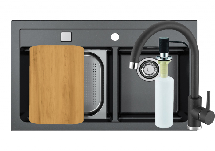 Pachet Alveus Atrox 50 si baterie Jana (Accesorii incluse) Alveus Atrox 50 este o chiuveta de bucatarie realizata din material compozit, granital. Este formata din doua cuve, nu este prevazuta cu picurator si are dimensiunea totala de 79 x 50 cm. Acest model de chiuveta Alveus este conceput pentru montajul pe blatul de bucatarie (incastrabil) sau sub blat, fiind parte continua a suprafetei de lucru. Culorile disponibile sunt alb,bej,gri,negru ce ofera un contrast placut bucatariei dumneavoastra. Chiuveta Alveus Atrox 50 are o forma dreptunghiulara, cu doua cuve generoase, cu dimensiunile de 39 x 34 x 19.5 cm 30 x 34 x 19.5 cm, potrivite pentru spalarea vaselor de dimensiuni mari. Aceasta chiuveta este confectionata dintr-un amestec compozit de calitate superioara, numit granital. Datorita procesarii atente a materialului, suprafata chiuvetei de bucatarie este neteda, placuta la atingere si permite o curatare usoara. In plus, ii ofera si alte avantaje, cum ar fi: rezistenta la temperaturi inalte, la utilizare intensa, rezistenta maxima la socuri termice si mecanice, nu se fisureaza si nu se zgarie. Chiuveta vine insotita cu urmatoarele accesorii: sifon cu pop up; ventil de 3 1 2 ; sistem de prindere. Alveus Jana este o baterie pentru chiuvetele de bucatarie, ce dispune de un design elegant, ce se potriveste atat in bucatariile traditionale, precum si in cele moderne, completand functional spatiul in care gatiti si serviti masa. Aceasta este realizata din material alama si este disponibila in culorile alb,bej,gri,negru. Bateria are robinet de tip monocomanda si cartus ceramic ce asigura o functionare fiabila si durata lunga de viata; pipa este inalta si mobila (cu rotatie 360 º), astfel incat sa se adapteze nevoilor dumneavoastra. Dimensiunile acesteia sunt: 20.3 cm latime si 34 cm inaltime. Aceasta baterie Alveus poate fi montata pe chiuveta sau pe blatul de bucatarie si vine insotita de sistem prindere si racorduri flexibile. Intretinere: curatati componentele in mod regulat, pentru a preveni acumularea de murdarie. Curatarea bateriei se va realiza doar cu un detergent neutru, neabraziv. Clatiti componentele cu apa si stergeti-le cu o carpa moale